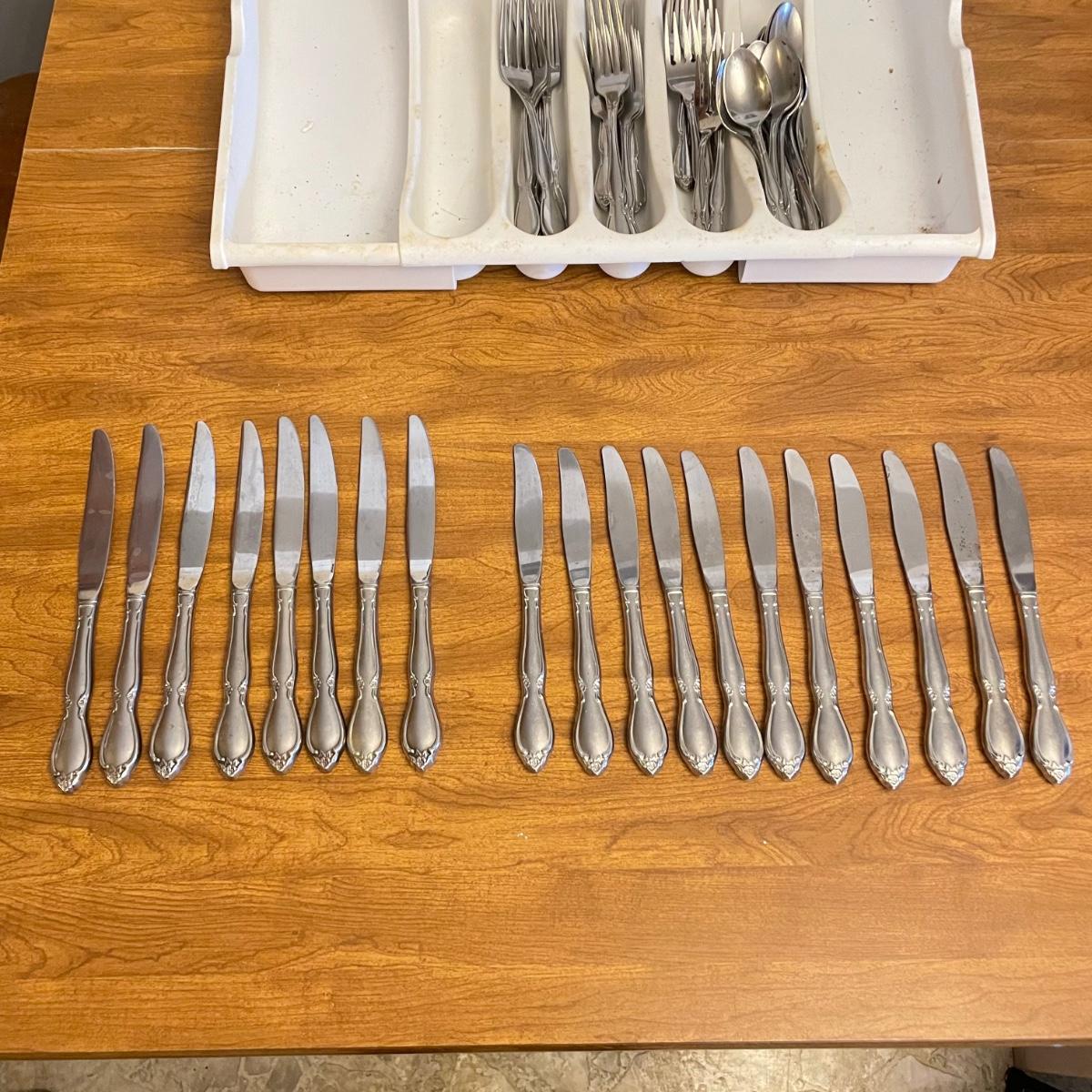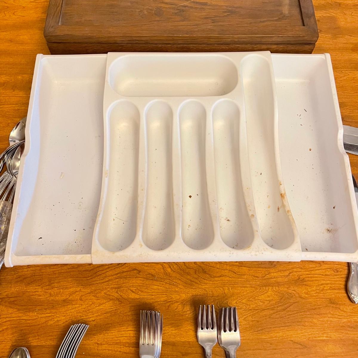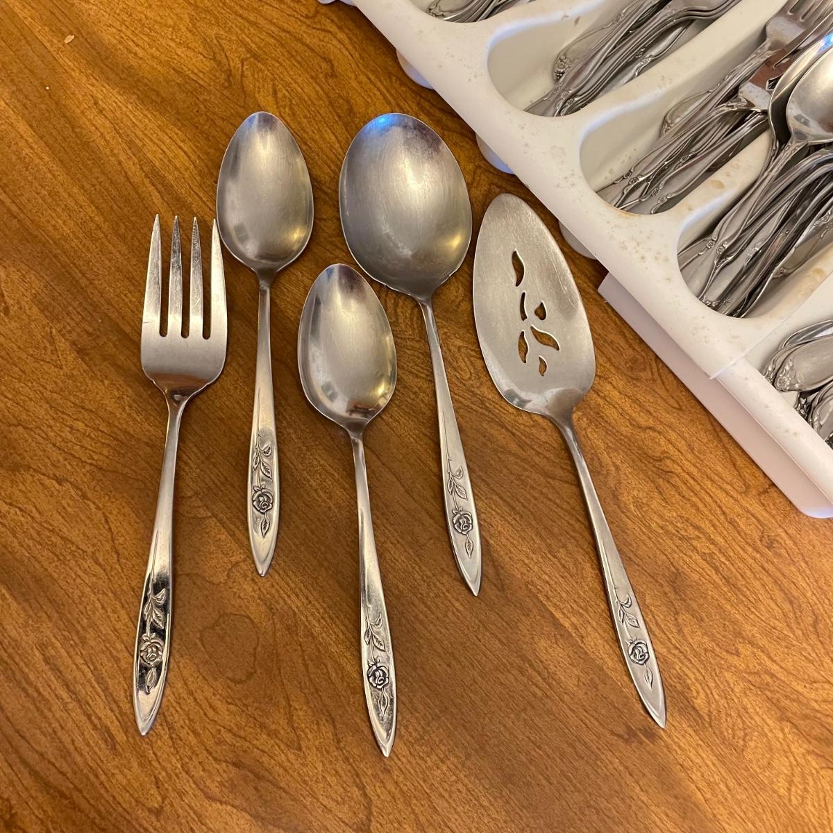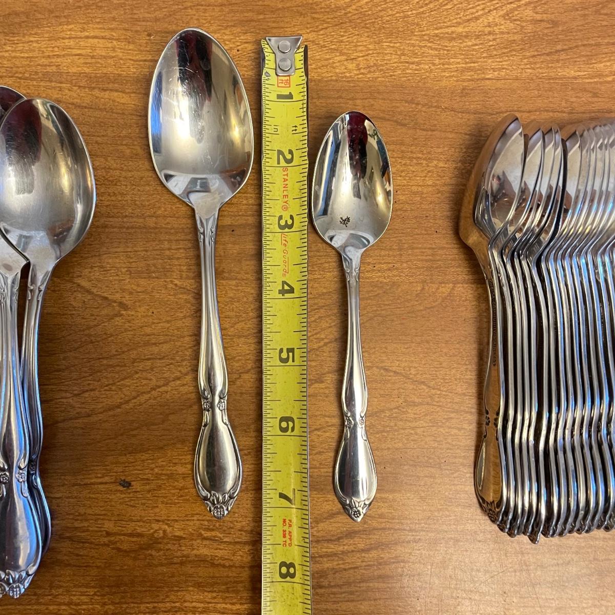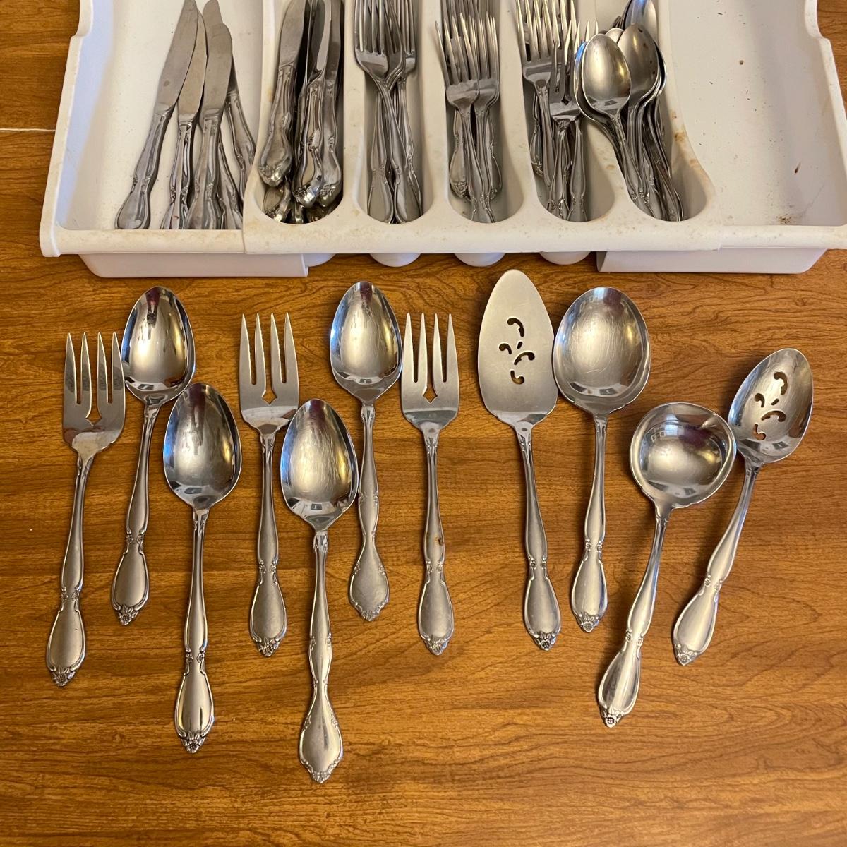 Large set of Oneida Cutlery, plus serving utensils and wooden case. Lot includes eight large dinner knives and eleven smaller dinner knives, eight dessert forks, eleven salad forks, and eight entree forks. There are twenty-six coffee/dessert spoons and twelve soup spoons. Additionally, there are eleven large and six smaller matching serving utensils, plus five more larger servers with large roses on the handles. See images. Box measures 19” x 12.5” x 3.75”. Plastic drawer liner has two separate sides to adjust width. Items should be cleaned before use. Local pick up only.