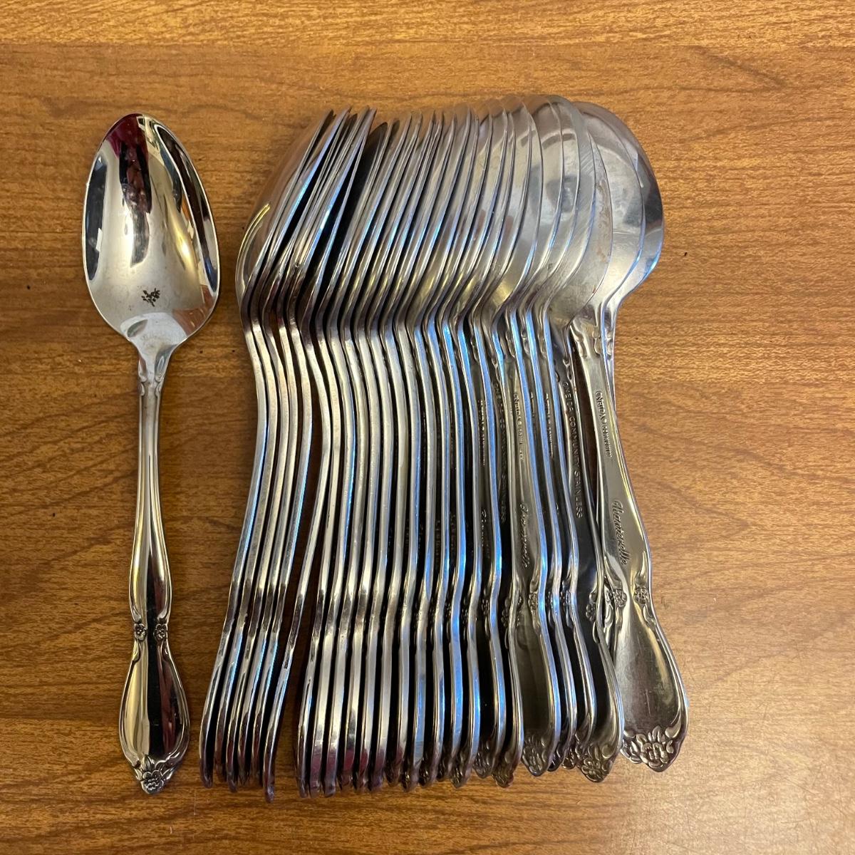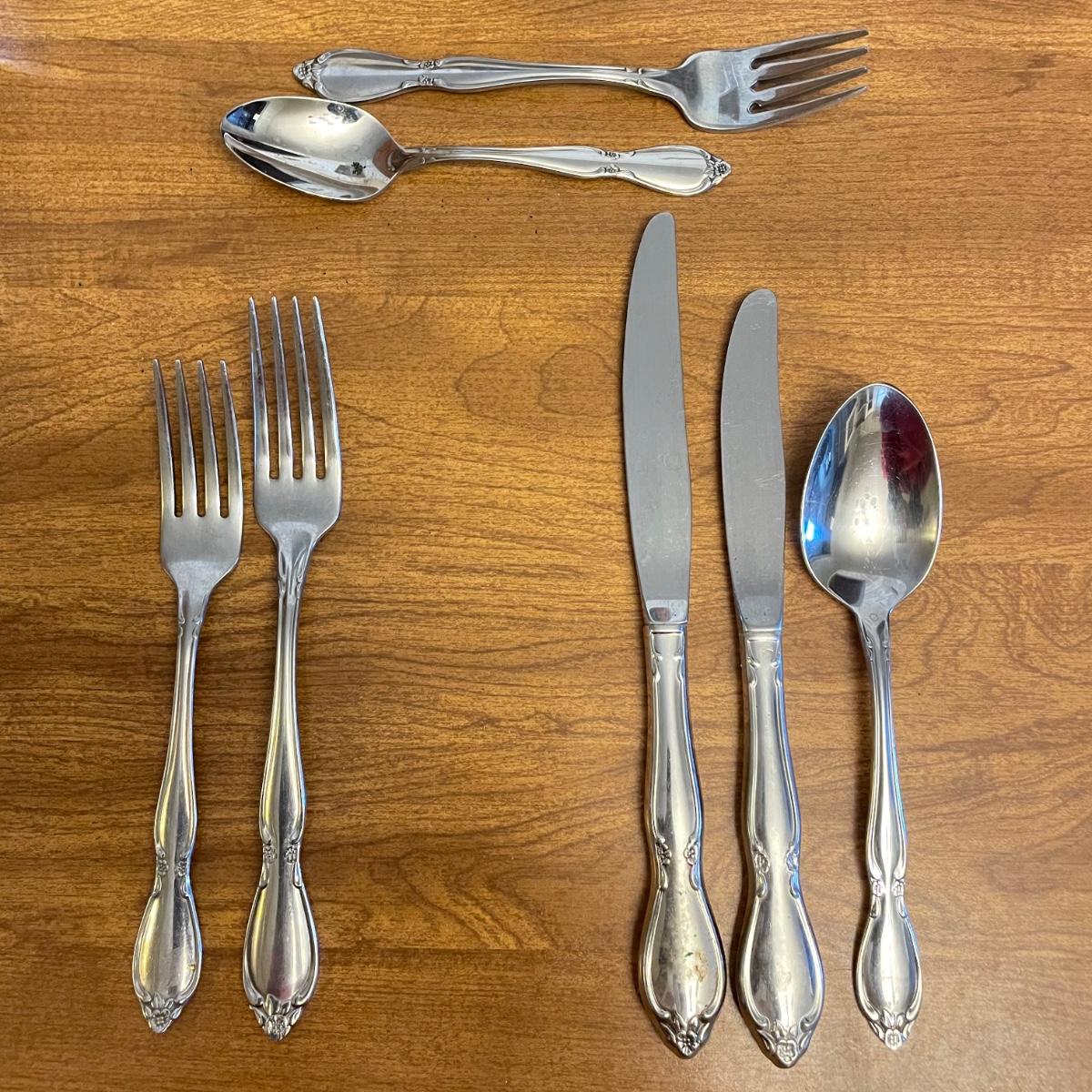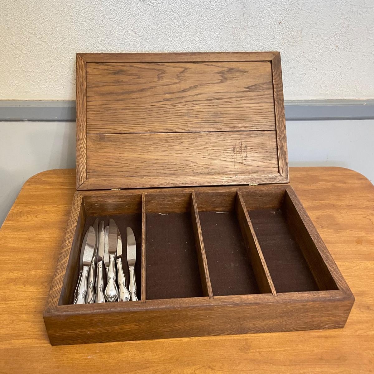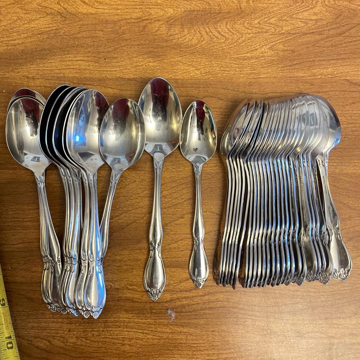 Large set of Oneida Cutlery, plus serving utensils and wooden case. Lot includes eight large dinner knives and eleven smaller dinner knives, eight dessert forks, eleven salad forks, and eight entree forks. There are twenty-six coffee/dessert spoons and twelve soup spoons. Additionally, there are eleven large and six smaller matching serving utensils, plus five more larger servers with large roses on the handles. See images. Box measures 19” x 12.5” x 3.75”. Plastic drawer liner has two separate sides to adjust width. Items should be cleaned before use. Local pick up only.