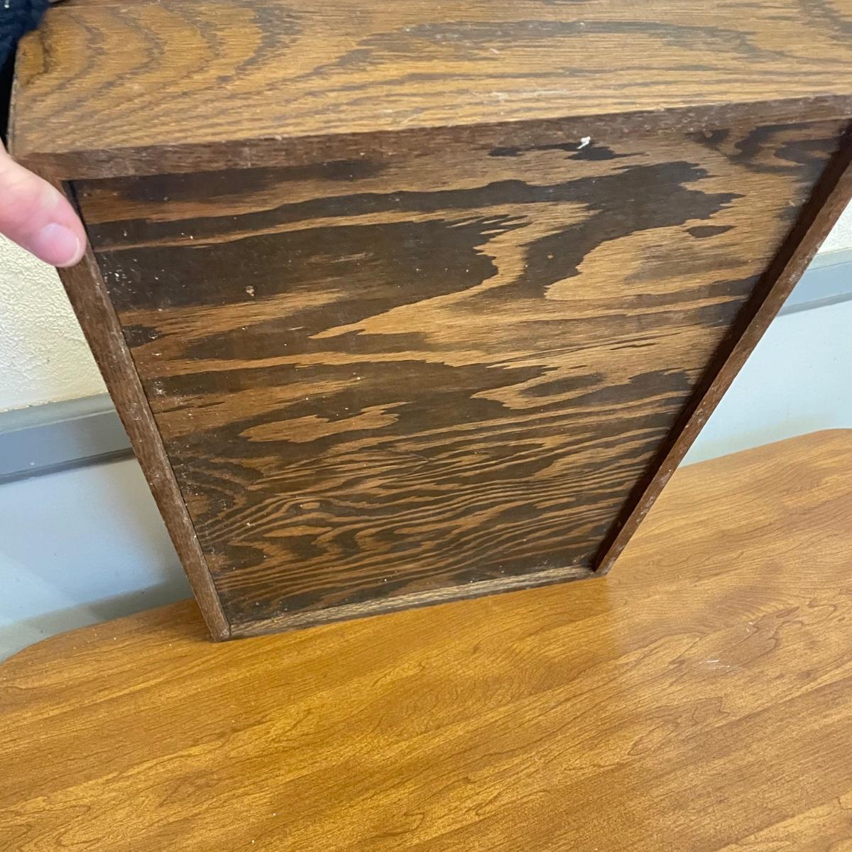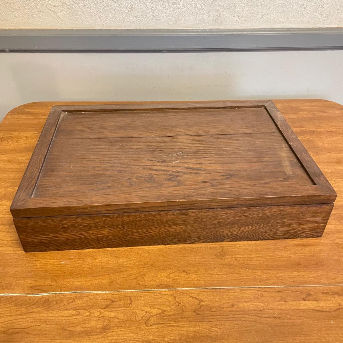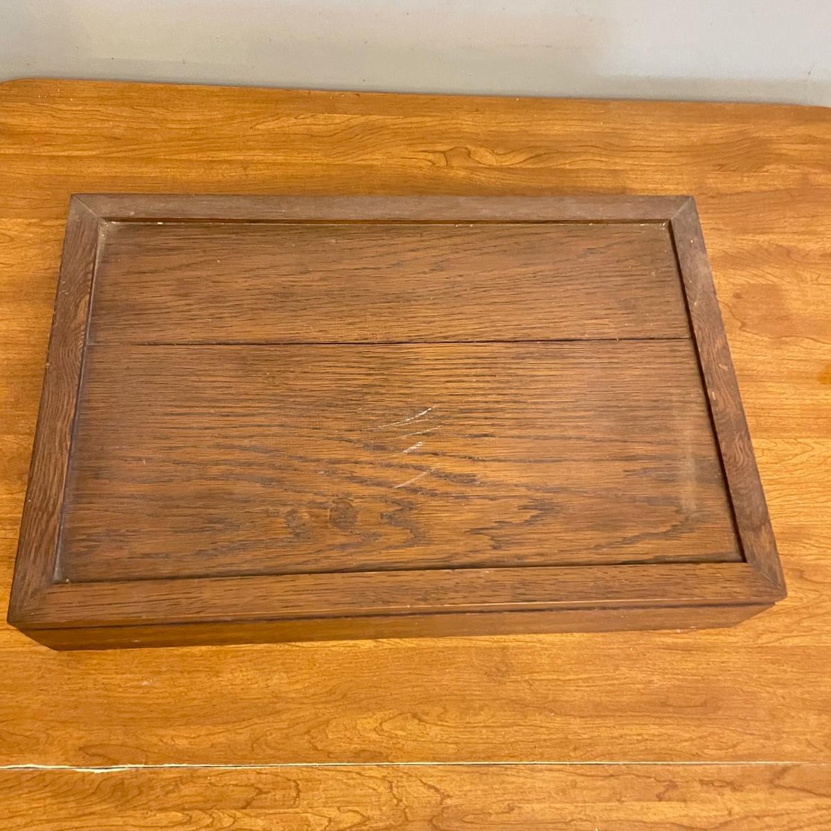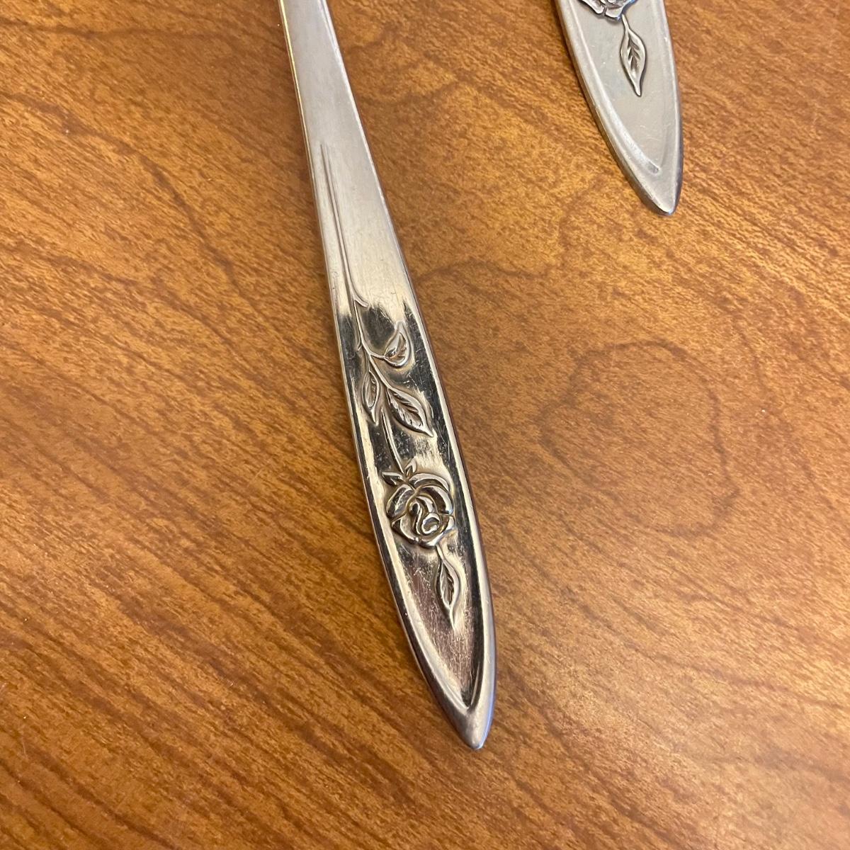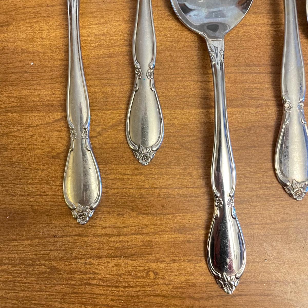 Large set of Oneida Cutlery, plus serving utensils and wooden case. Lot includes eight large dinner knives and eleven smaller dinner knives, eight dessert forks, eleven salad forks, and eight entree forks. There are twenty-six coffee/dessert spoons and twelve soup spoons. Additionally, there are eleven large and six smaller matching serving utensils, plus five more larger servers with large roses on the handles. See images. Box measures 19” x 12.5” x 3.75”. Plastic drawer liner has two separate sides to adjust width. Items should be cleaned before use. Local pick up only.