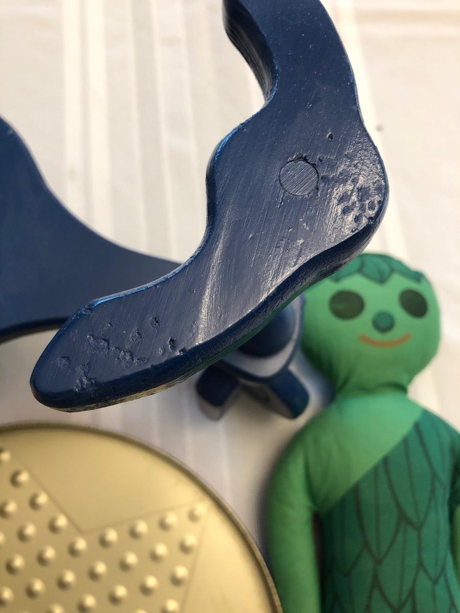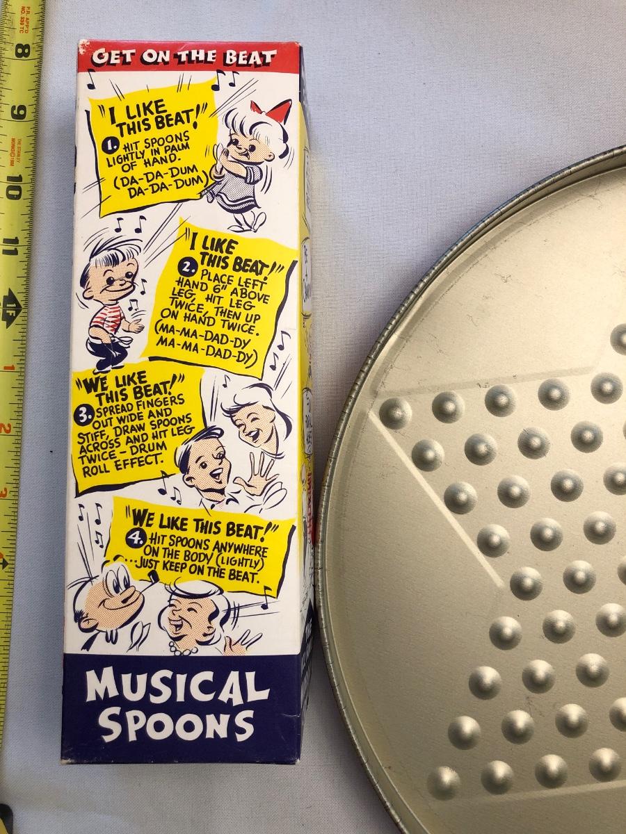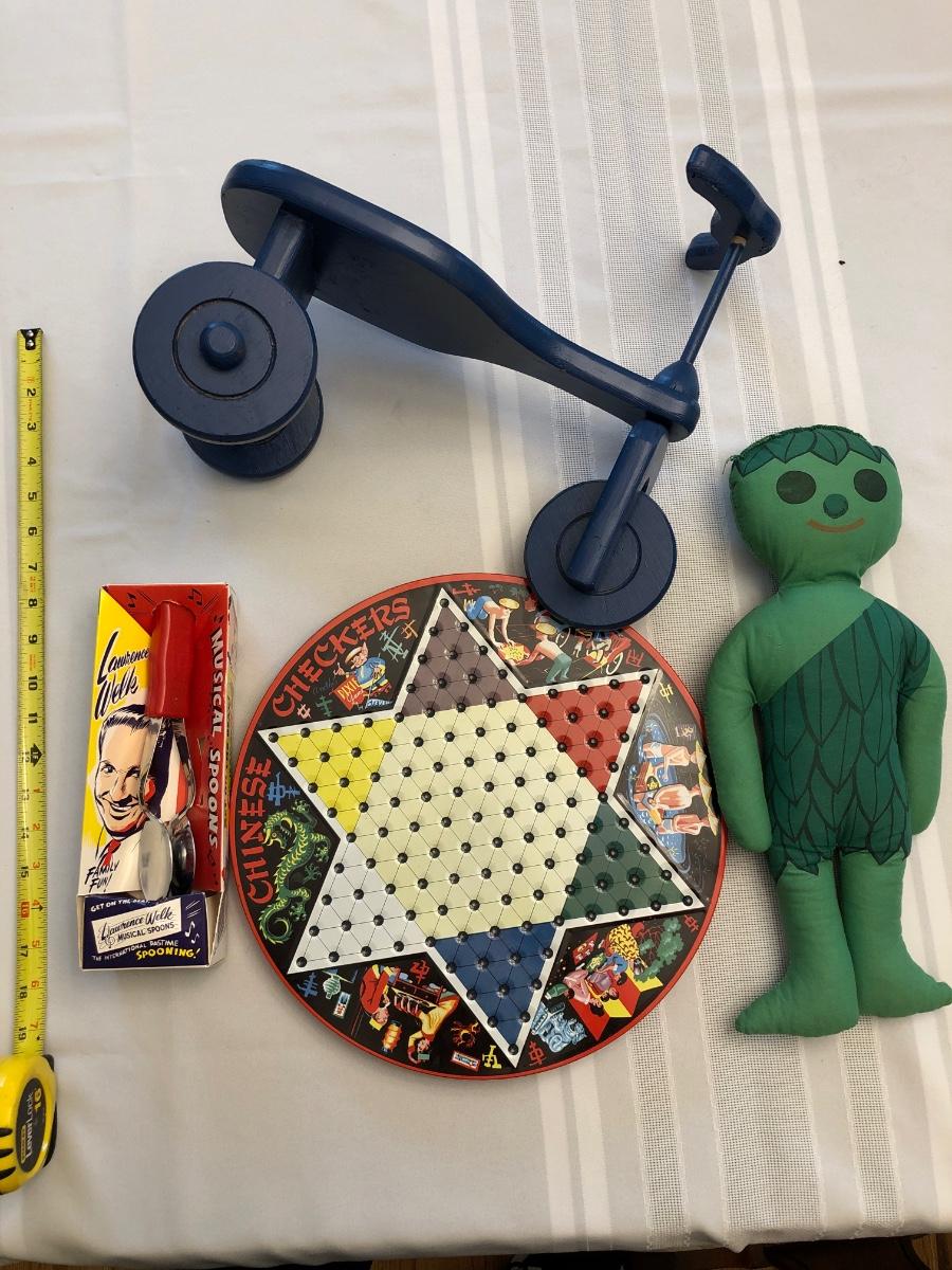 Lawrence Welk branded musical spoons with box, metal Chinese checkers, wooden kid’s scooter, cloth doll: Jolly Green Giant.