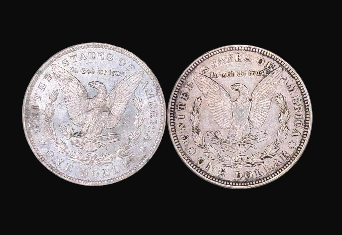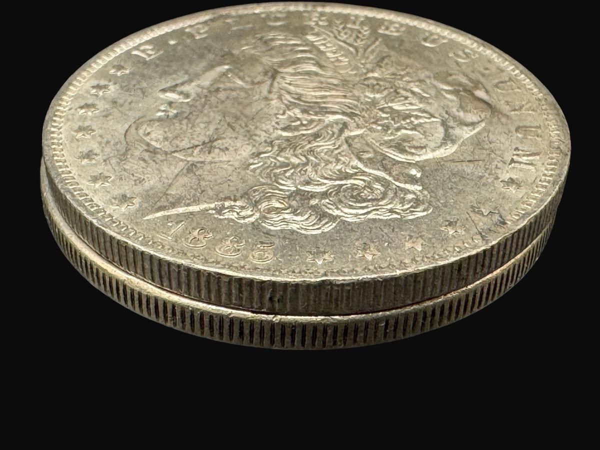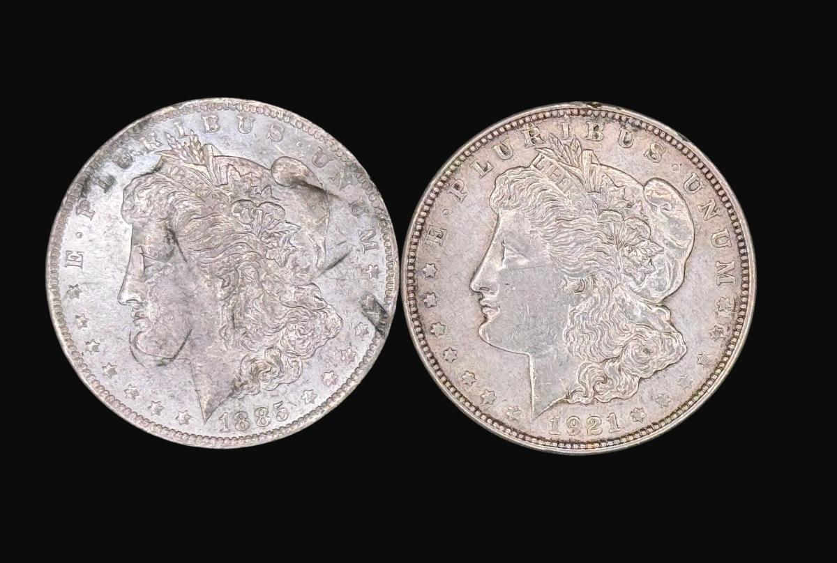 **WIRE TRANSFER IS REQUIRED IF SHIPPED.** Includes an 1885-O (New Orleans), and a 1921 Philadelphia. Both are believed to be almost uncirculated. Silver content is 90%, **ALL PRECIOUS METALS SALES ARE FINAL. NO REFUNDS WILL BE GIVEN FOR ANY REASON.** [AG]