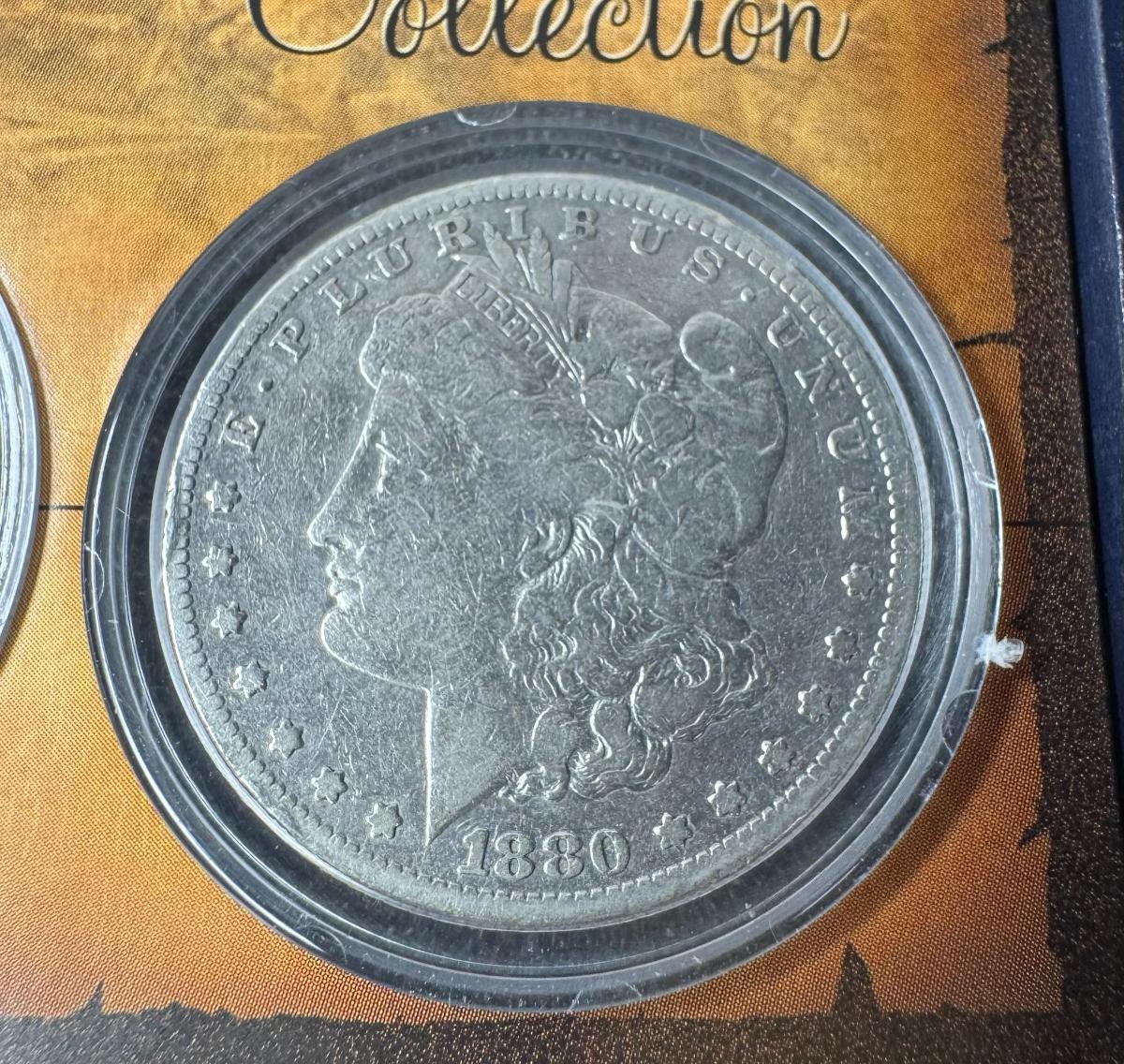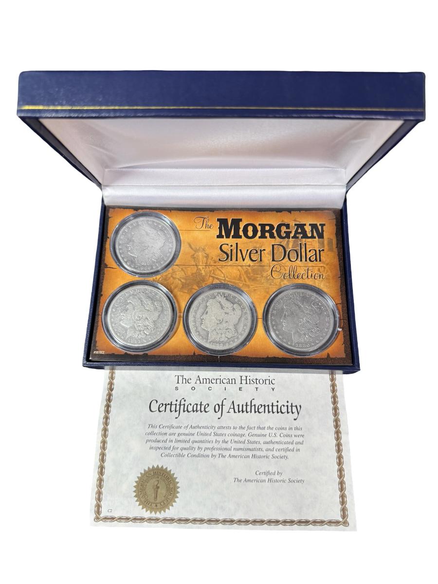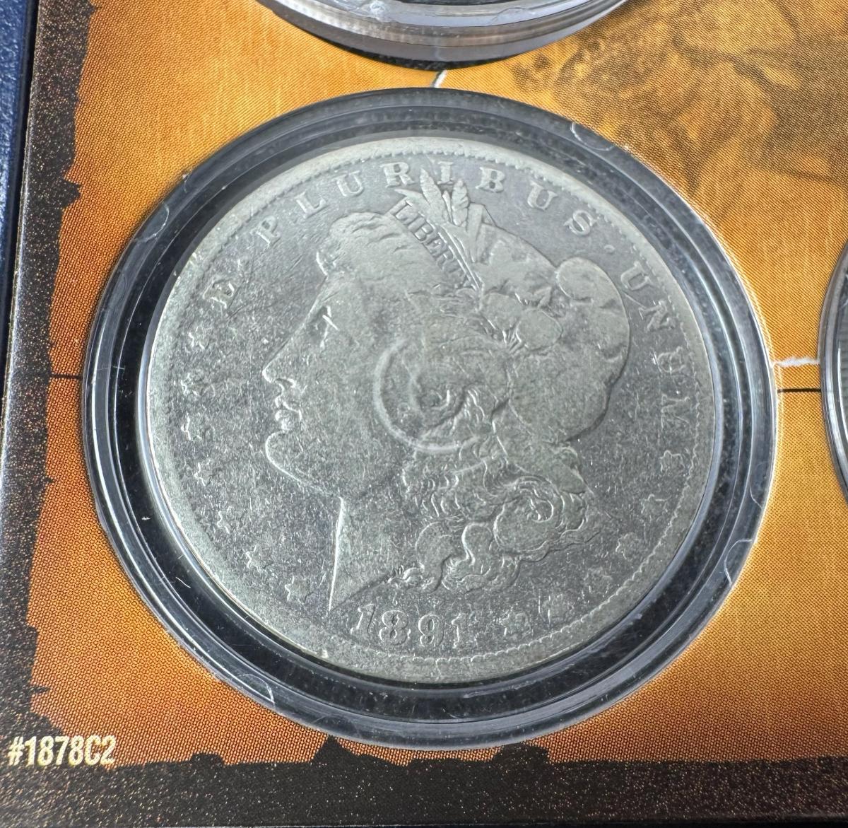 **WIRE TRANSFER IS REQUIRED IF SHIPPED.** This collection features four Morgan silver dollar coins: 1880, 1886, 1891, and 1899. All are believed to be circulated. Silver content is 90%. Includes original box/display. **ALL PRECIOUS METALS SALES ARE FINAL. NO REFUNDS WILL BE GIVEN FOR ANY REASON.** [AG]