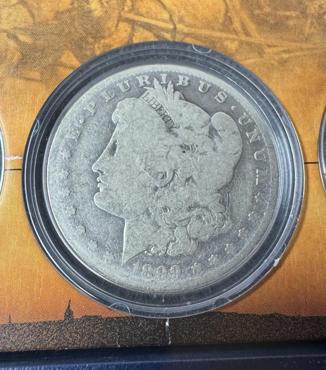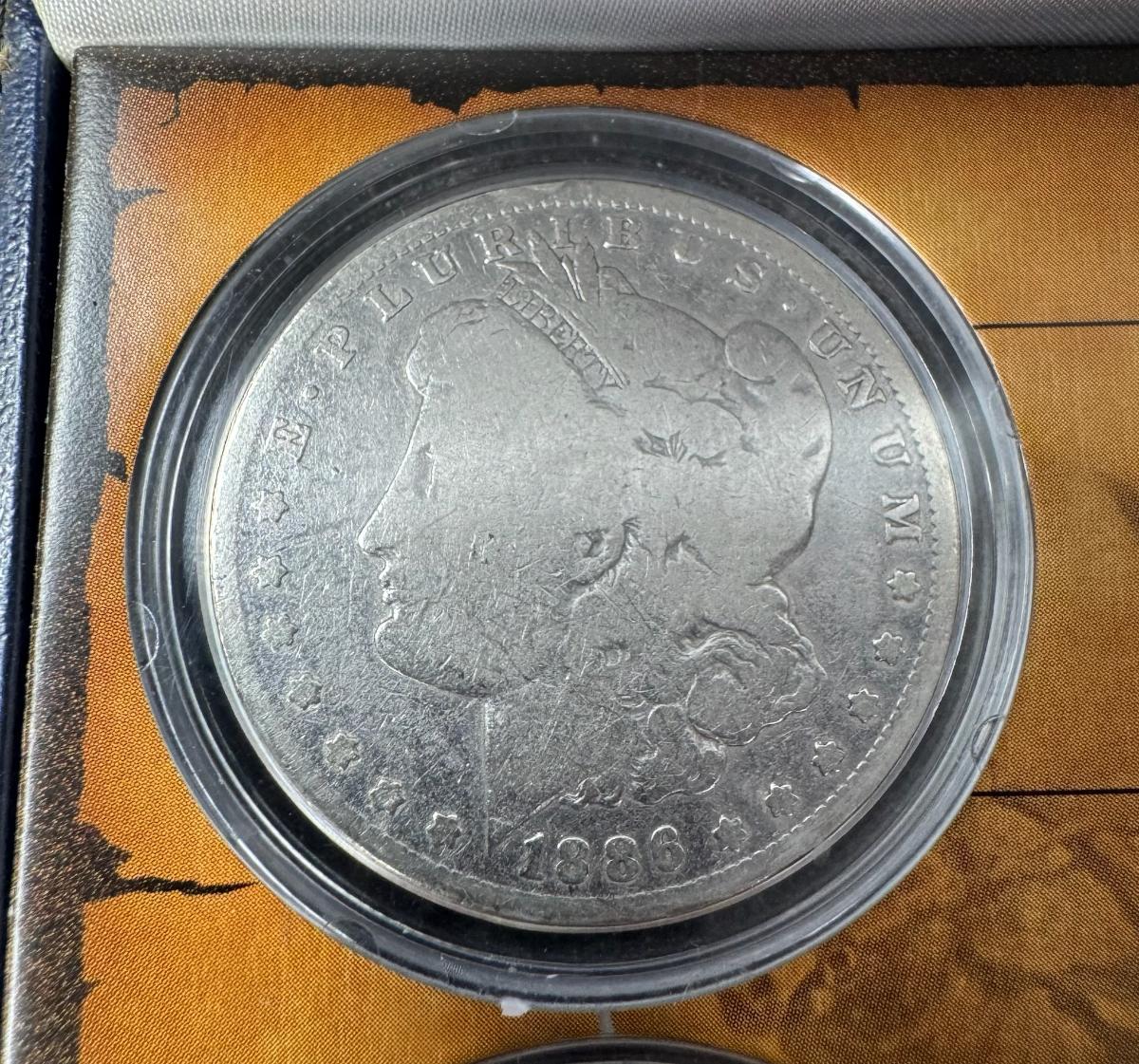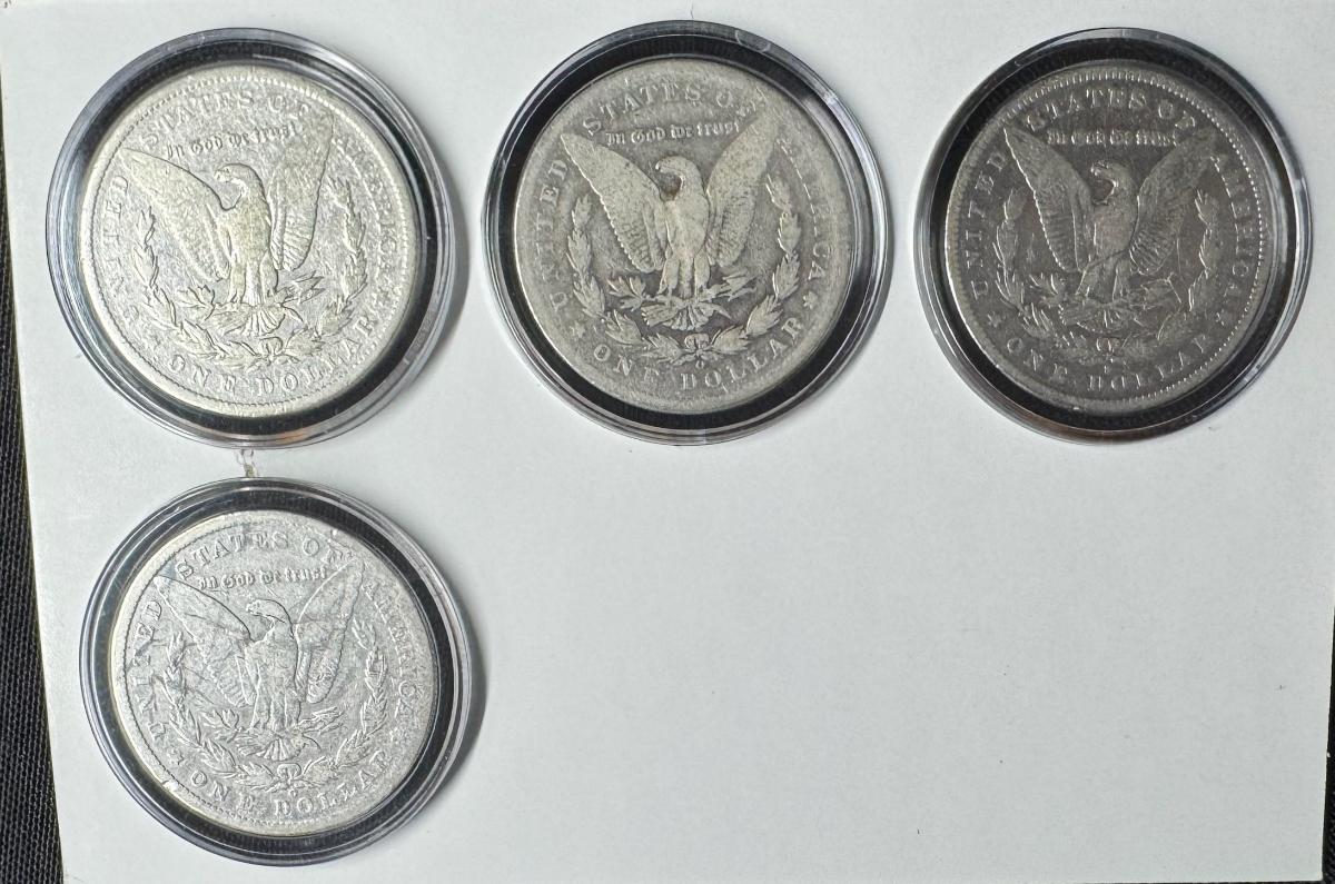 **WIRE TRANSFER IS REQUIRED IF SHIPPED.** This collection features four Morgan silver dollar coins: 1880, 1886, 1891, and 1899. All are believed to be circulated. Silver content is 90%. Includes original box/display. **ALL PRECIOUS METALS SALES ARE FINAL. NO REFUNDS WILL BE GIVEN FOR ANY REASON.** [AG]