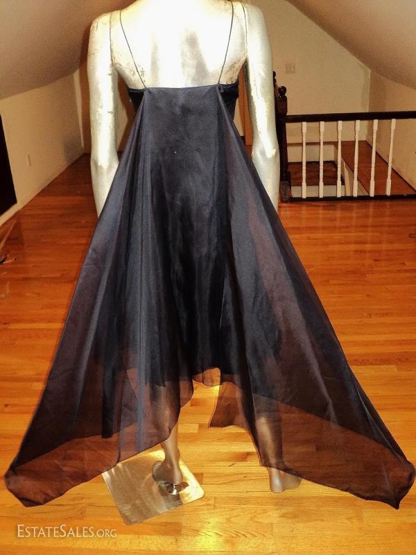 Morgane Le Fay is a luxury fashion company based in NY. Started in 1982 in the Soho district then moved to Park ave for the most luxurious store.. This dress is an amazing example of Couture at its best. A dark navy blue with amazing pleated details and winged train . This one was worn only for a runway show