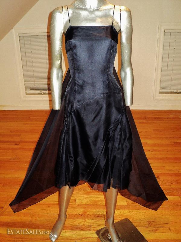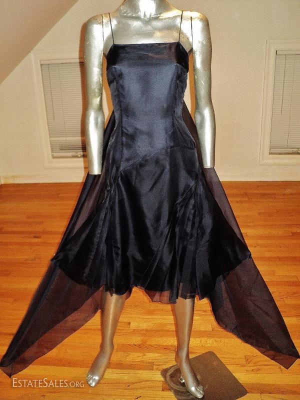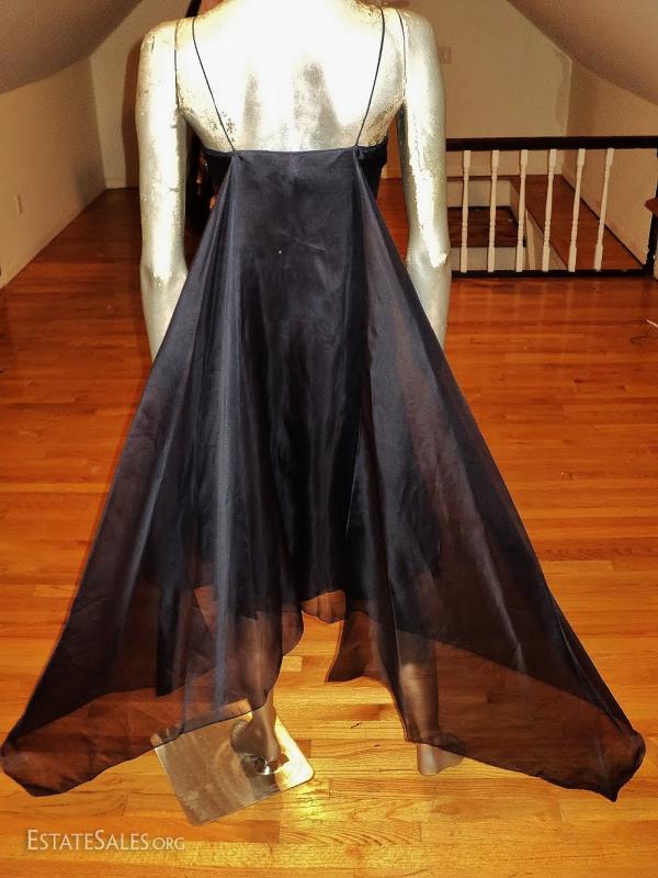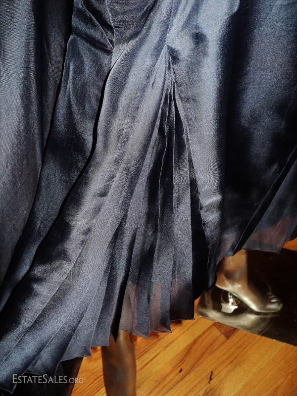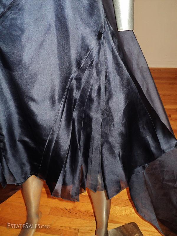 Morgane Le Fay is a luxury fashion company based in NY. Started in 1982 in the Soho district then moved to Park ave for the most luxurious store.. This dress is an amazing example of Couture at its best. A dark navy blue with amazing pleated details and winged train . This one was worn only for a runway show