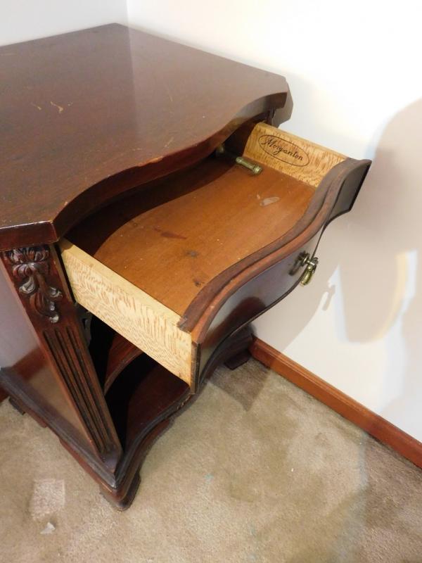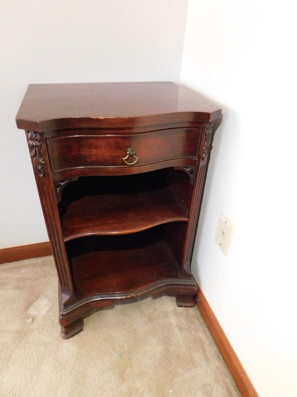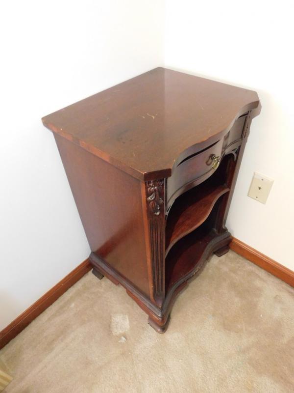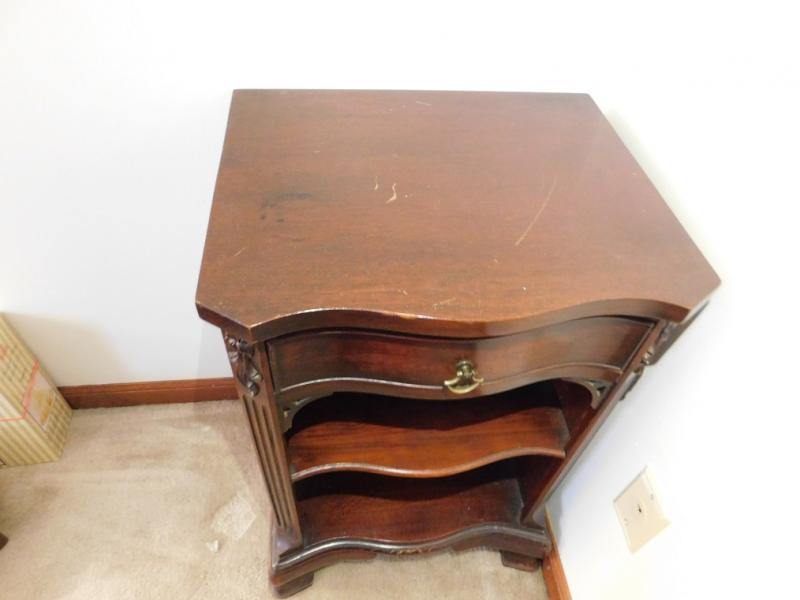 Mahogany Single Serpentine Drawer Side Table with Open Cubby Shelves has some wear to finish but very nice