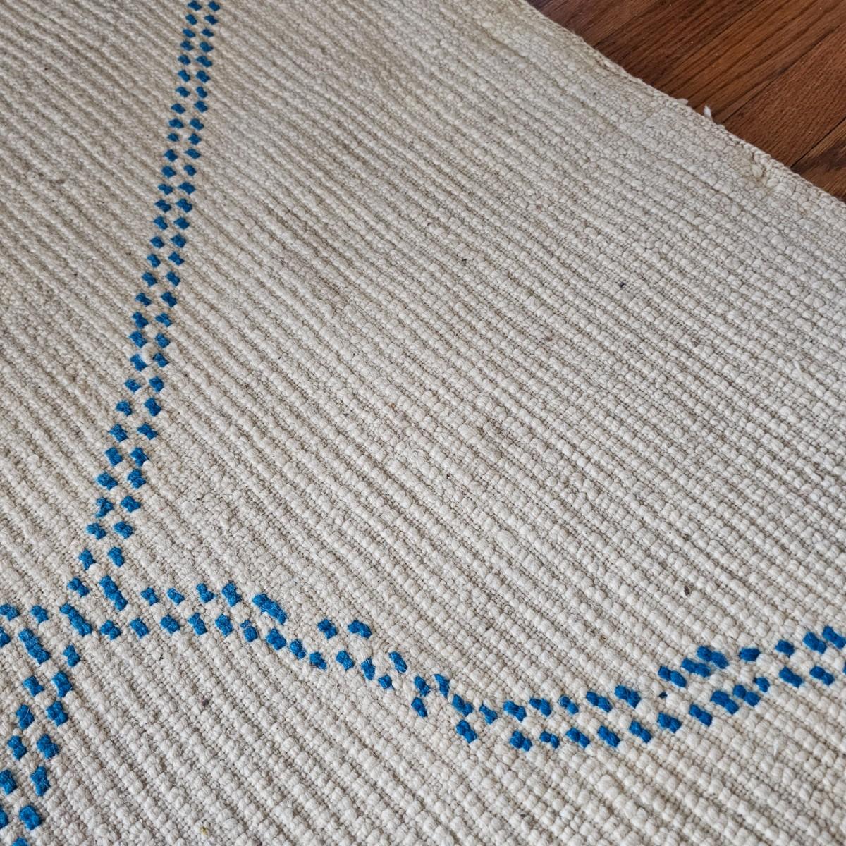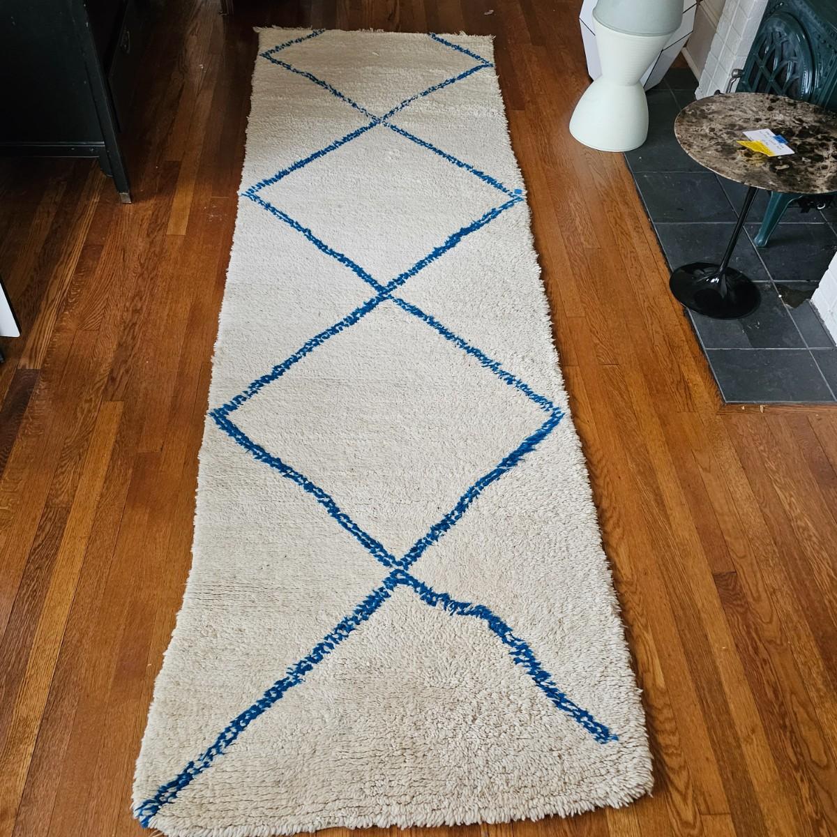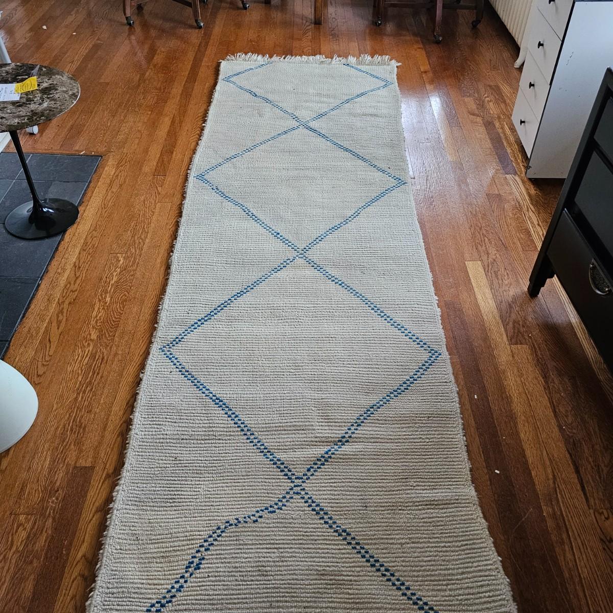 Off white background with a diamond blue pattern on this Moroccan runner/rug. Color criss crosses back and forty over itself. Short fringe on one end. Rug measures 37" x 126". See photos for details. Local pickup only.