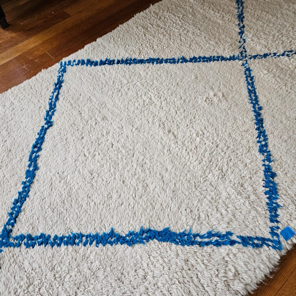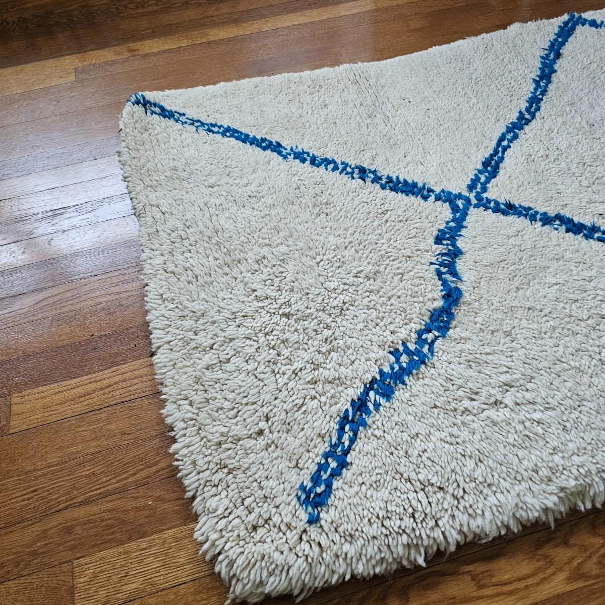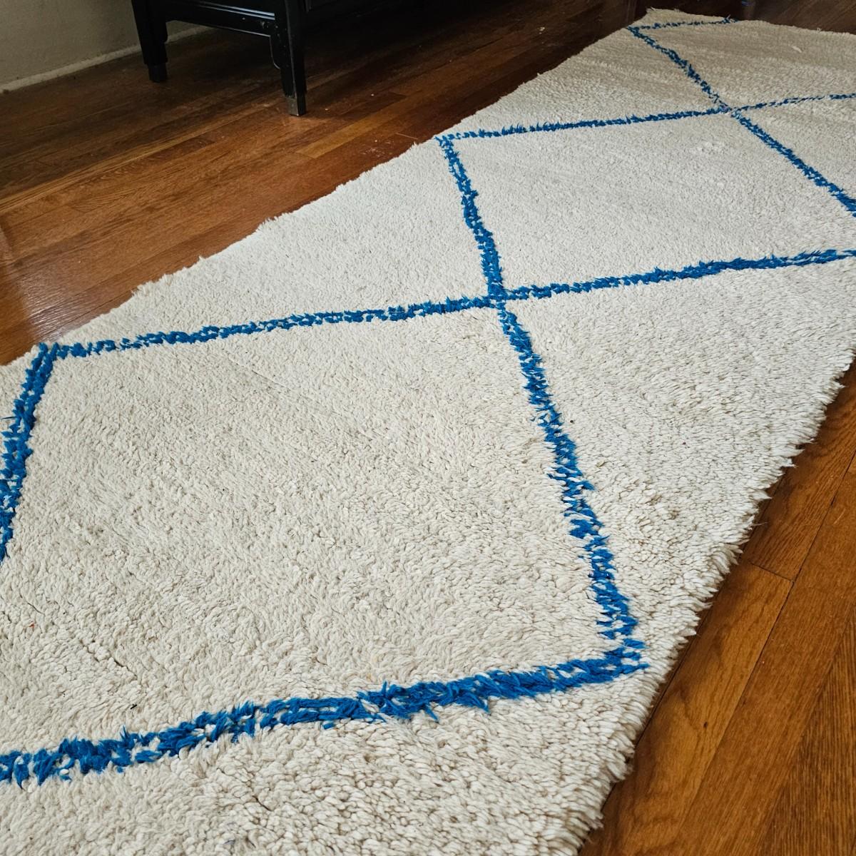 Off white background with a diamond blue pattern on this Moroccan runner/rug. Color criss crosses back and forty over itself. Short fringe on one end. Rug measures 37" x 126". See photos for details. Local pickup only.
