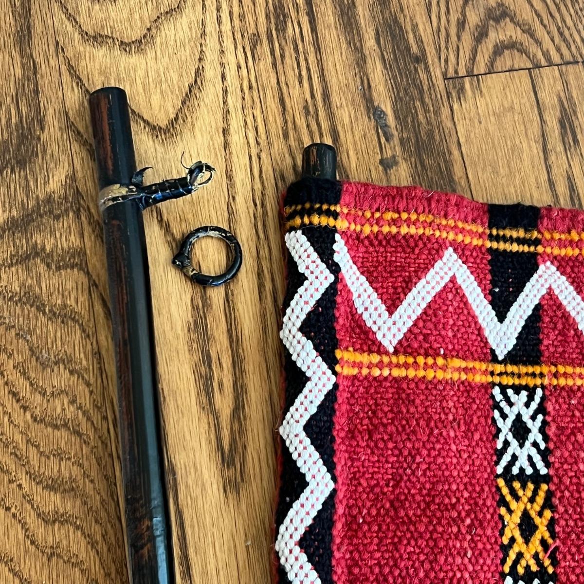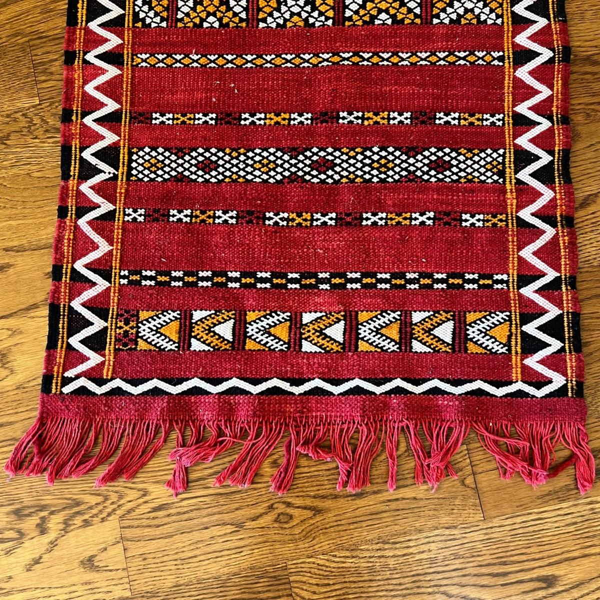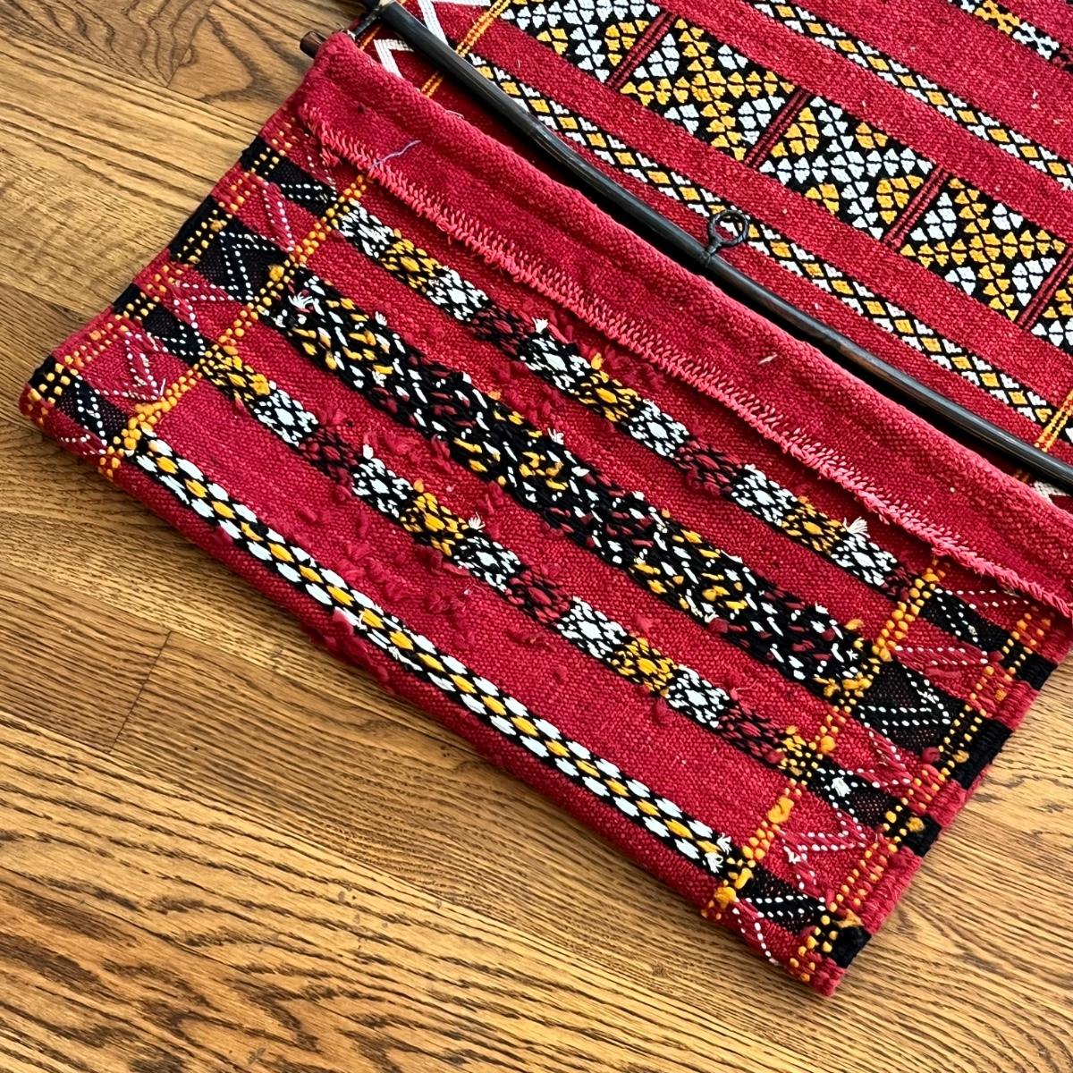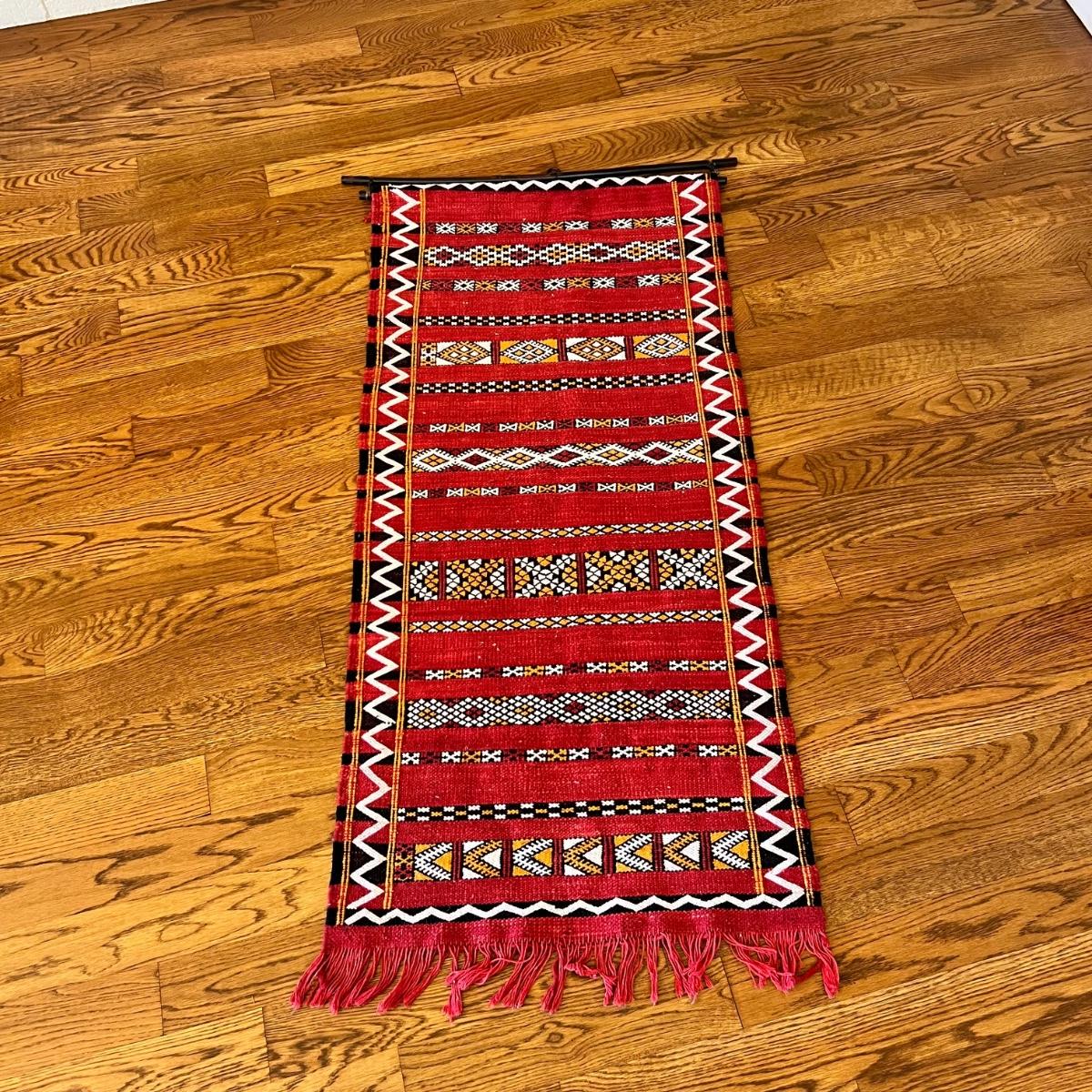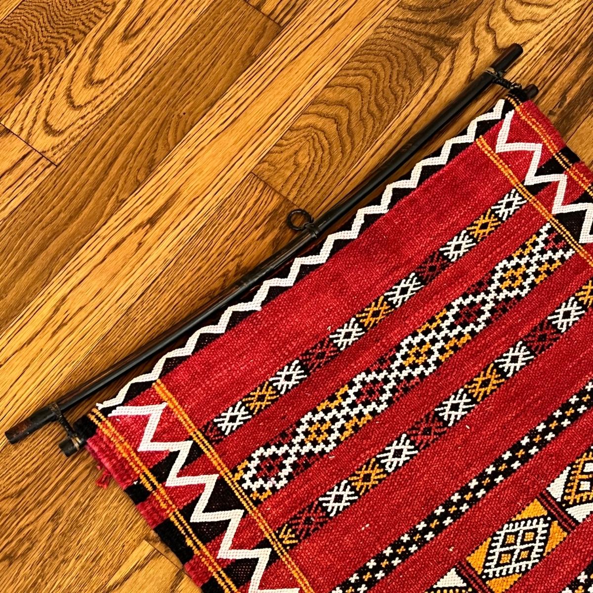 Beautiful Kilim style rug in a rich red color wool. Designed to be hung on the wall it has a lightweight bamboo like rod. Note that one end has become detached so it cannot be hung until it is fixed, see pics.