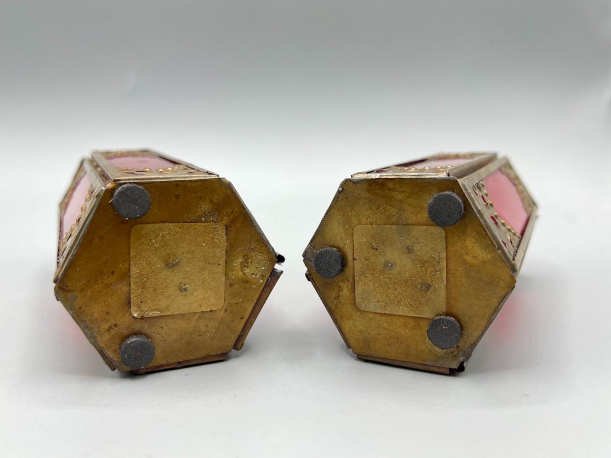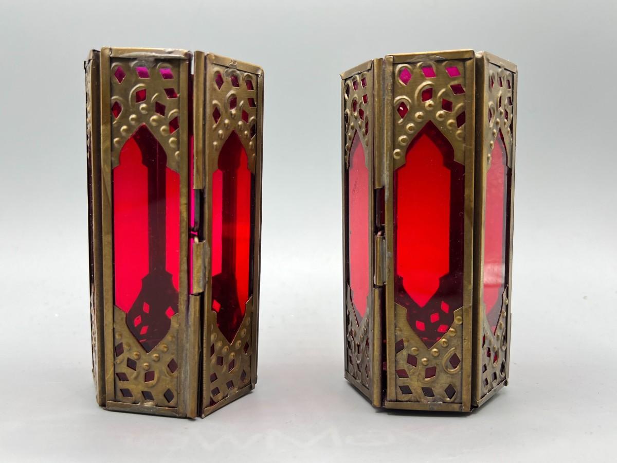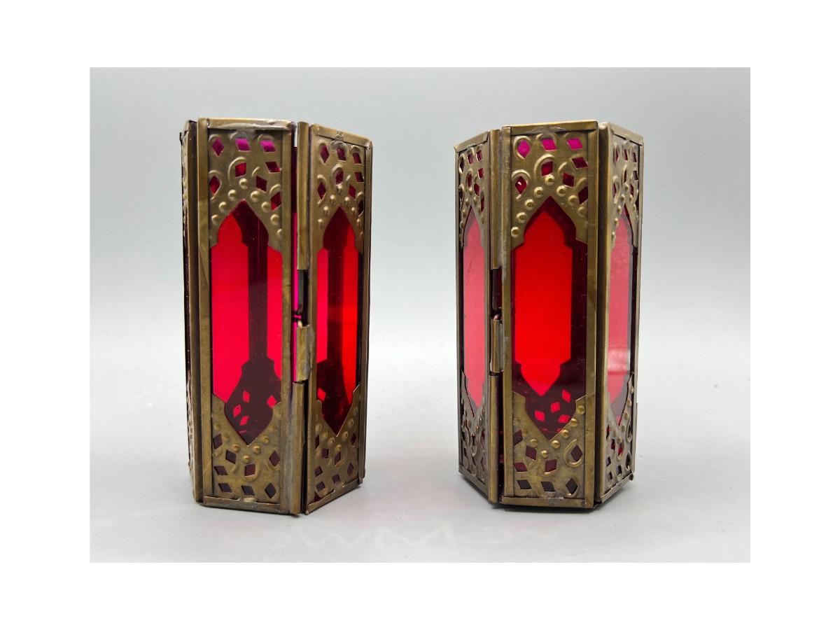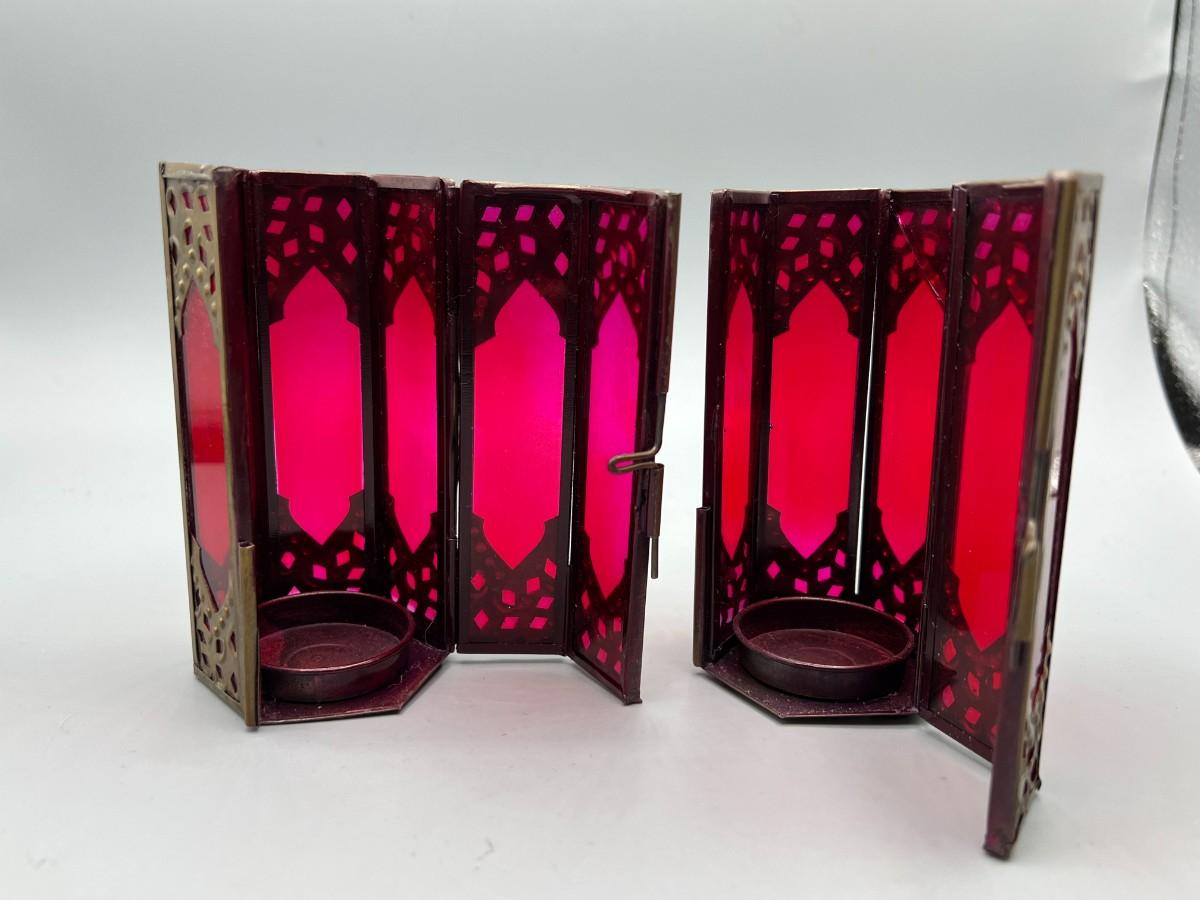 Pair of votive or tealight candle holders. Styled after Moroccan style lamps with ornate metal and colored glass. Hinged door for putting candle in. Under 5" size.