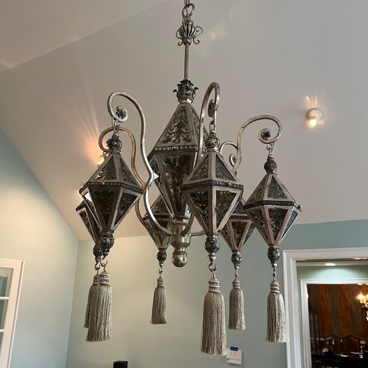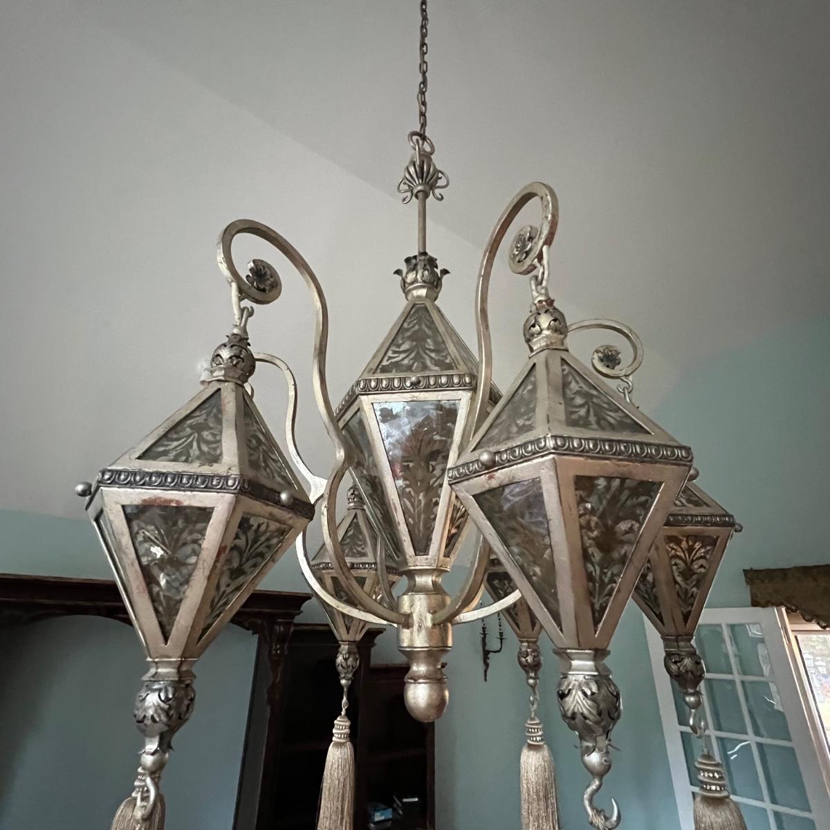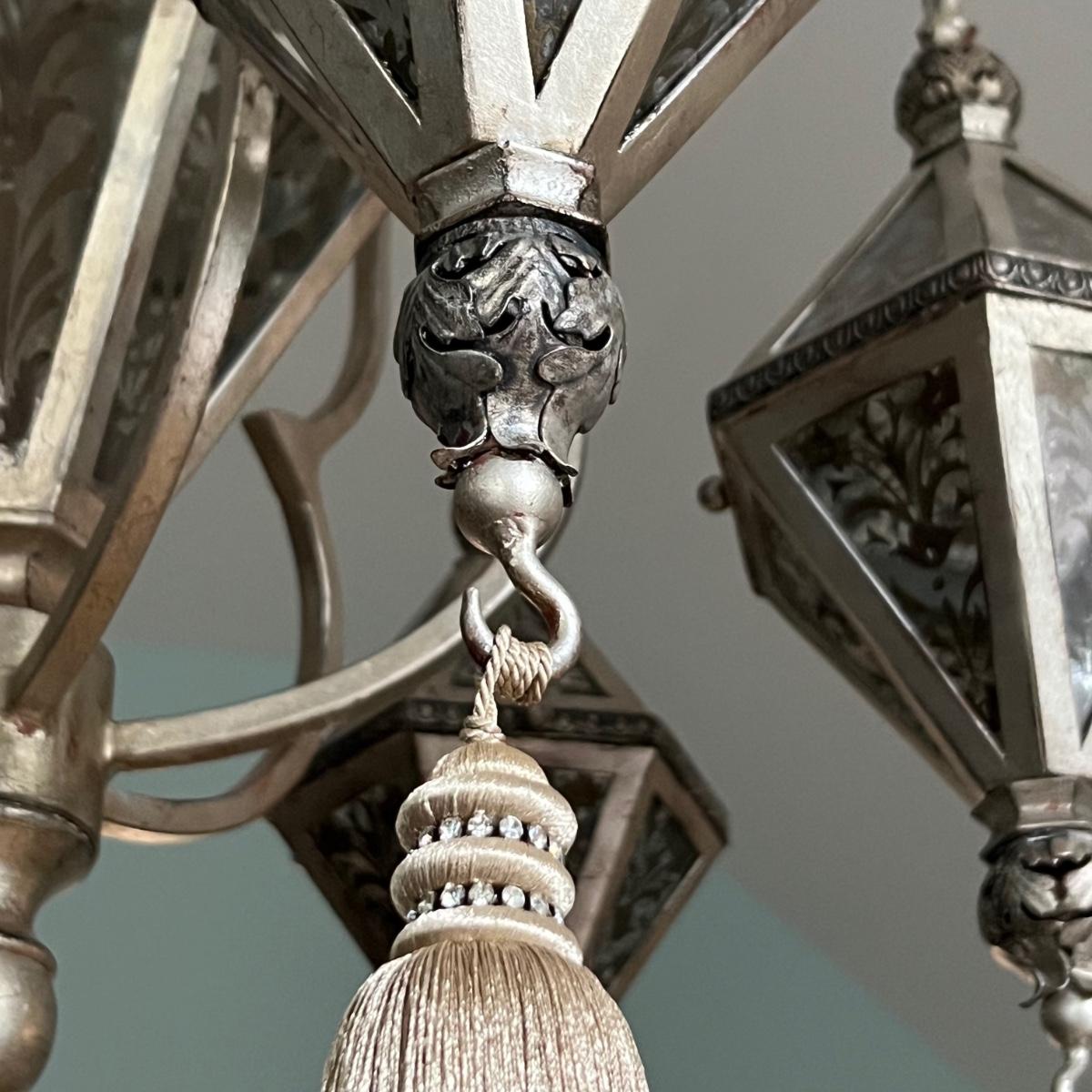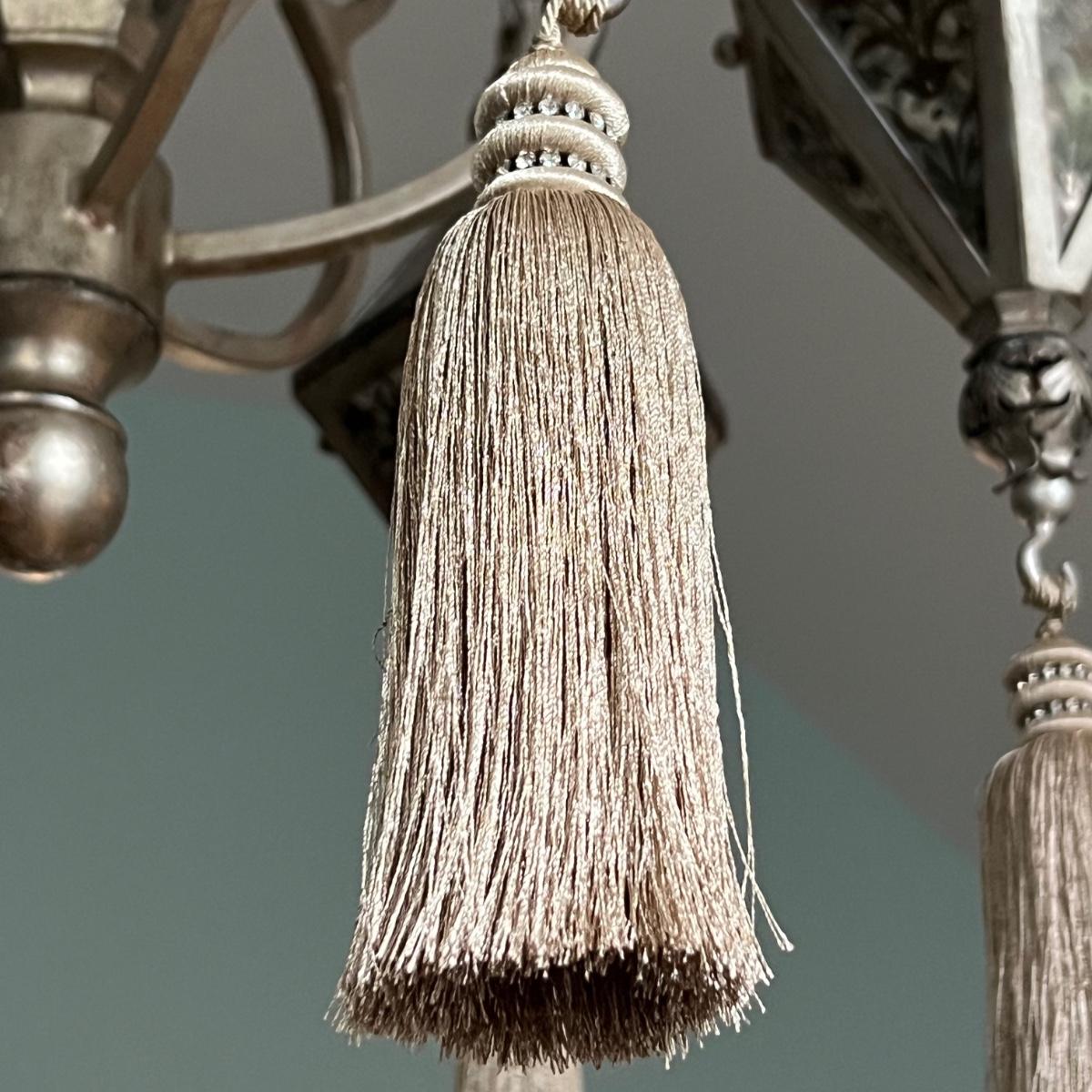 This statement piece is made of metal with an aged silver colored finish. Each component has faux glass panels with a bronze colored fleur de lis style pattern and large silver silk like tassels.