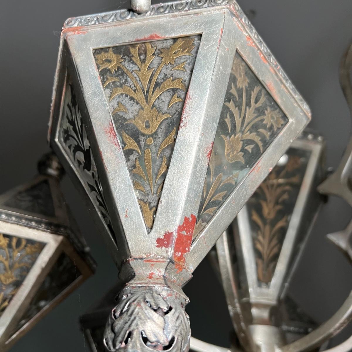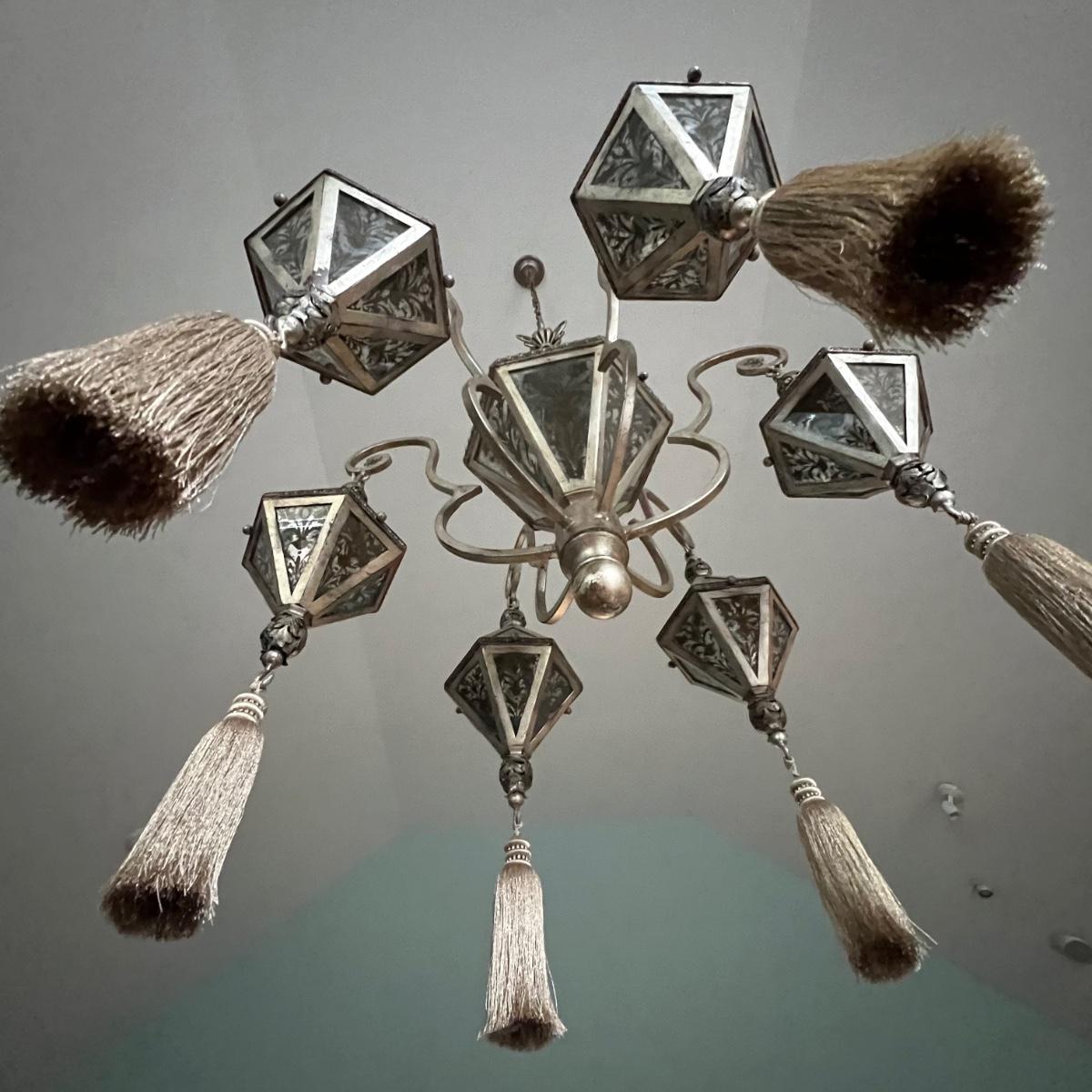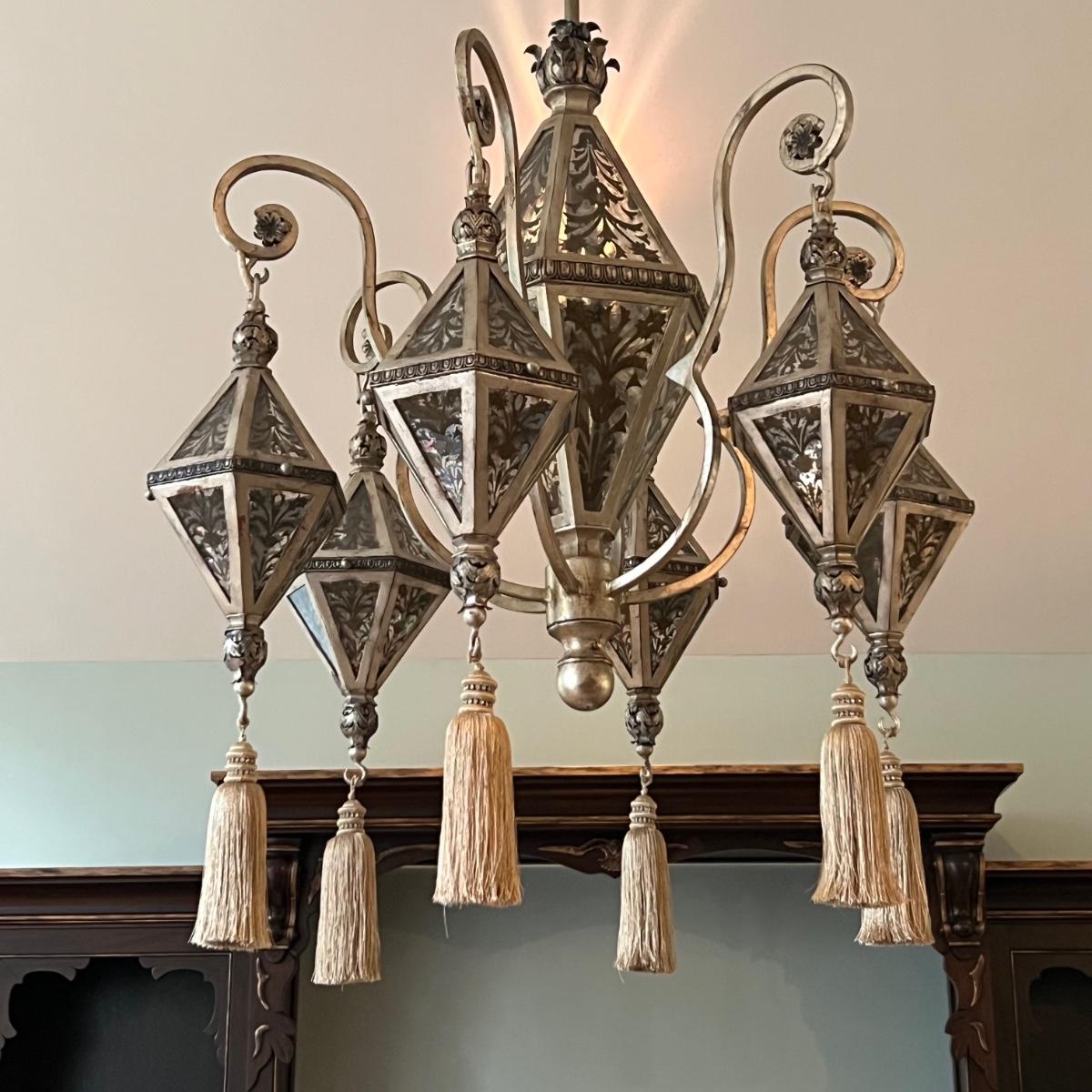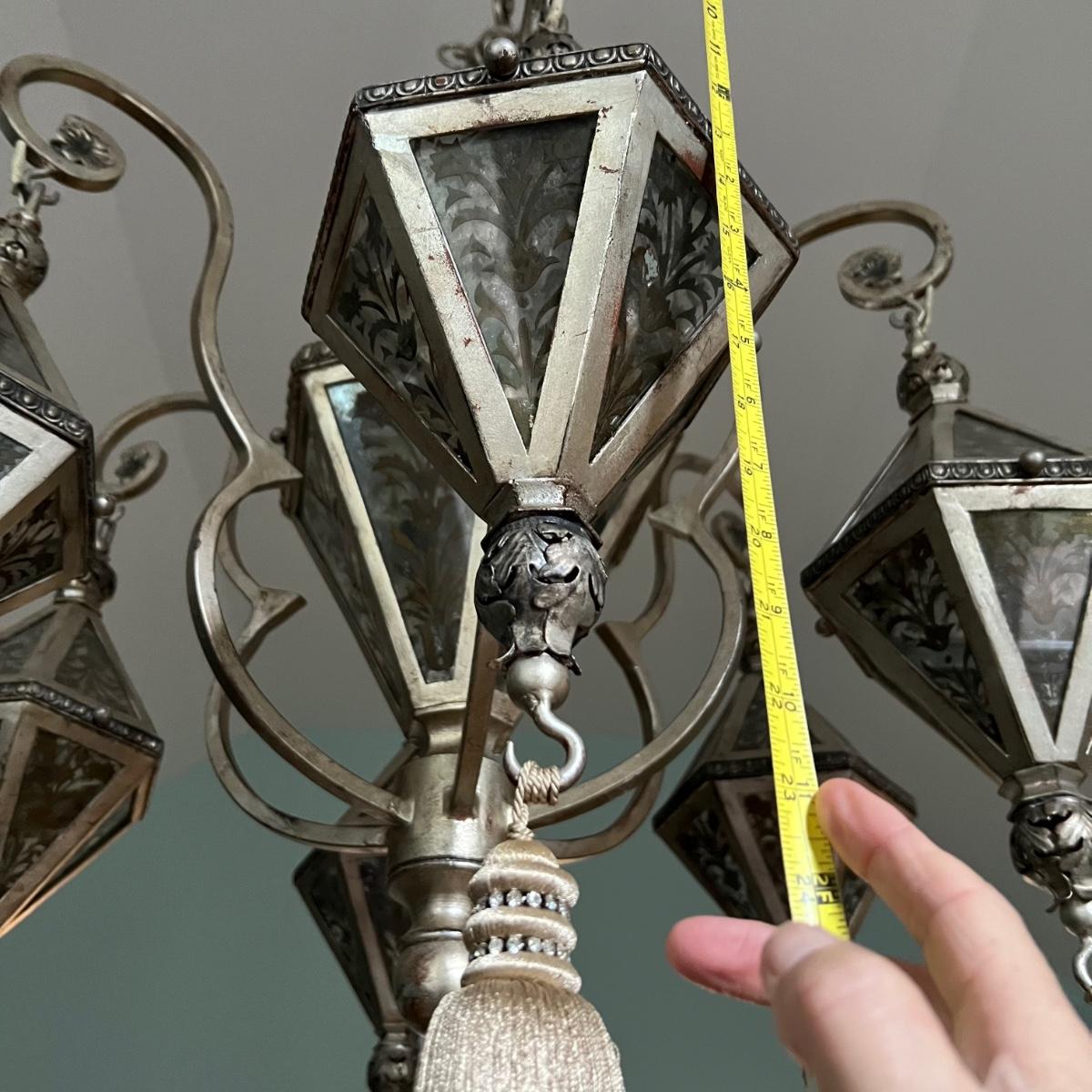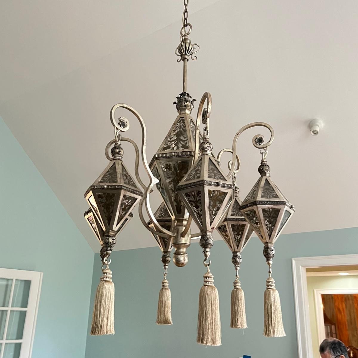 This statement piece is made of metal with an aged silver colored finish. Each component has faux glass panels with a bronze colored fleur de lis style pattern and large silver silk like tassels.