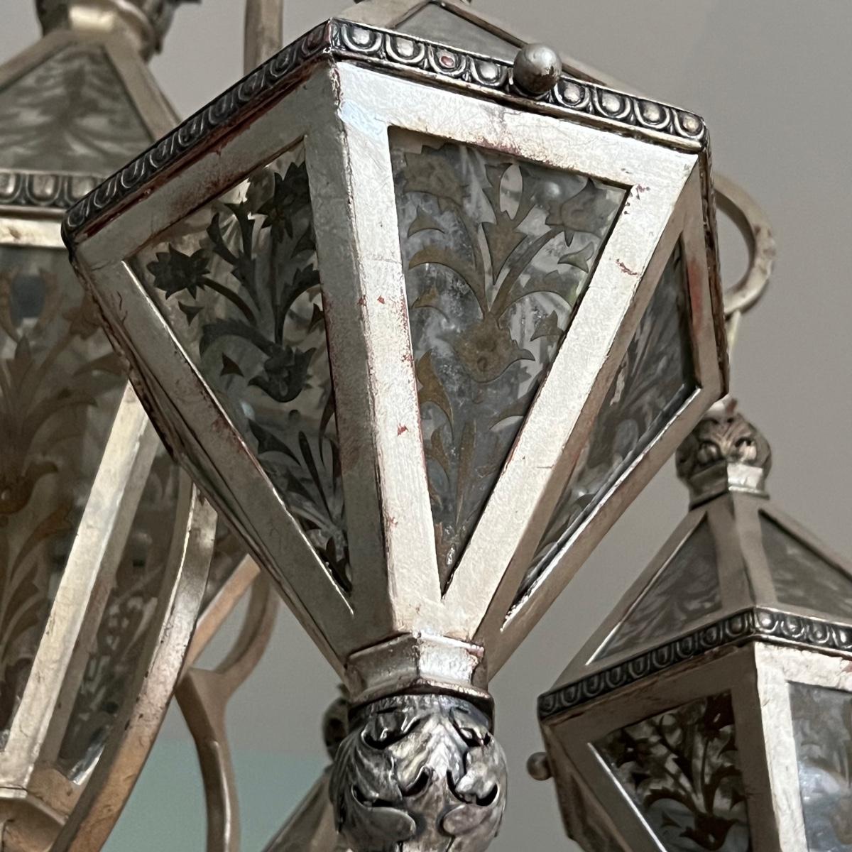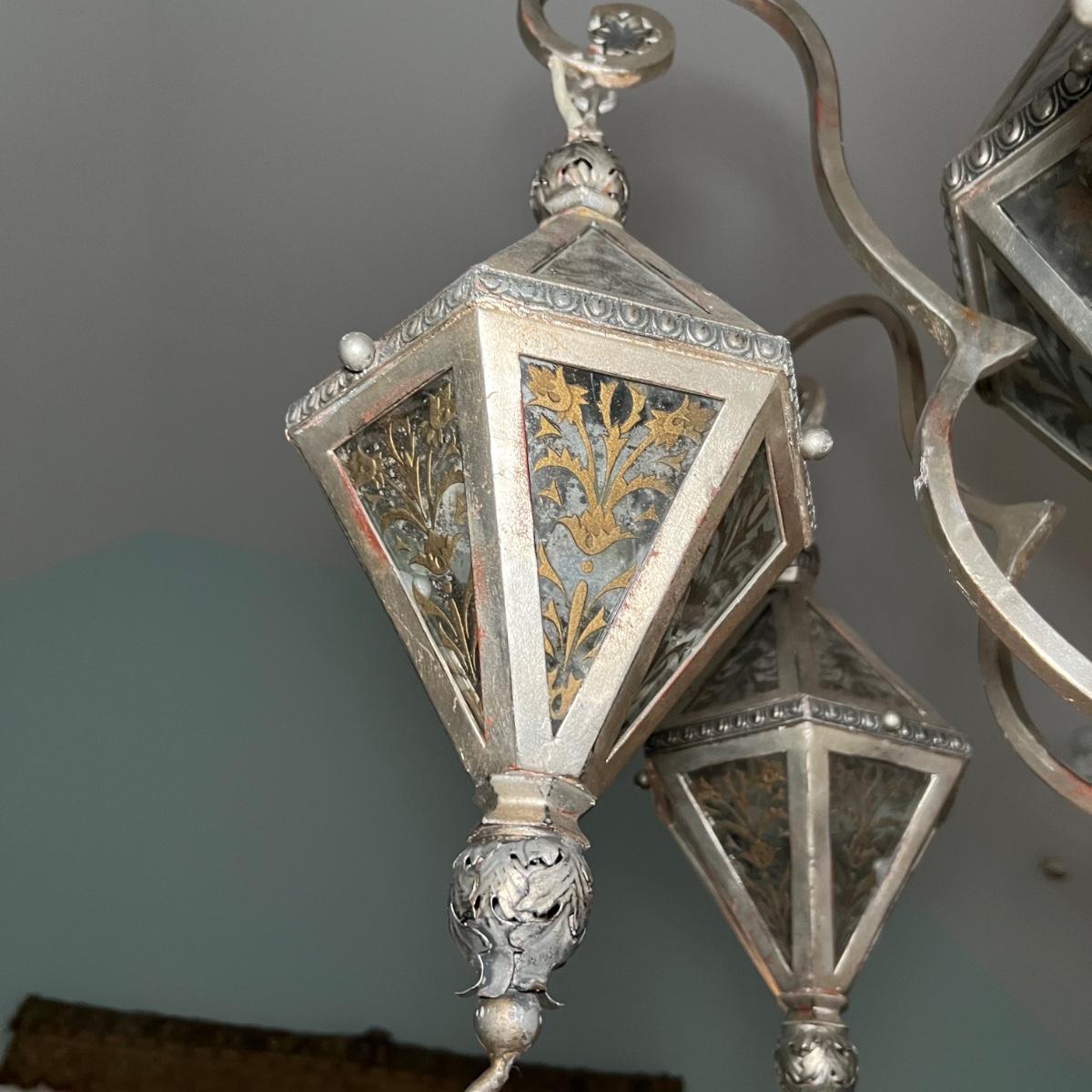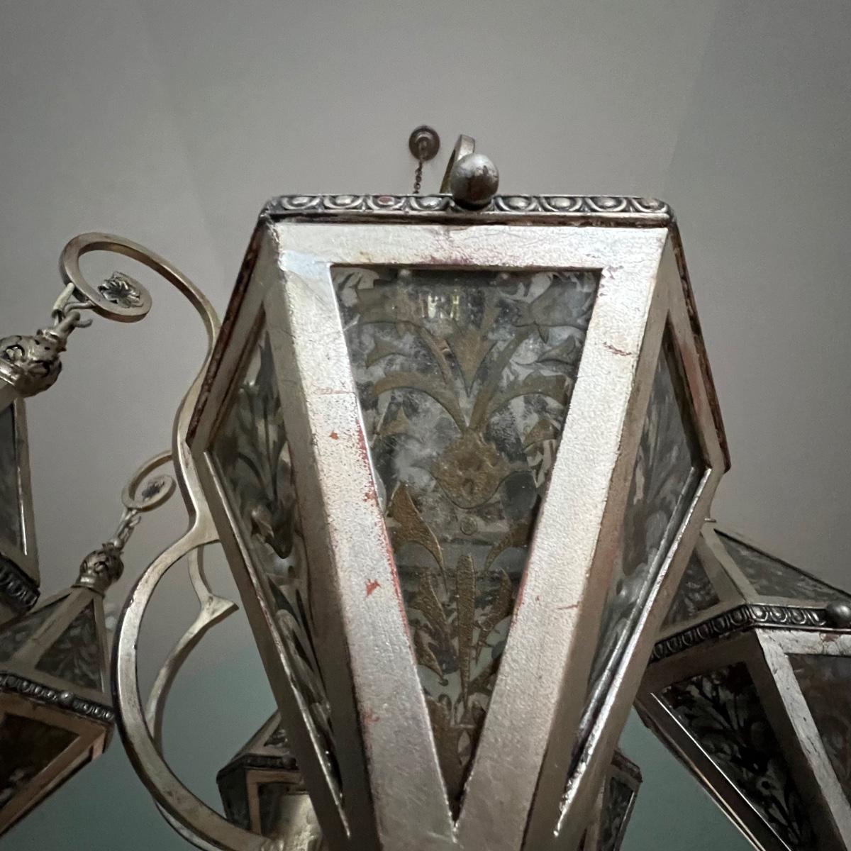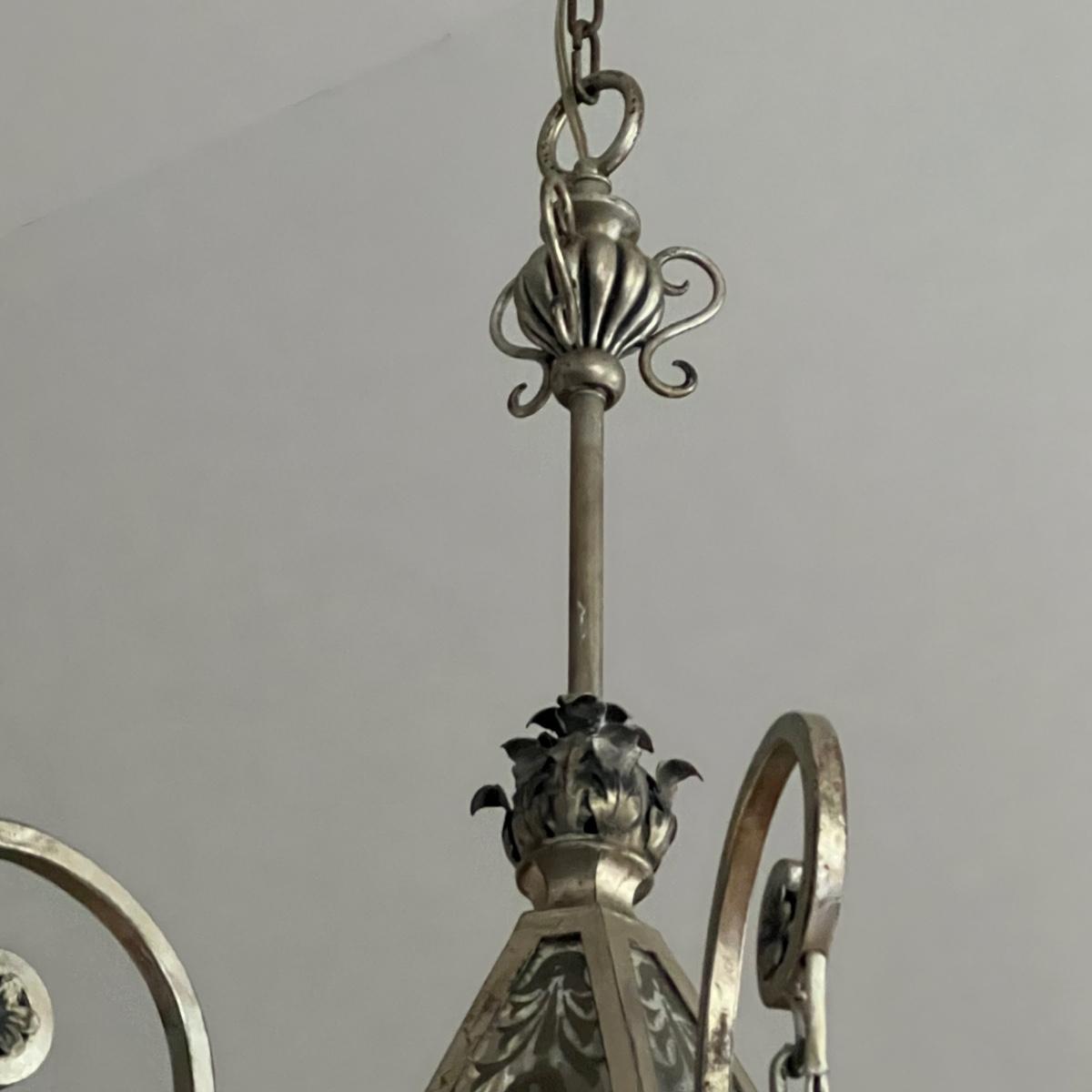 This statement piece is made of metal with an aged silver colored finish. Each component has faux glass panels with a bronze colored fleur de lis style pattern and large silver silk like tassels.