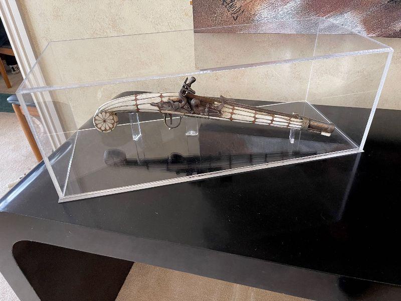 The item for auction is a classic North African flintlock, the body of which is stunningly overlaid with individually shaped bone veneers set into tooled white brass. Comes with the acrylic box and base if you choose to also have that shipped.