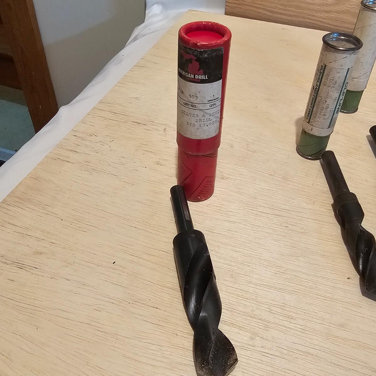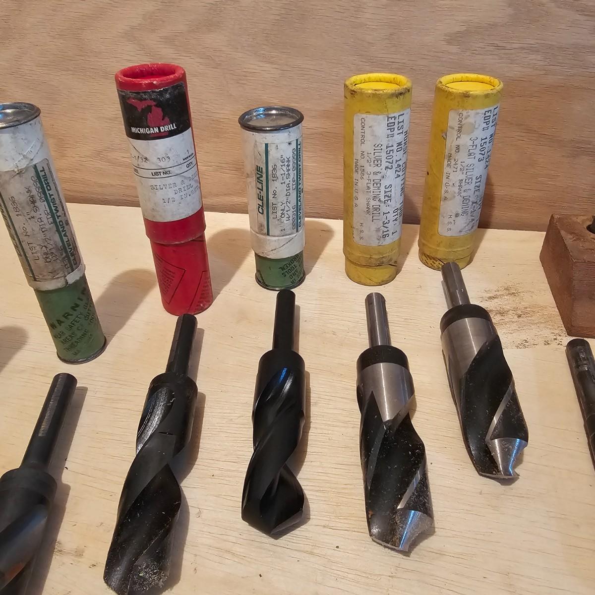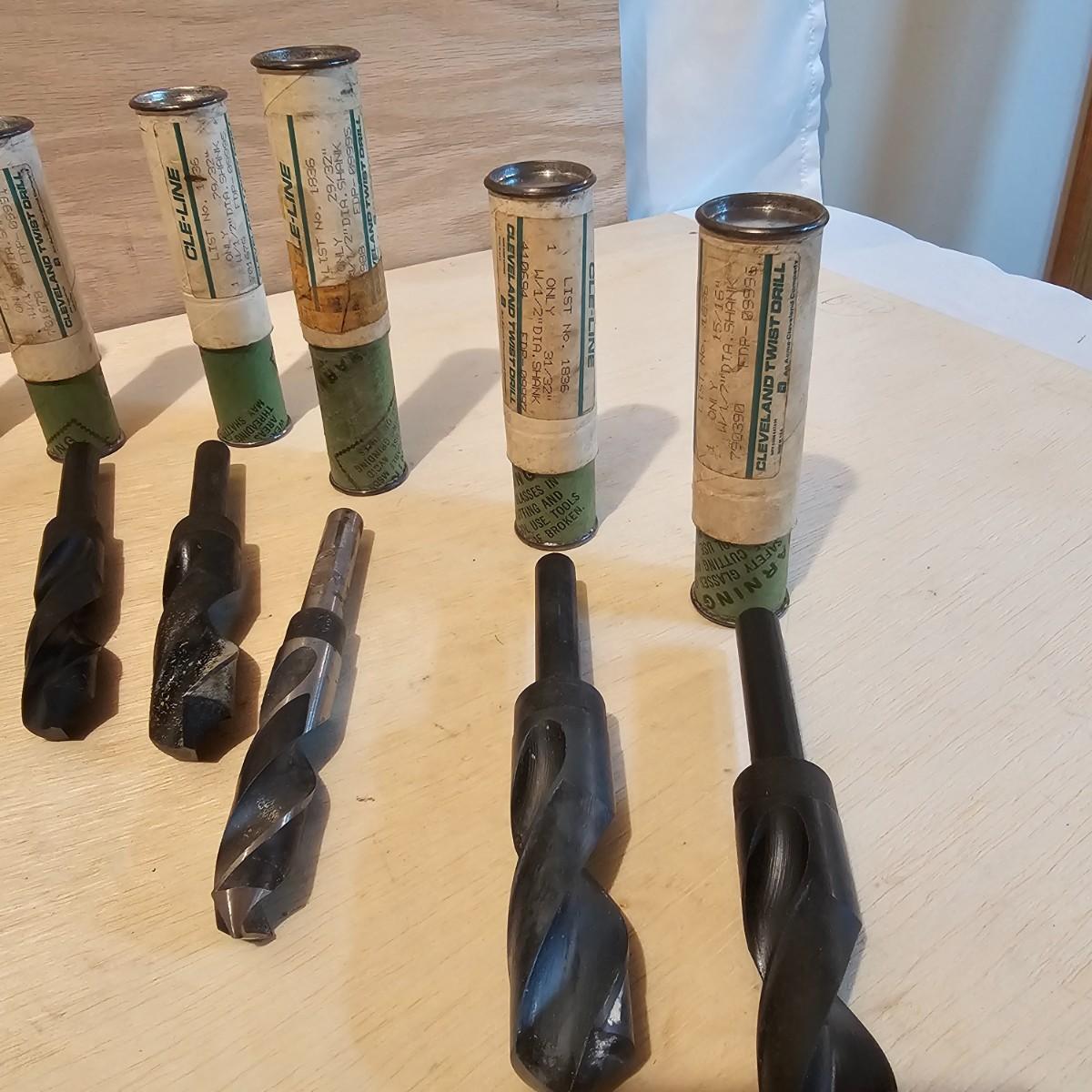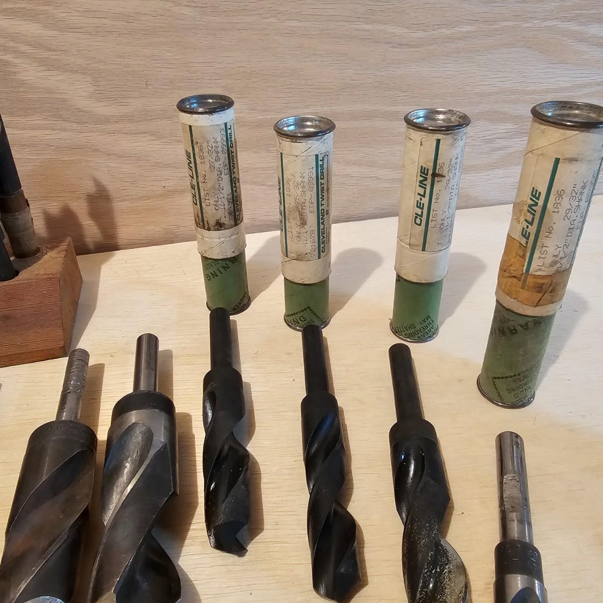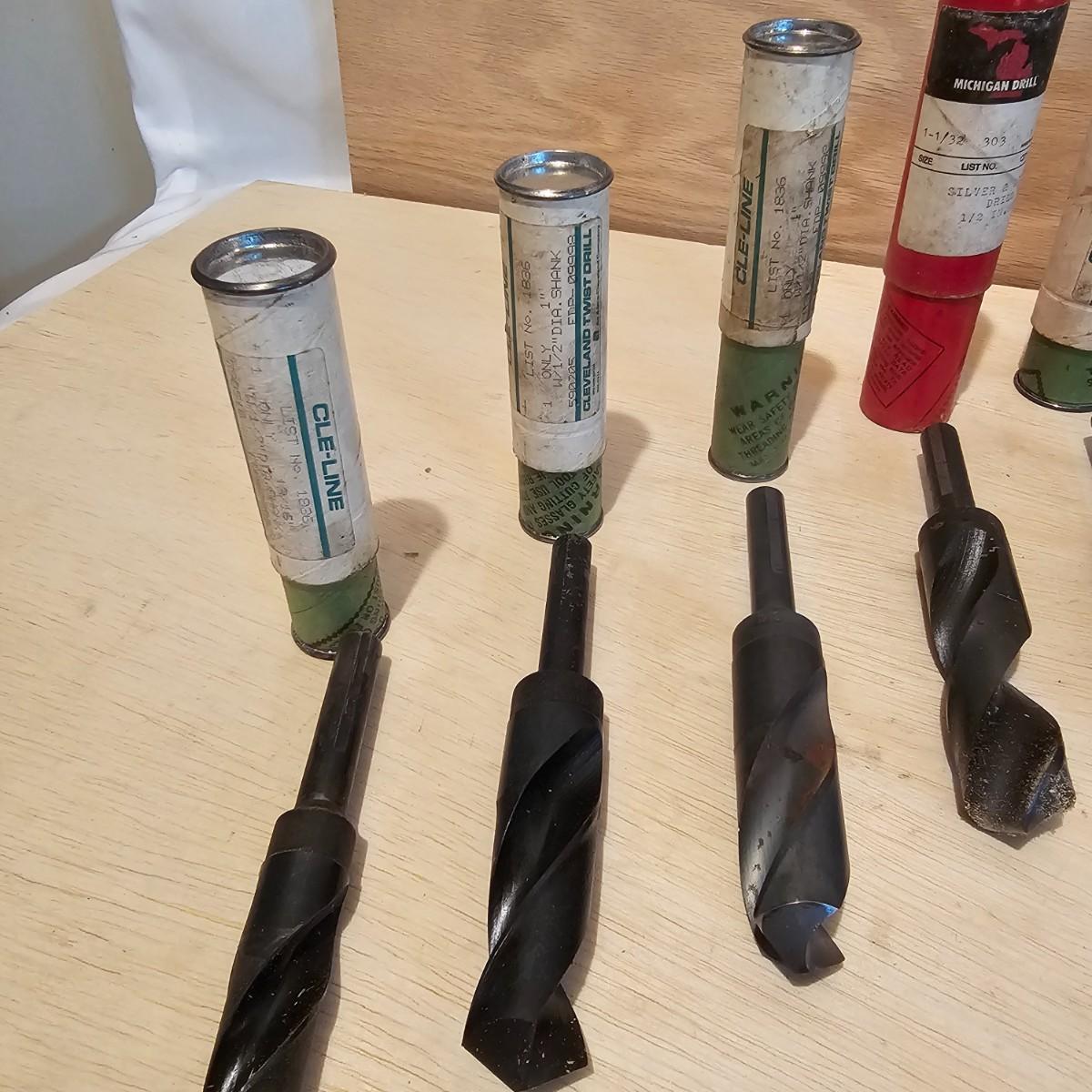 Large diameter drills for specialty work. All drills have 1/2" Shank to fit most frills and presses. Size diameters range from 19/32" to 1 3/16". Items by Champion, Michigan Drill, Cleveland Twist Drill. Items in used condition, over 30 pieces. See photos for details. Storage tub included. Local pickup only.