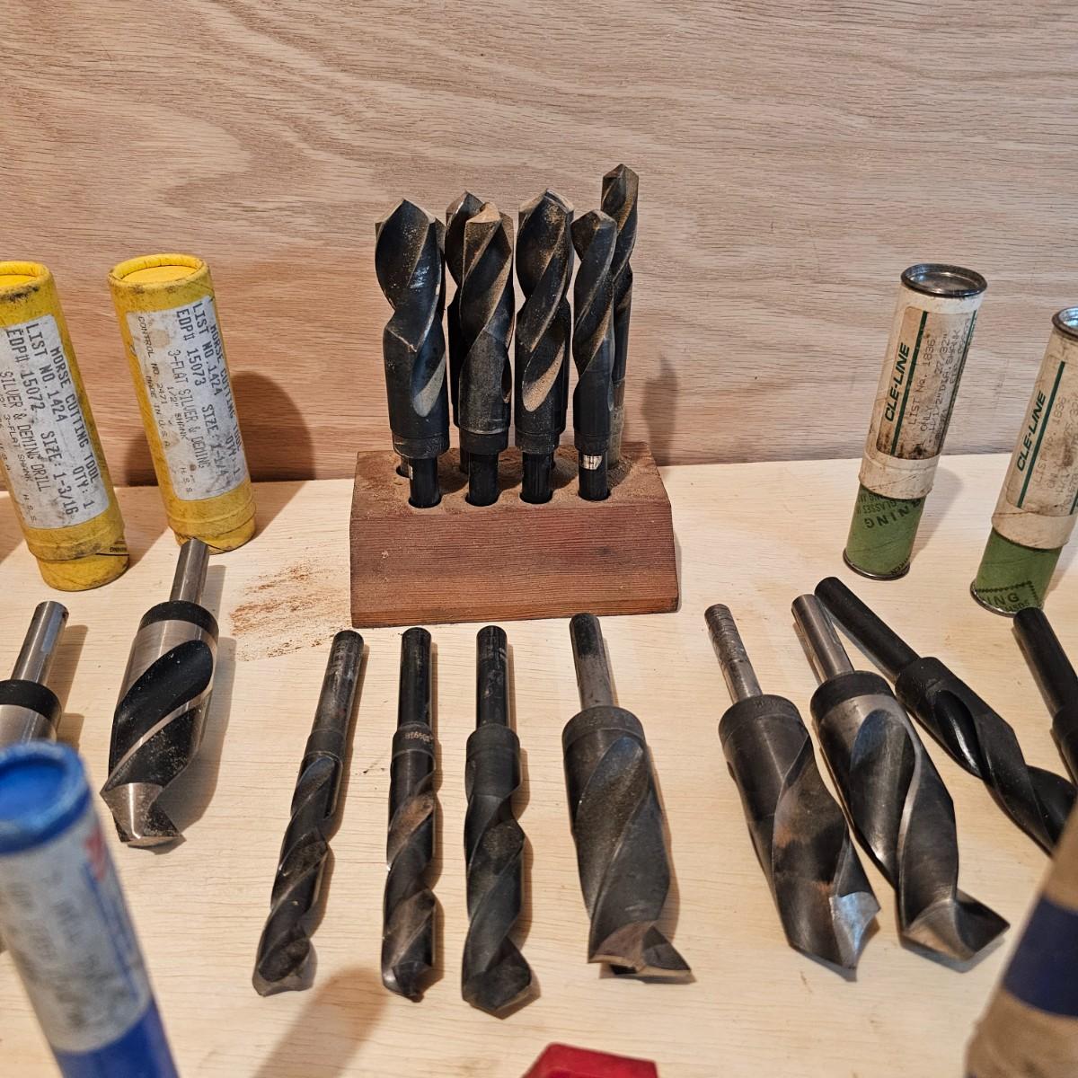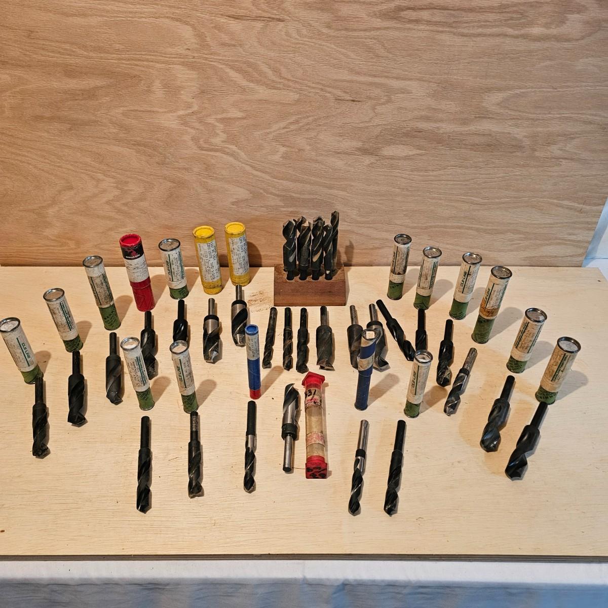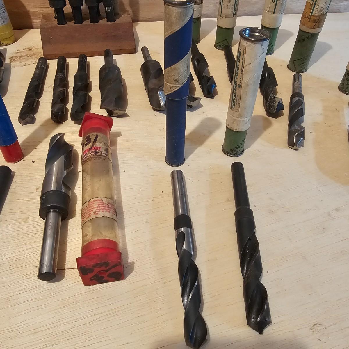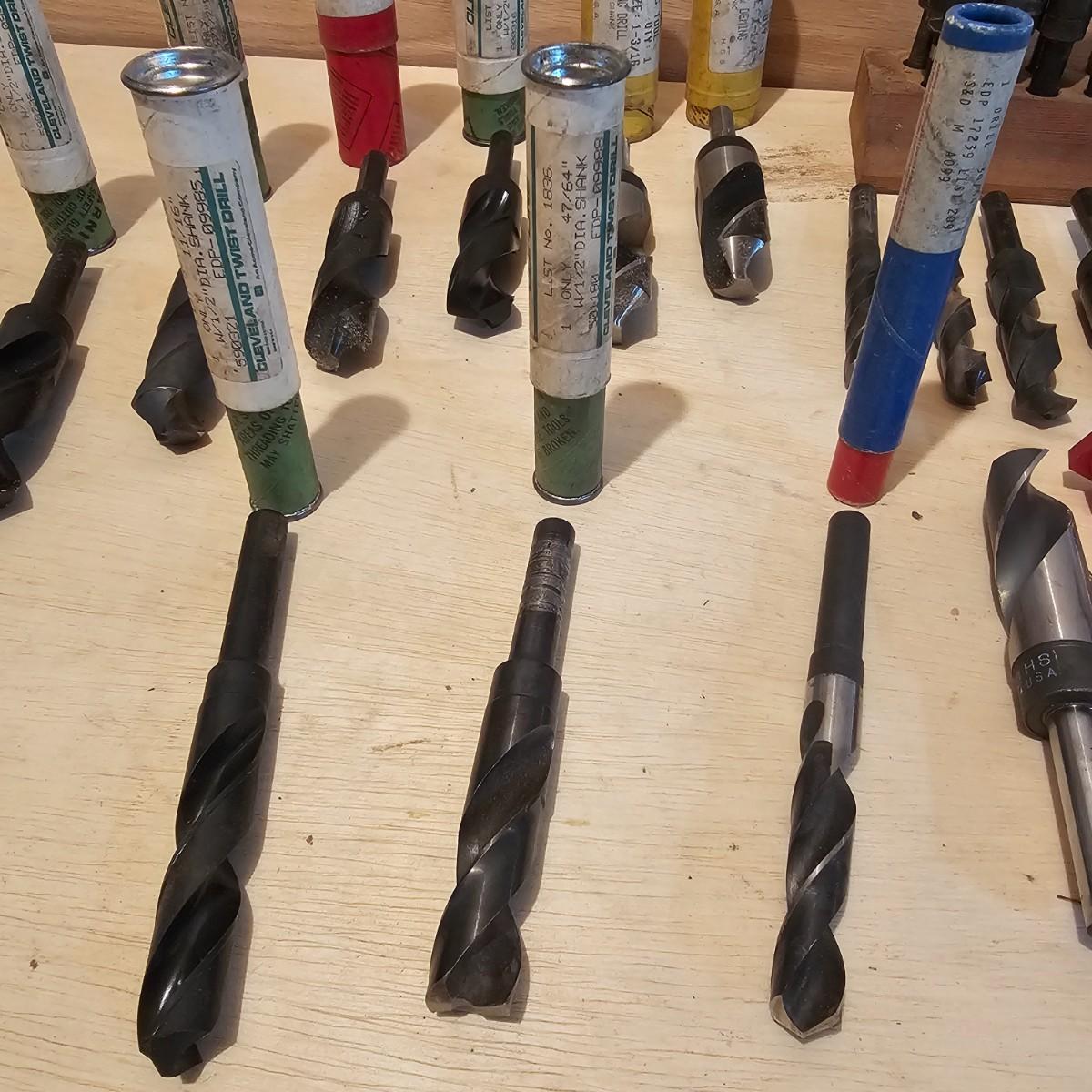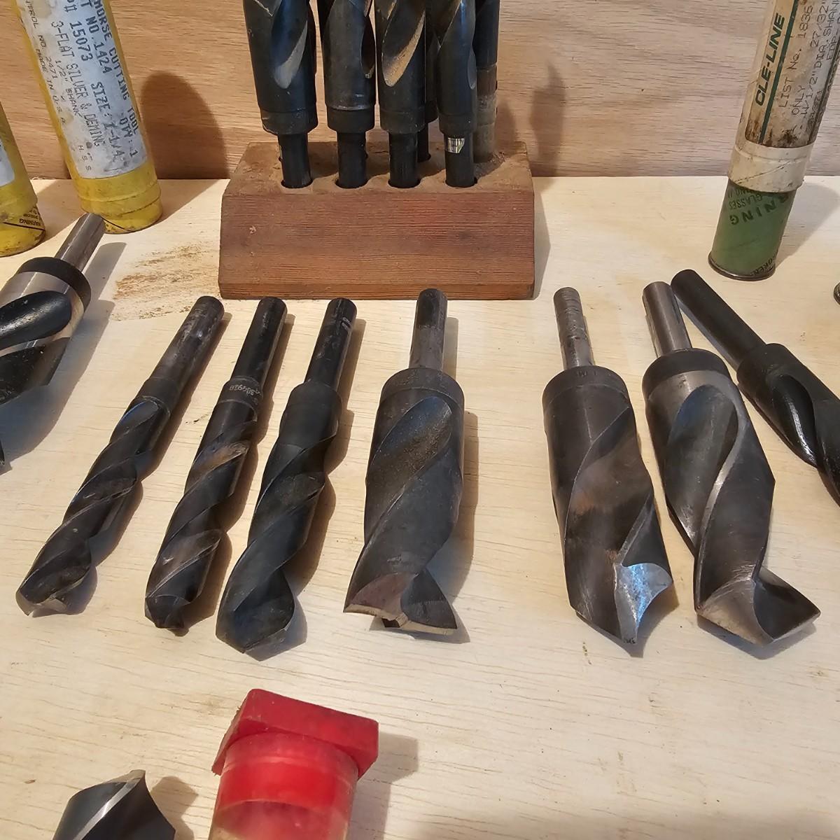 Large diameter drills for specialty work. All drills have 1/2" Shank to fit most frills and presses. Size diameters range from 19/32" to 1 3/16". Items by Champion, Michigan Drill, Cleveland Twist Drill. Items in used condition, over 30 pieces. See photos for details. Storage tub included. Local pickup only.