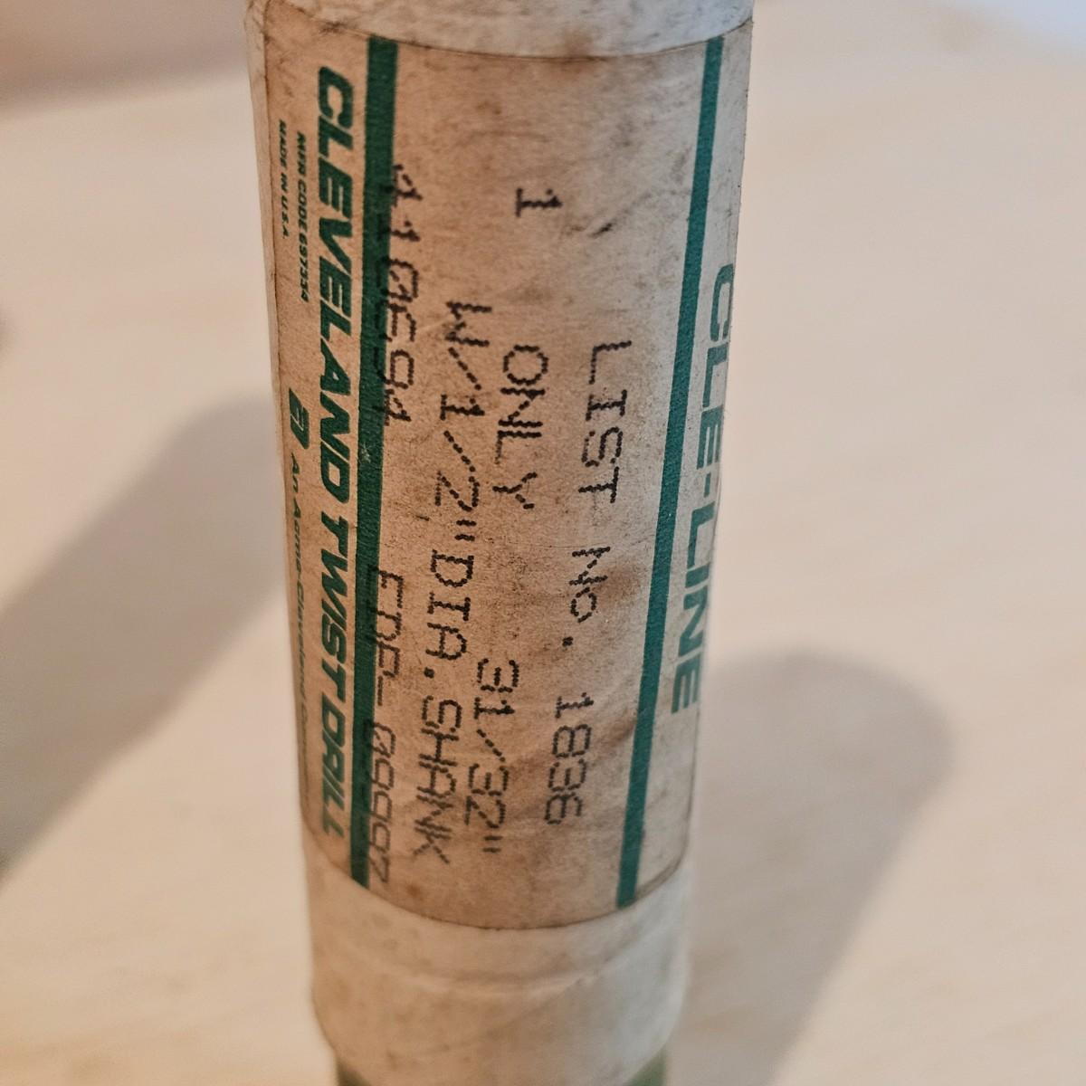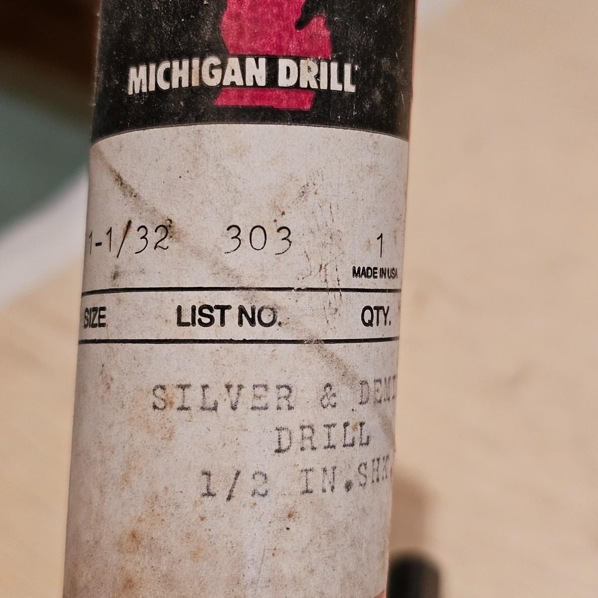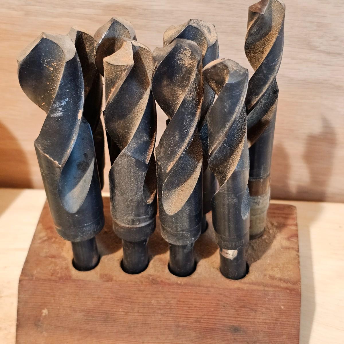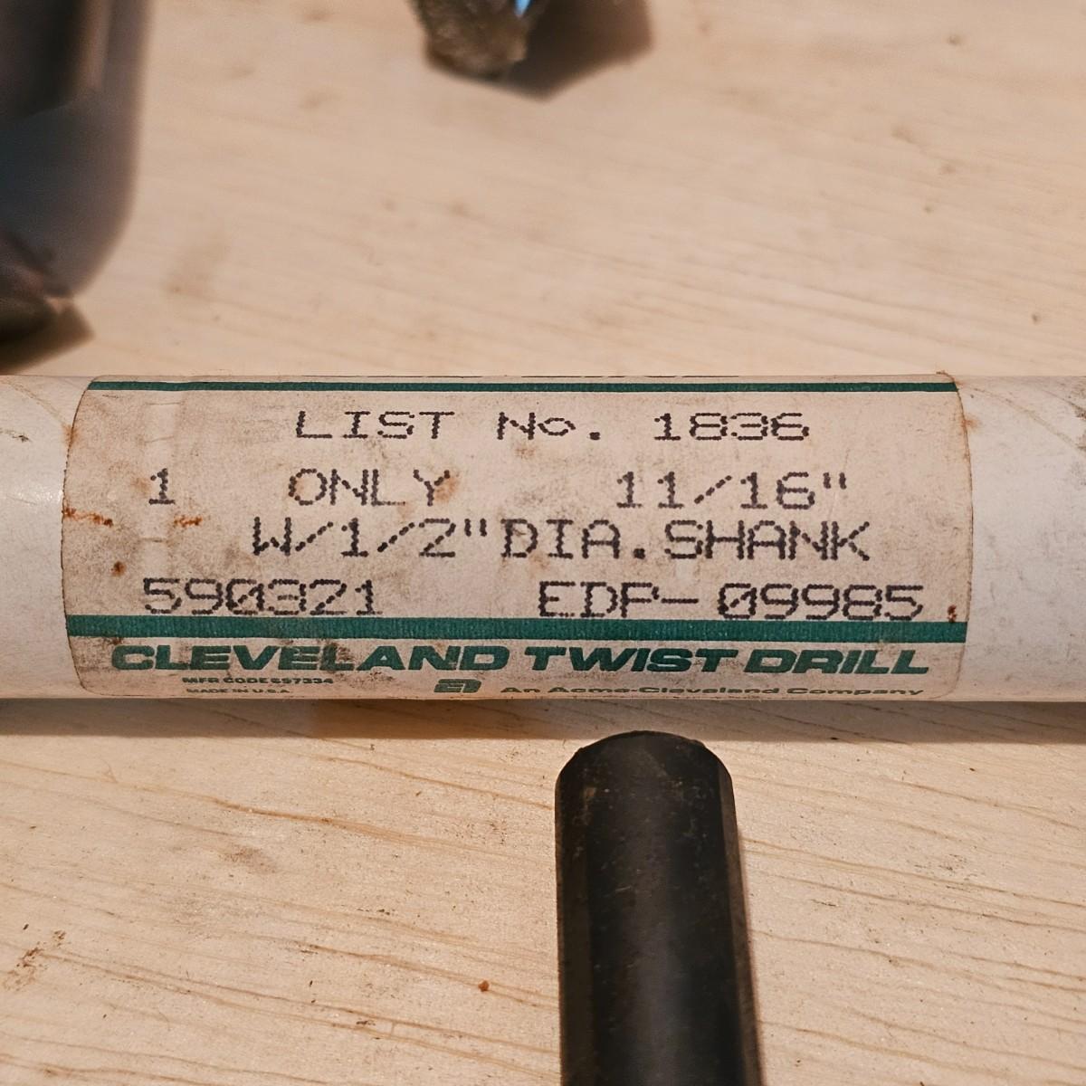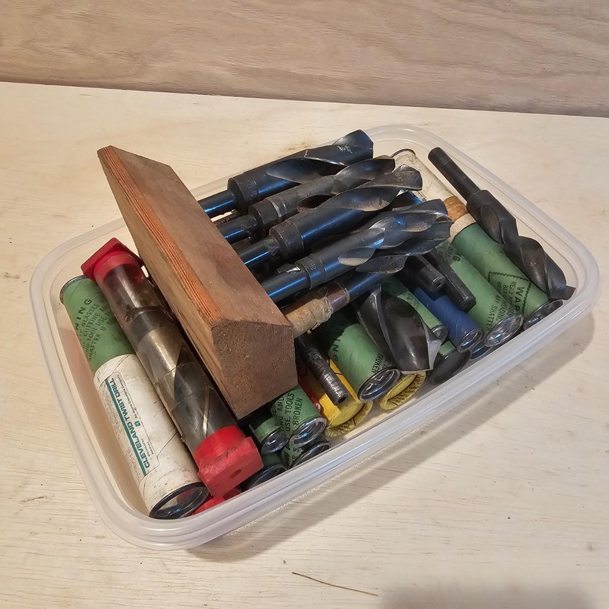 Large diameter drills for specialty work. All drills have 1/2" Shank to fit most frills and presses. Size diameters range from 19/32" to 1 3/16". Items by Champion, Michigan Drill, Cleveland Twist Drill. Items in used condition, over 30 pieces. See photos for details. Storage tub included. Local pickup only.