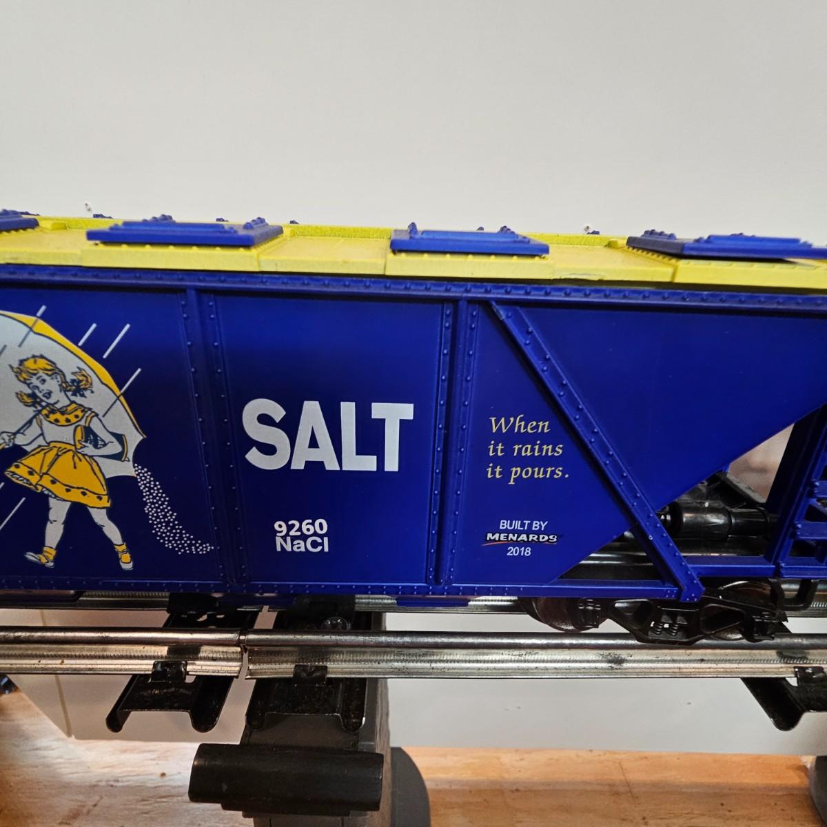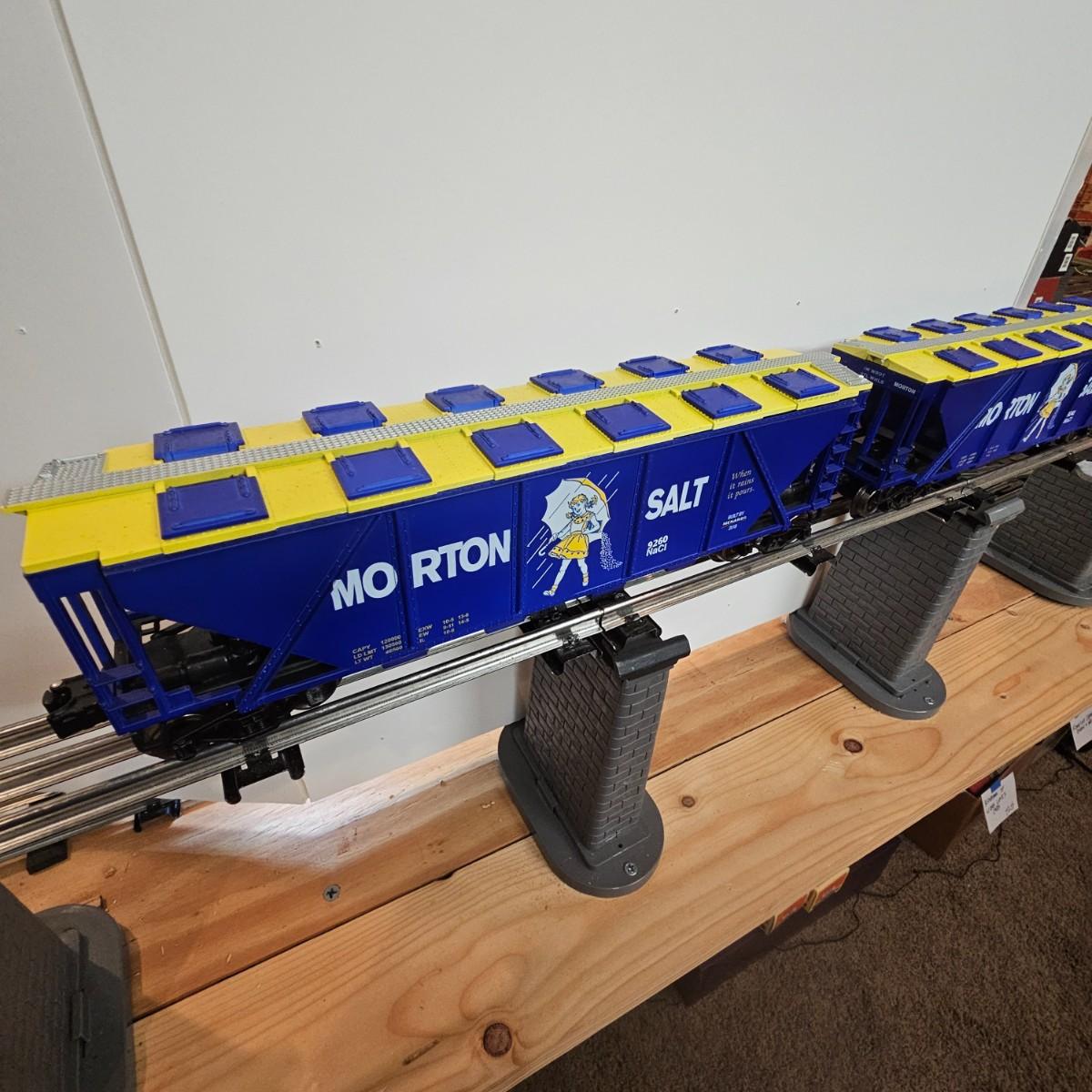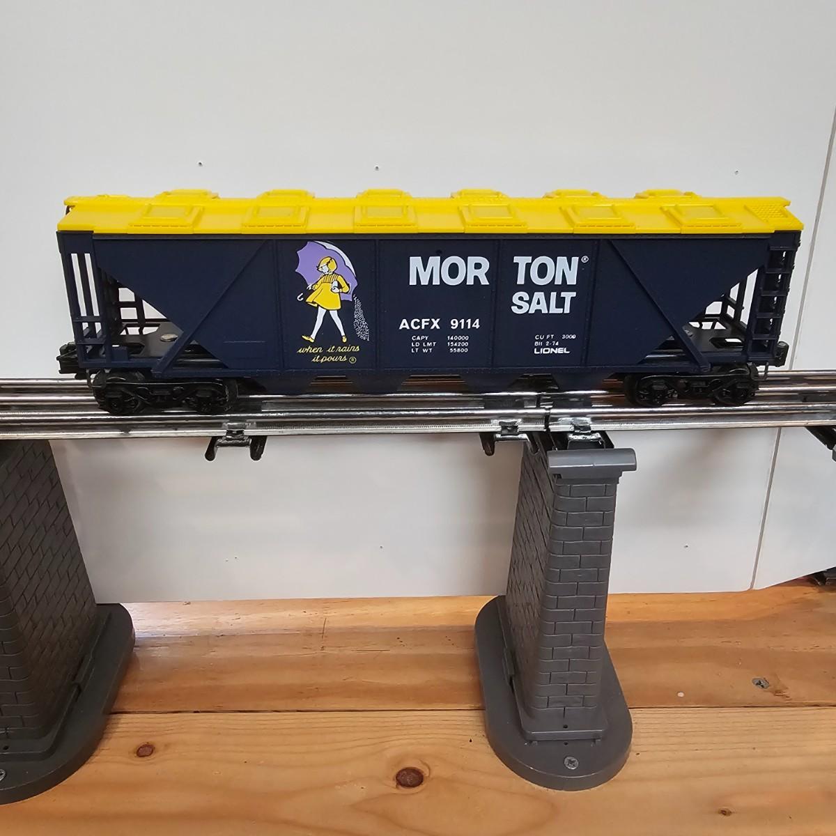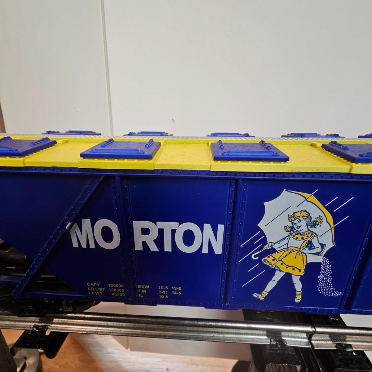Two story structure for delivery and receiving of Morton Salt products. Lots of LED lighting and animated billboards on sides of structure. Track opening for pull through commerce, also figures and scenery included. Building is 12" x 11" x 15"H, has AC power adapter included. To serve the industry, three covered hoppers in Morton Salt colors and lettering with opening hatches. Boxes for all items. See photos for details. Shipping available. Please note that any price tag seen on an item was not put there by Sterling Transitions and does not reflect the current value of the item.