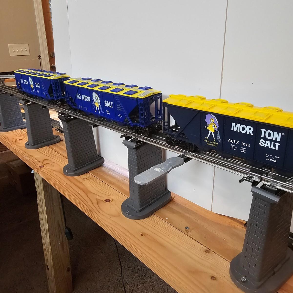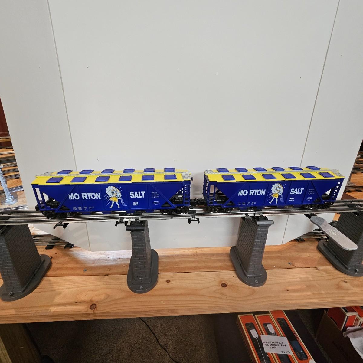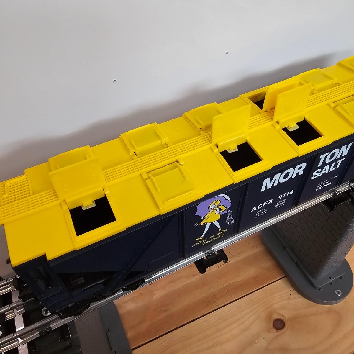 Two story structure for delivery and receiving of Morton Salt products. Lots of LED lighting and animated billboards on sides of structure. Track opening for pull through commerce, also figures and scenery included. Building is 12" x 11" x 15"H, has AC power adapter included. To serve the industry, three covered hoppers in Morton Salt colors and lettering with opening hatches. Boxes for all items. See photos for details. Shipping available. Please note that any price tag seen on an item was not put there by Sterling Transitions and does not reflect the current value of the item.