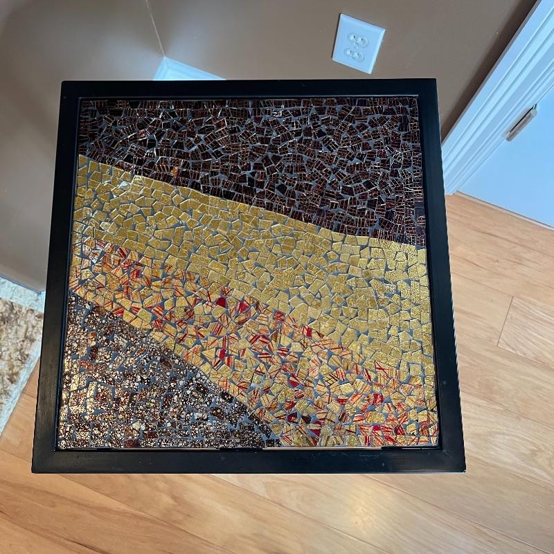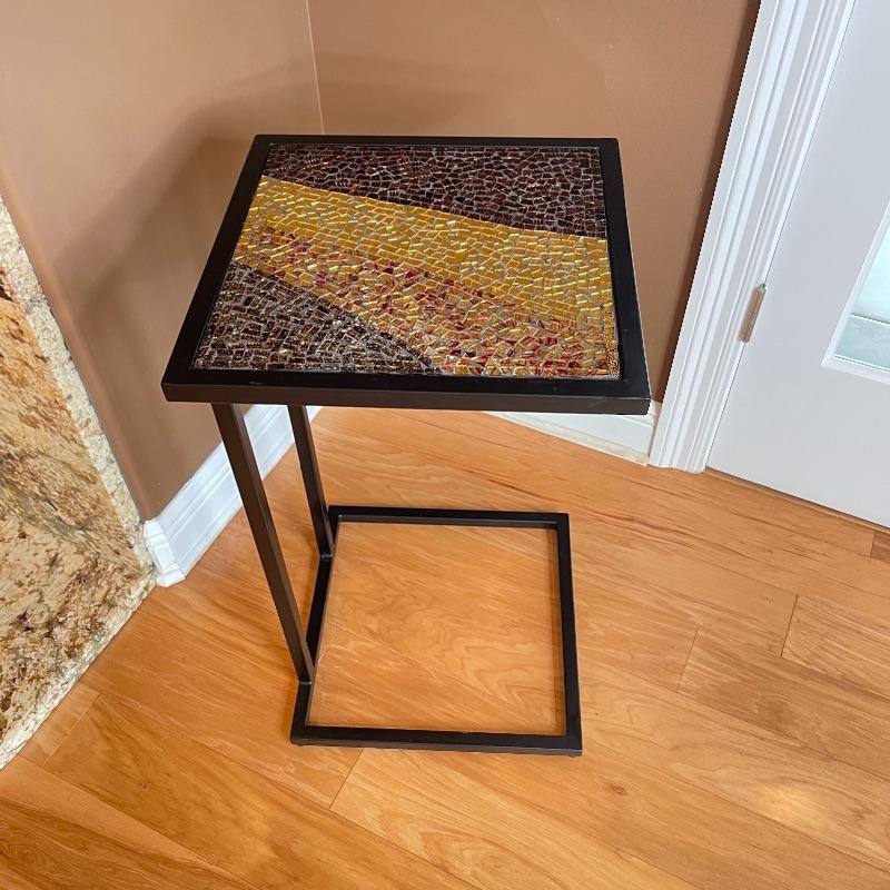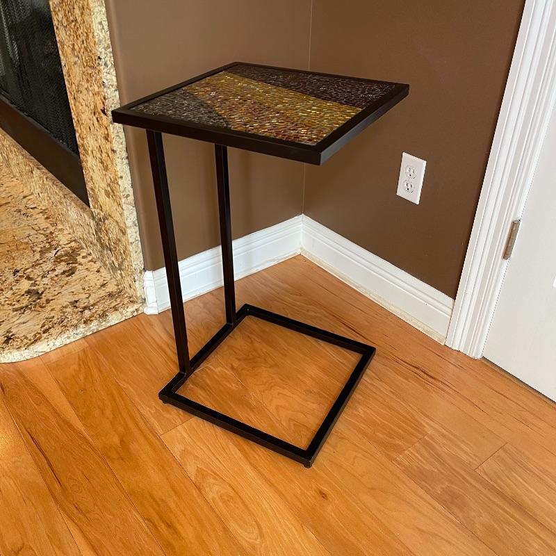 Cute side table with flecks of gold, red, and browns. Black iron.