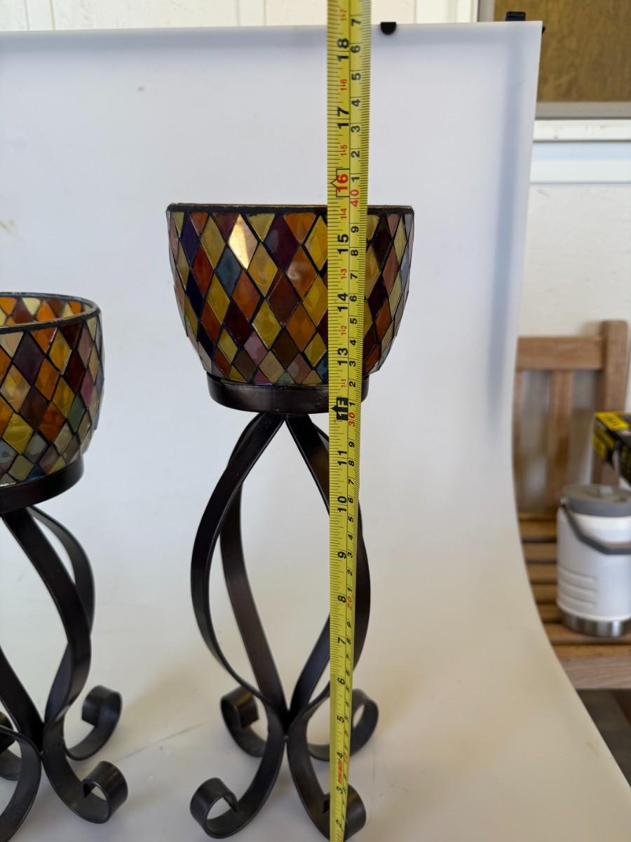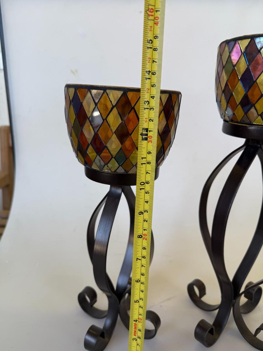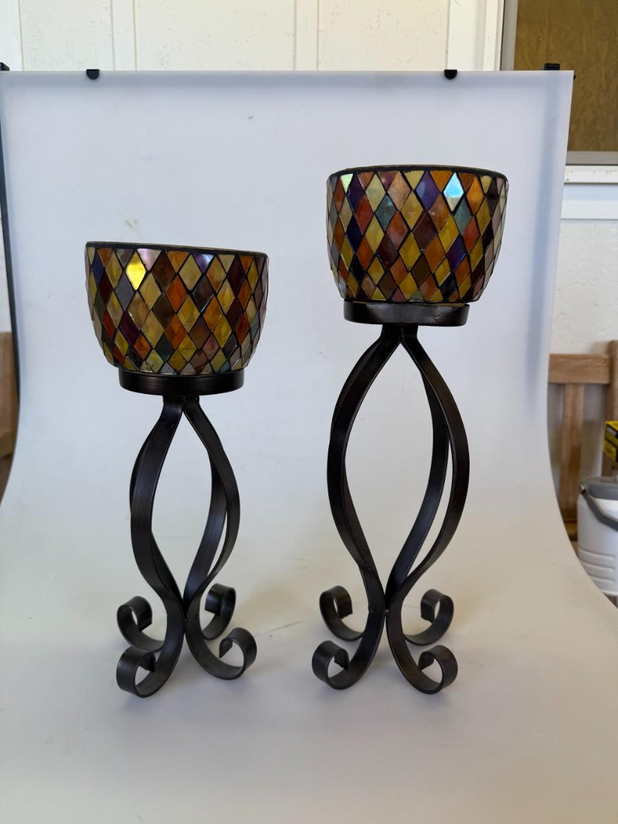 Set of two mosaic-style glass candle holders on tall black wrought iron stands.