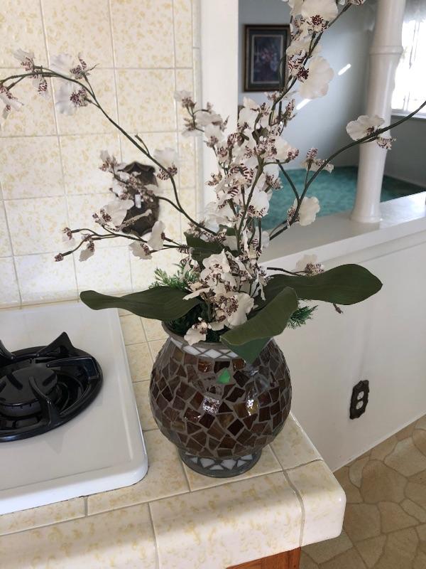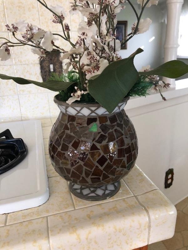 Beautiful mosaic fish bowl like planter with an artificial orchid plant inside. May be dusty from display.