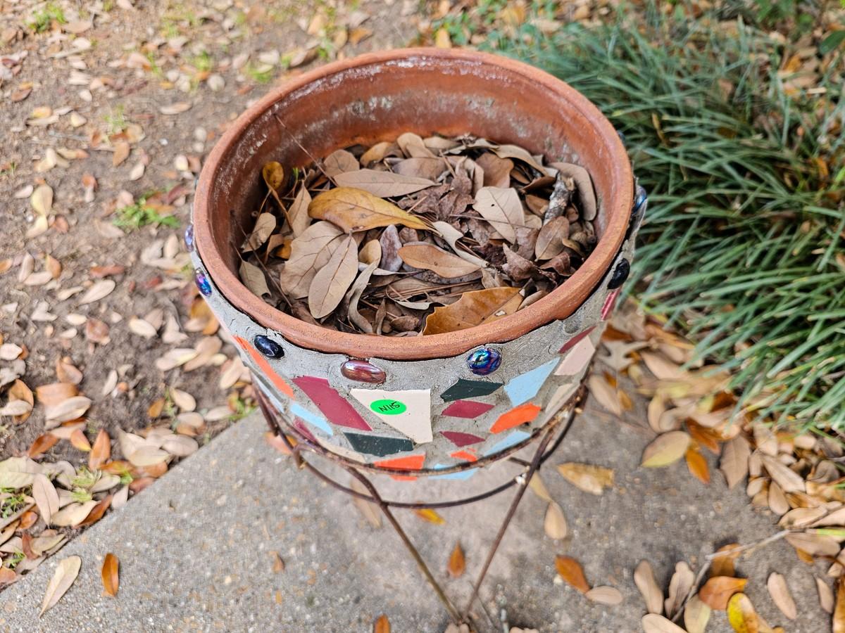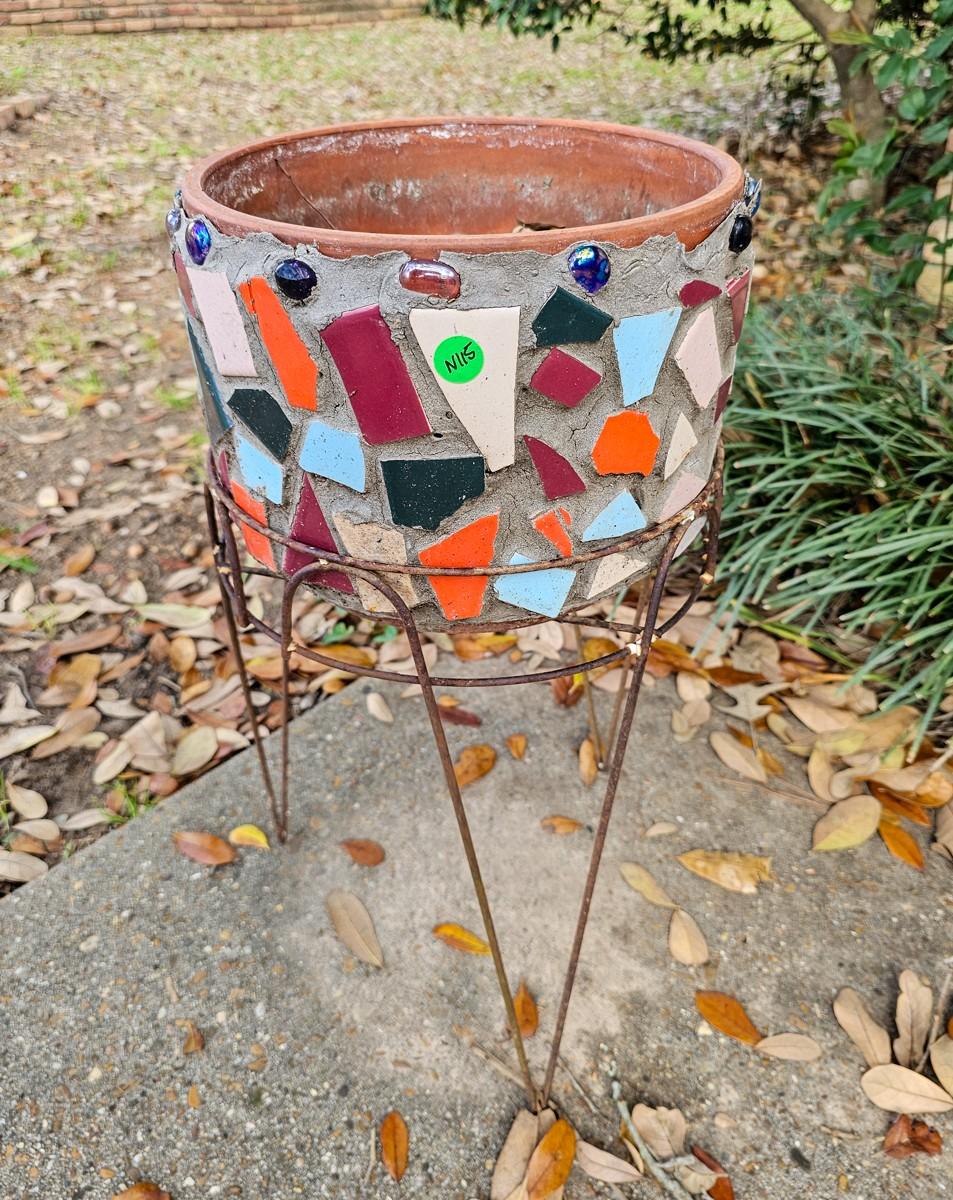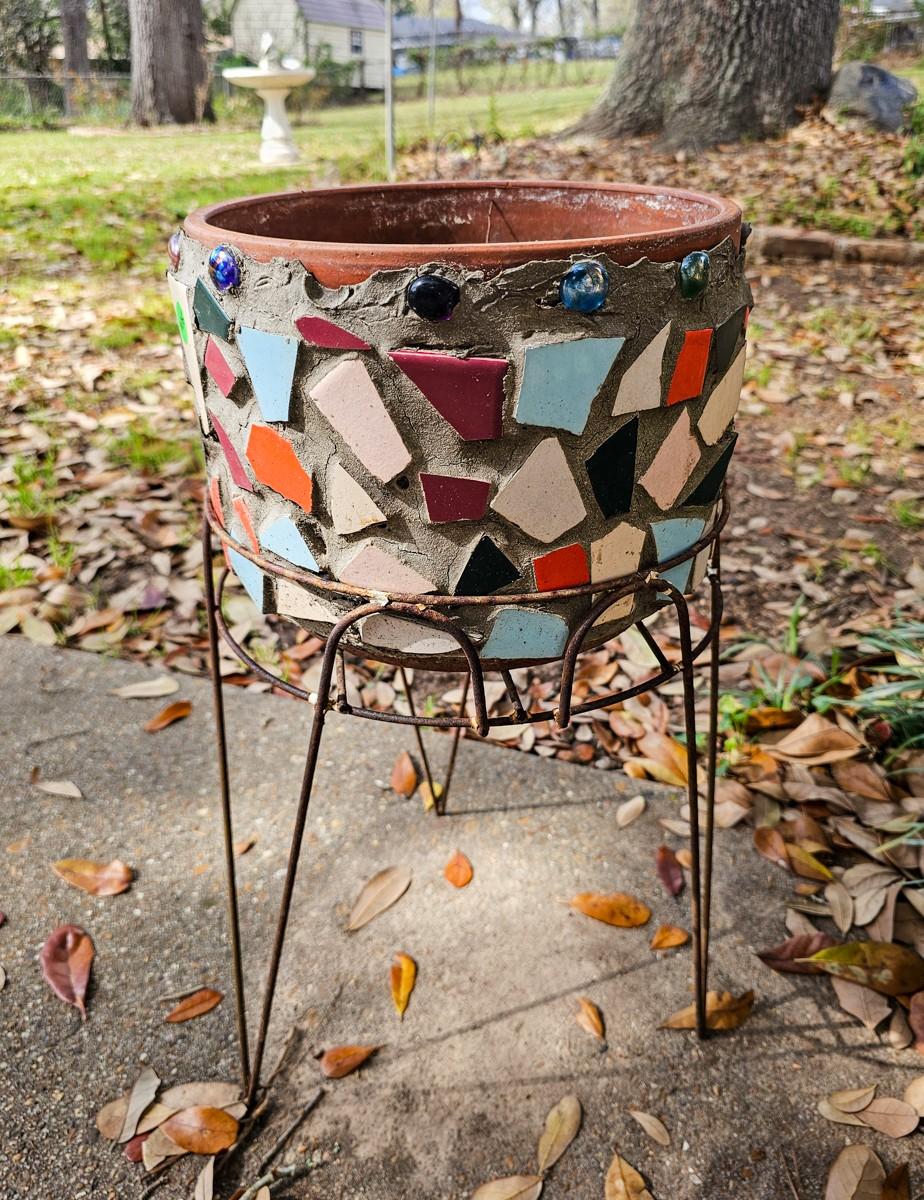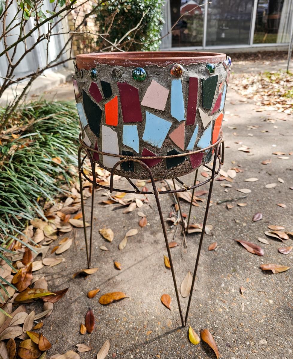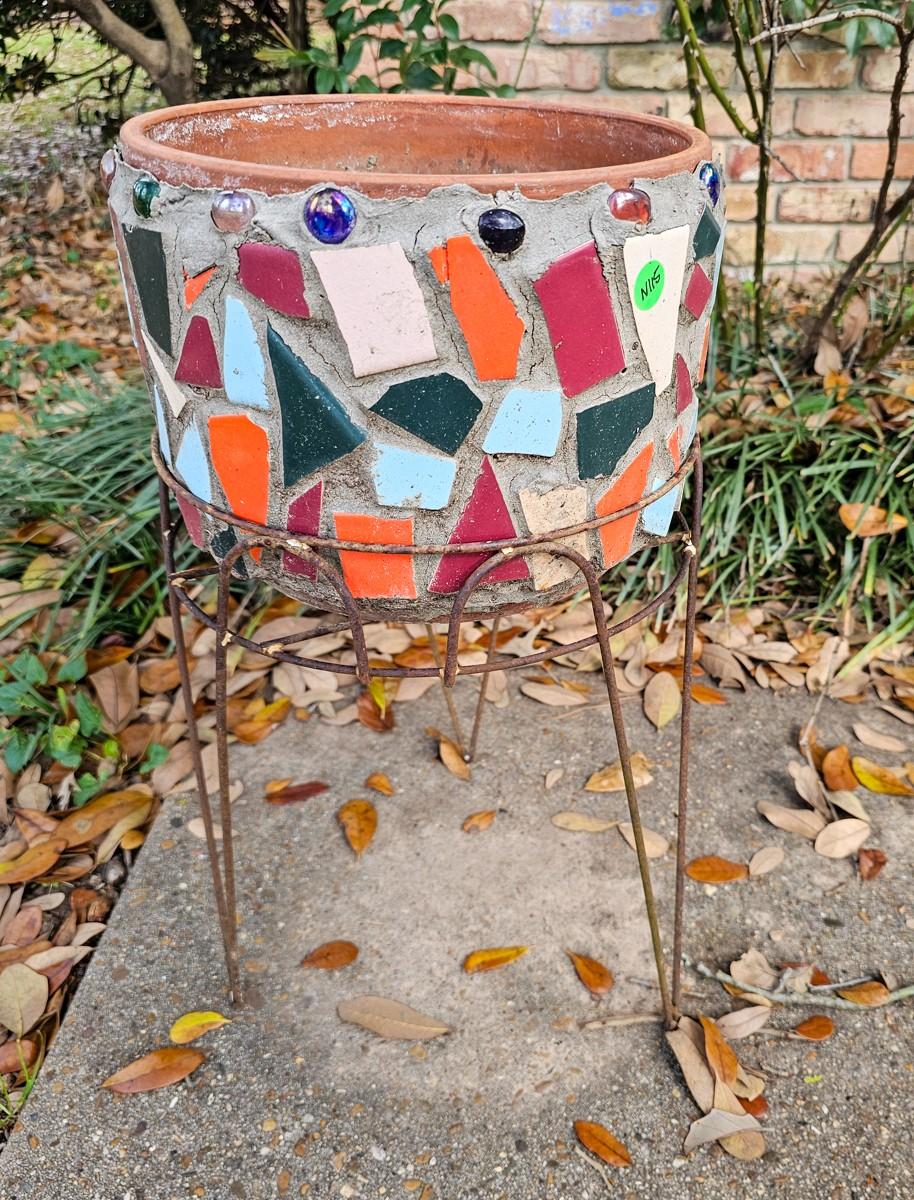 Terracotta pot with fun mosiac on wrought iron stand with hairpin legs.