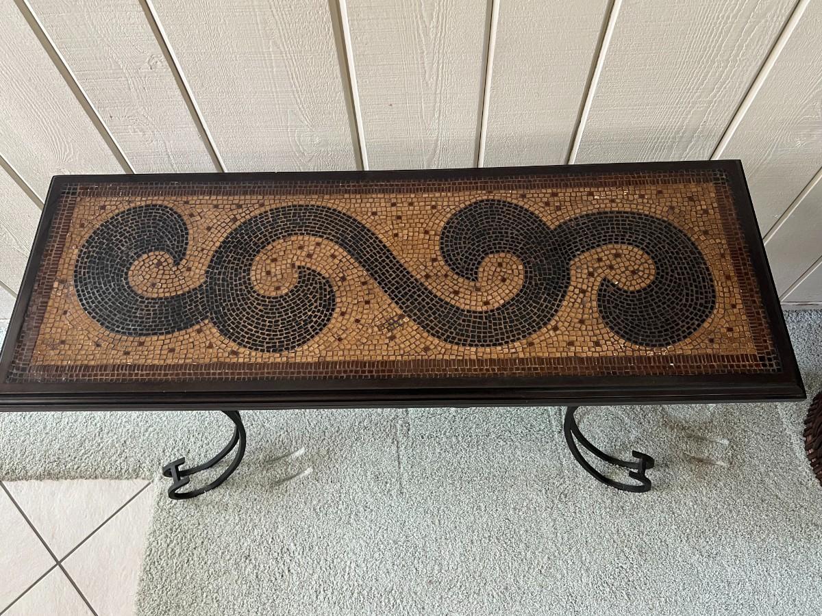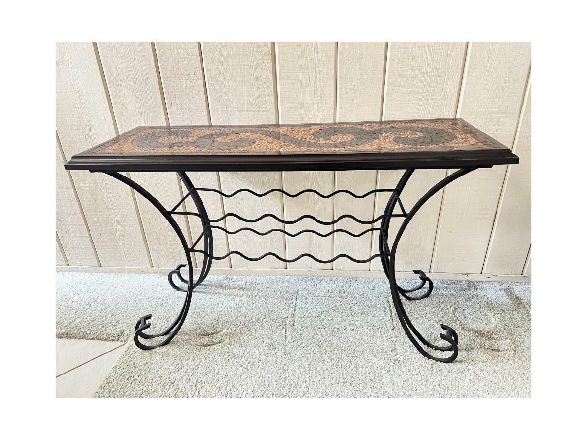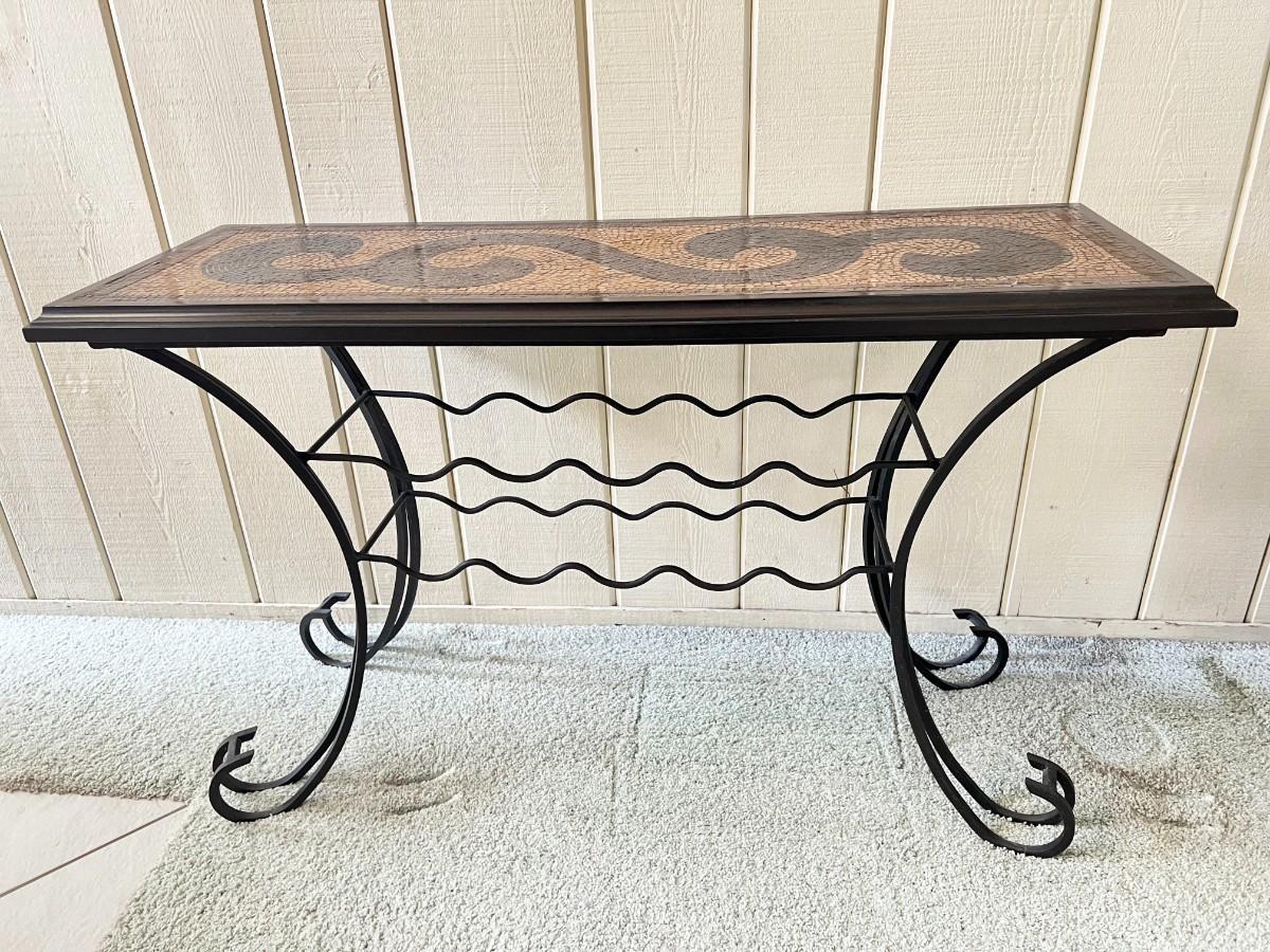Mosaic Tile & Black Metal Wine Rack Console Table. In good condition. Looks to hold 10 bottles in wire rack.