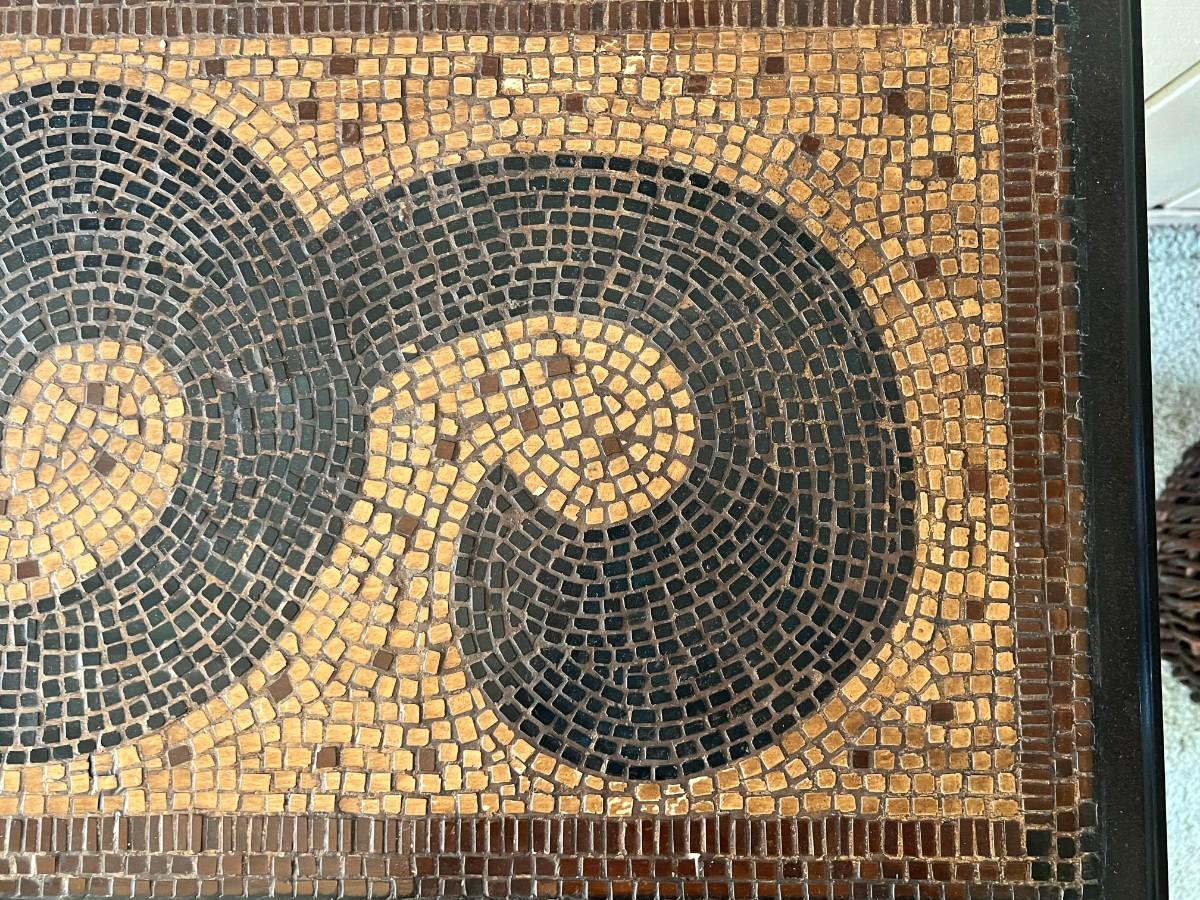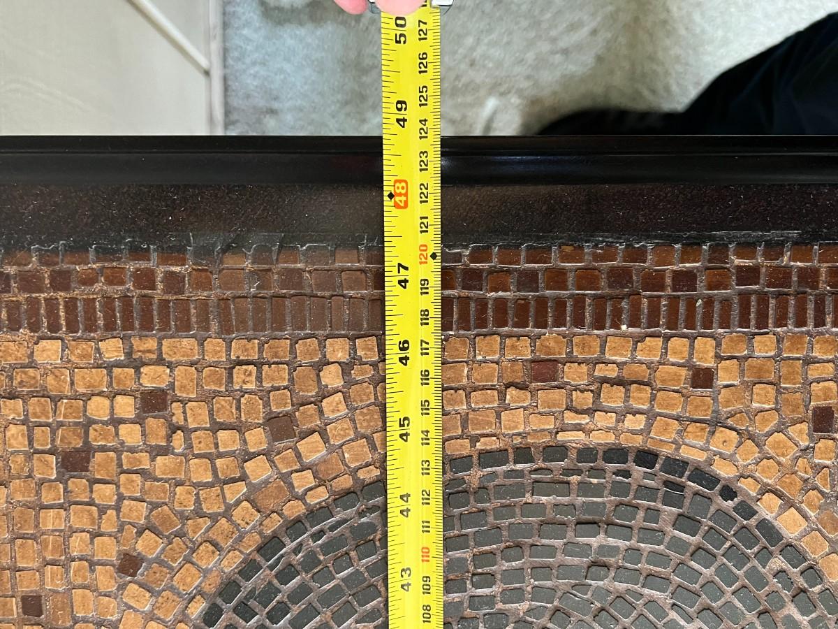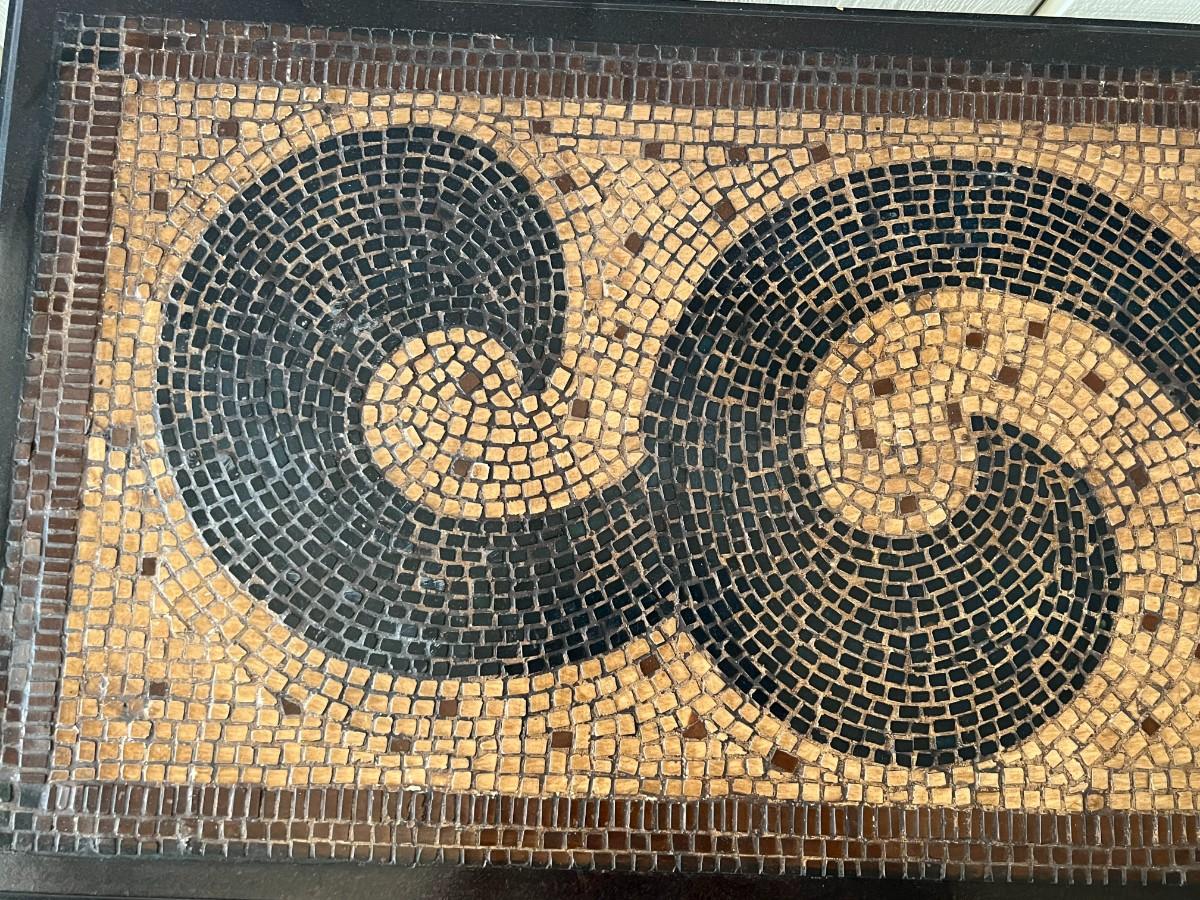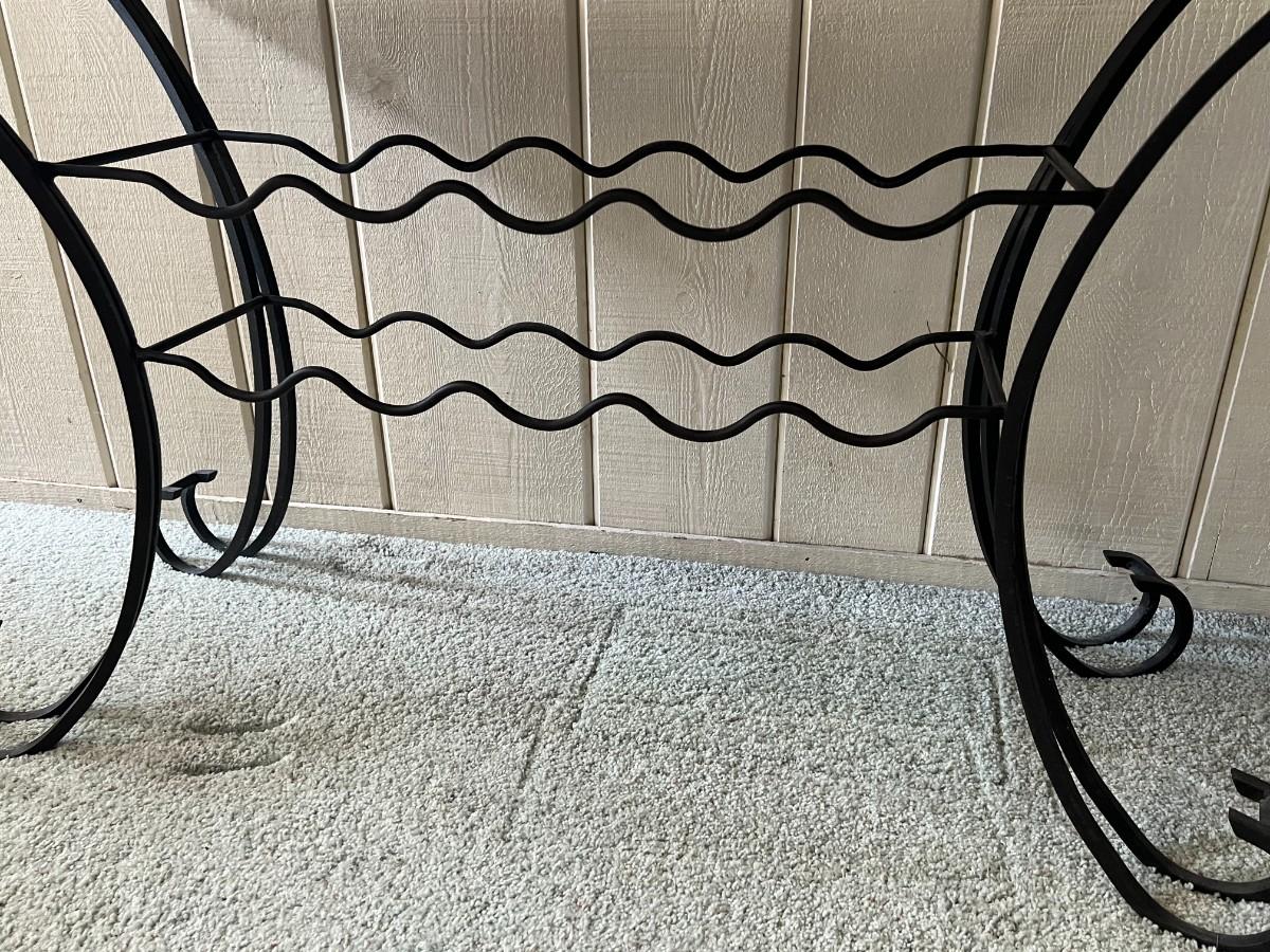 Mosaic Tile & Black Metal Wine Rack Console Table. In good condition. Looks to hold 10 bottles in wire rack.