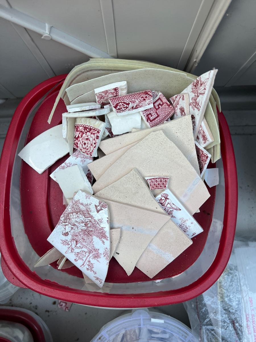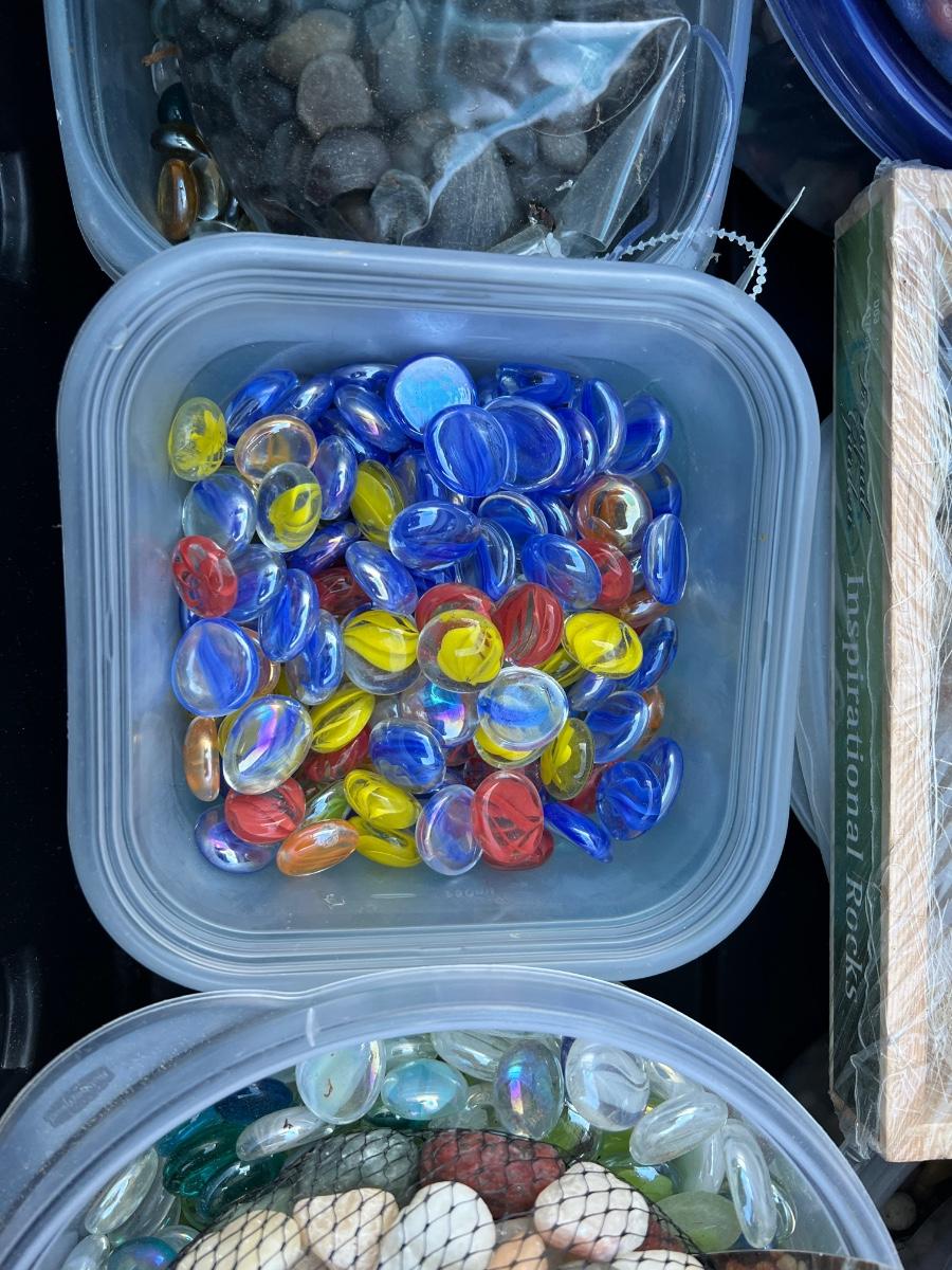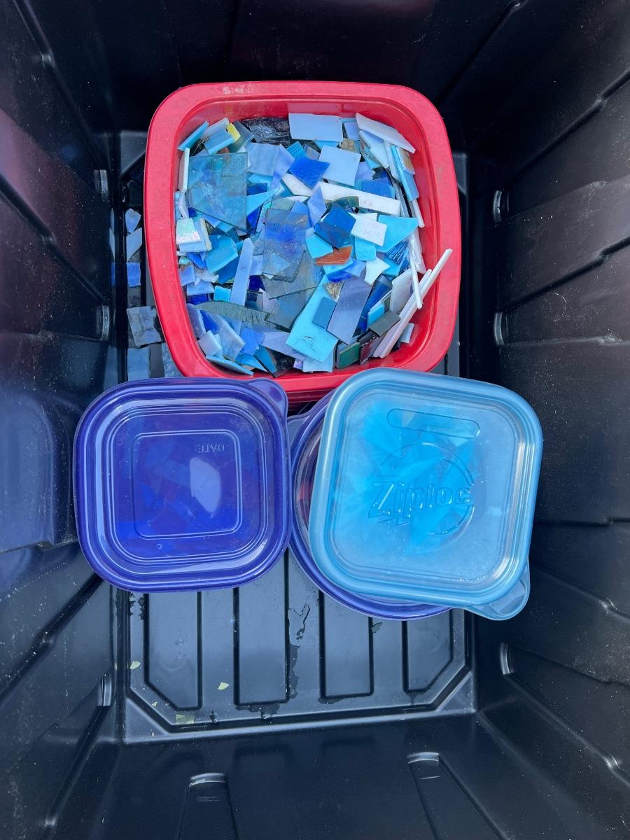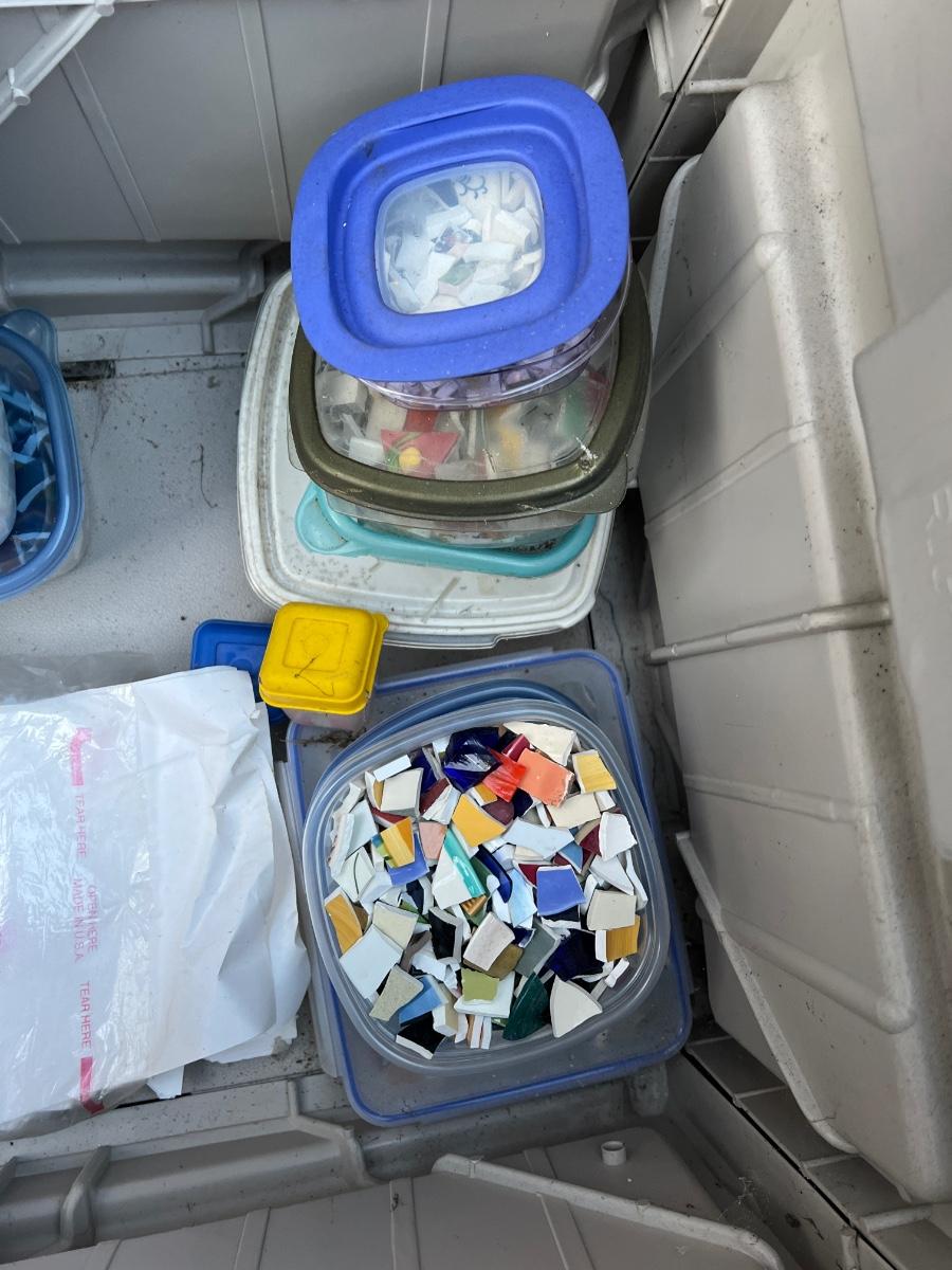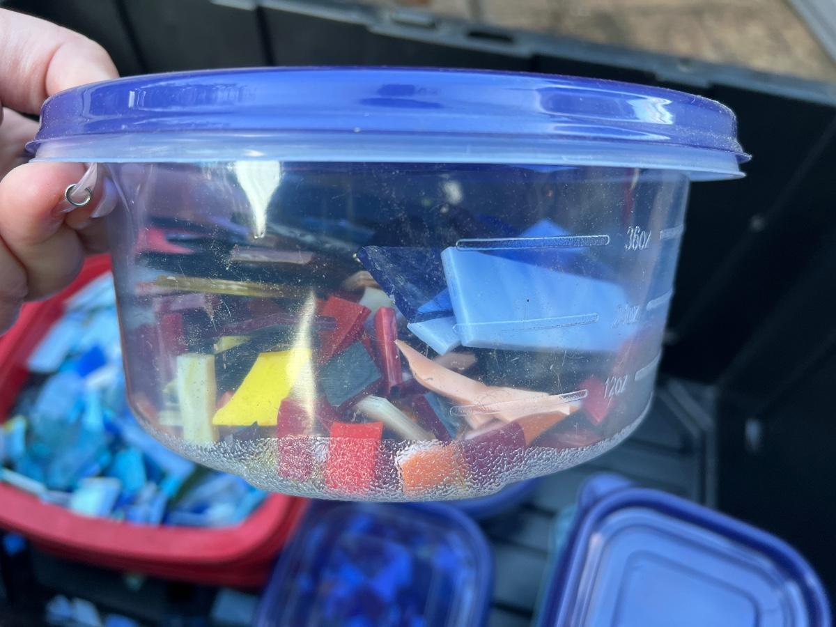 This lot includes mosaic and stained glass crafting supplies such as broken tiles pieces, rocks, stained glass sheets and broken pieces, and stained glass patterns.
