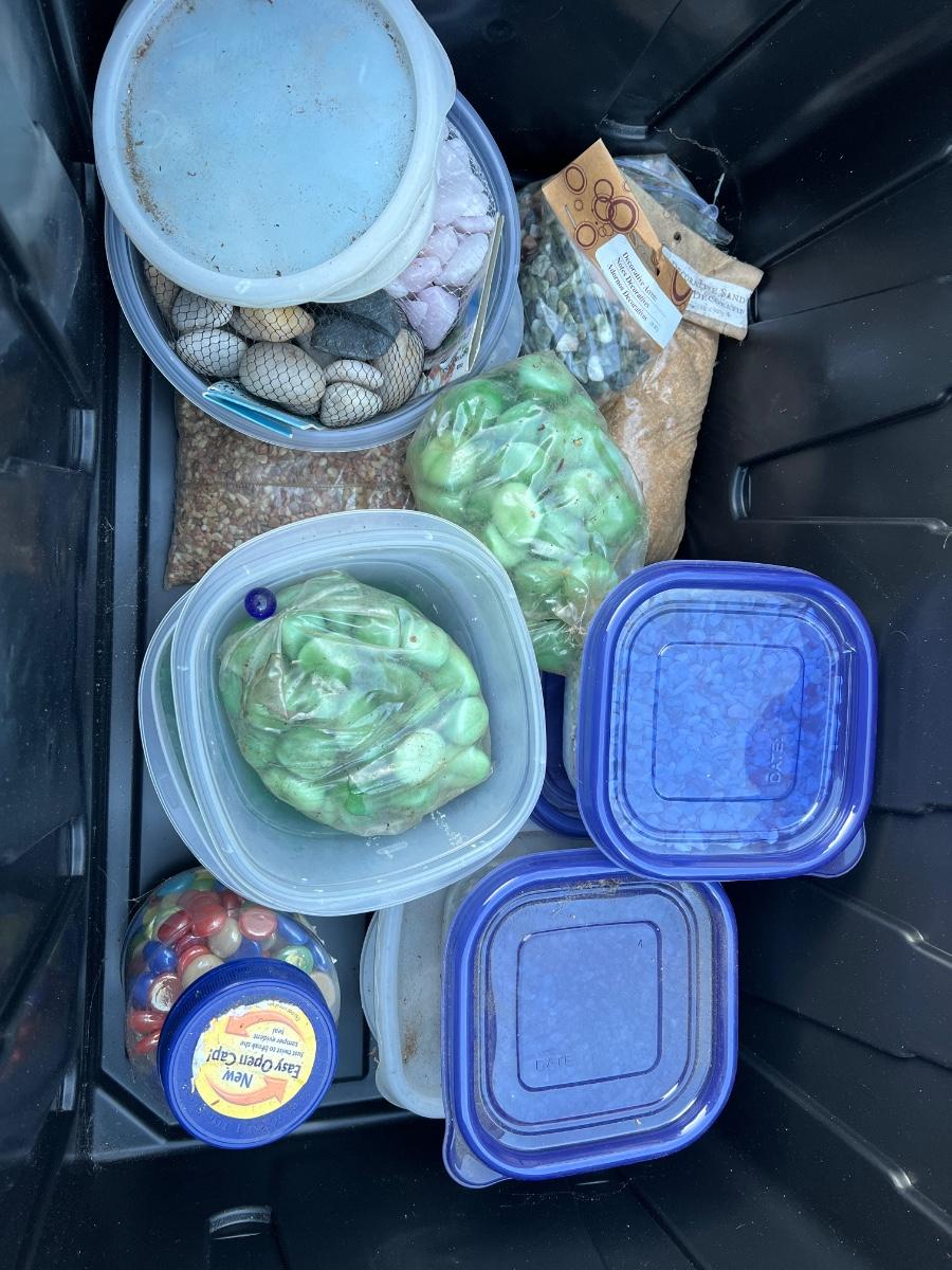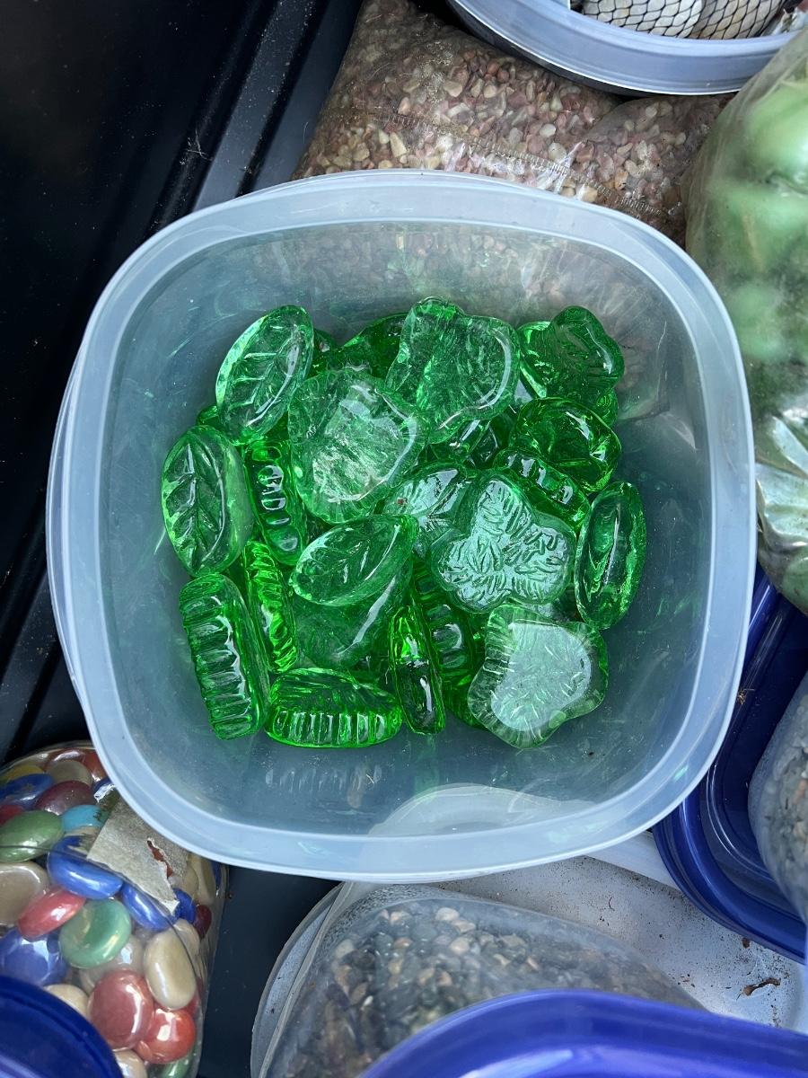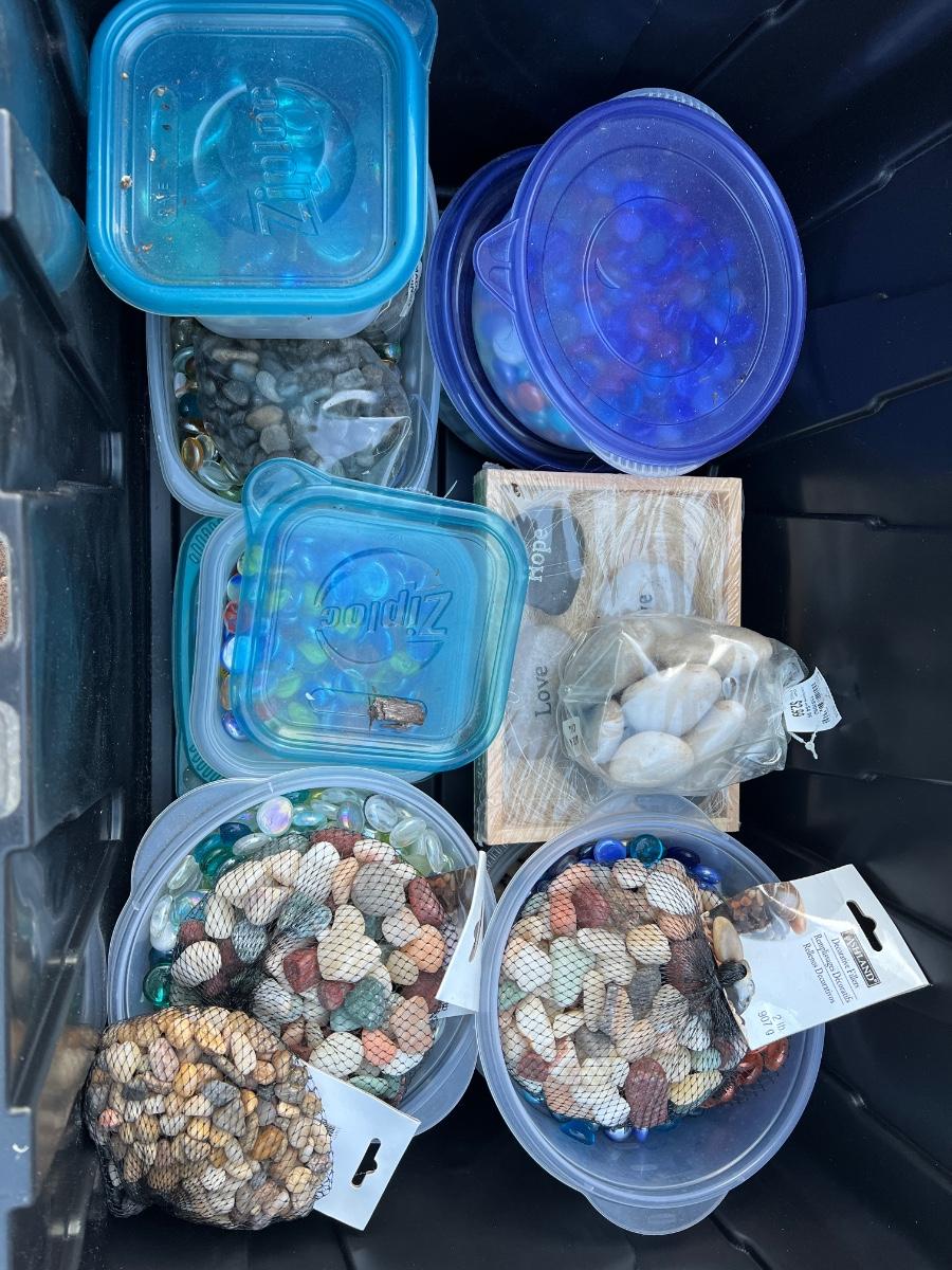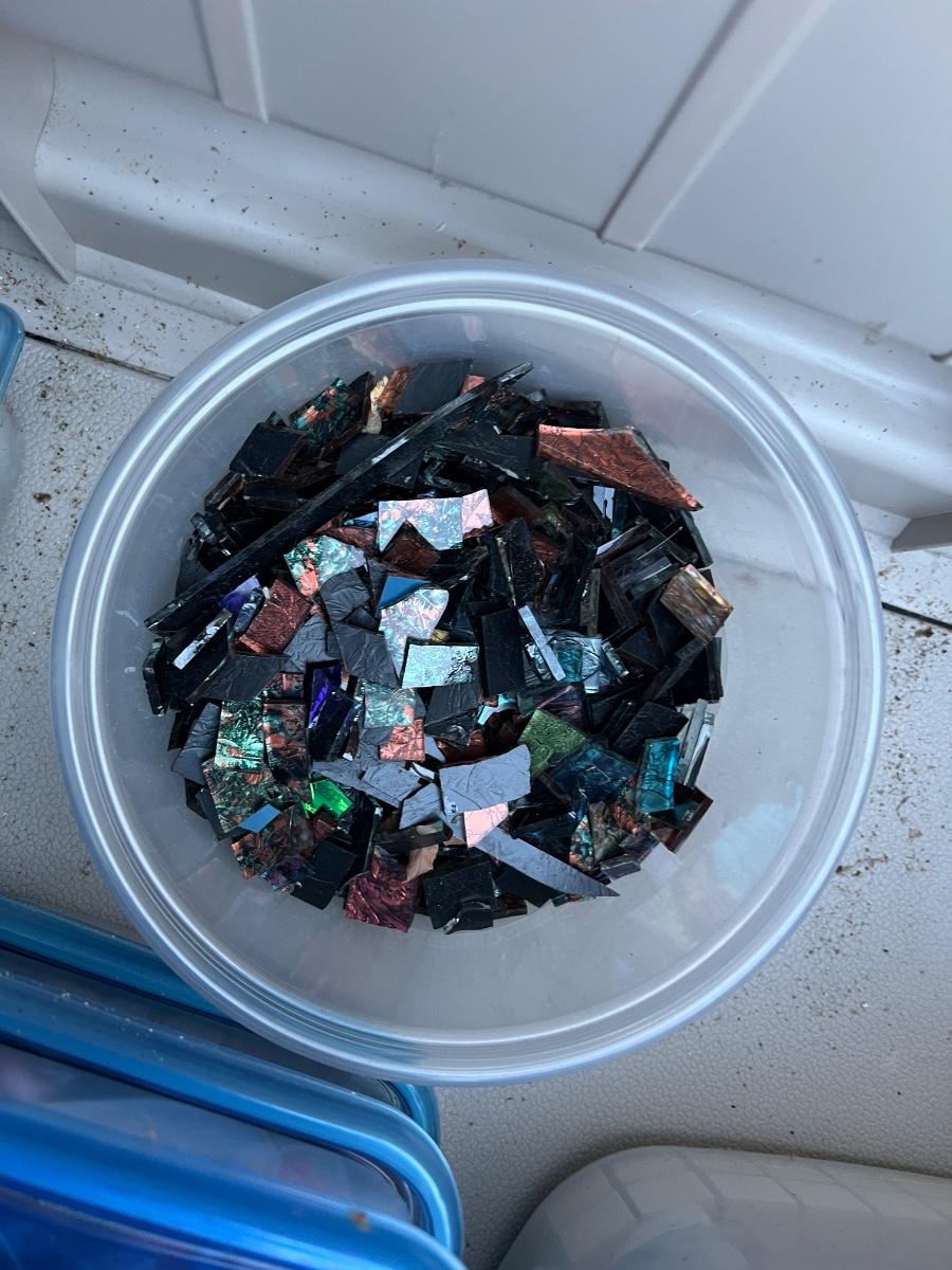 This lot includes mosaic and stained glass crafting supplies such as broken tiles pieces, rocks, stained glass sheets and broken pieces, and stained glass patterns.