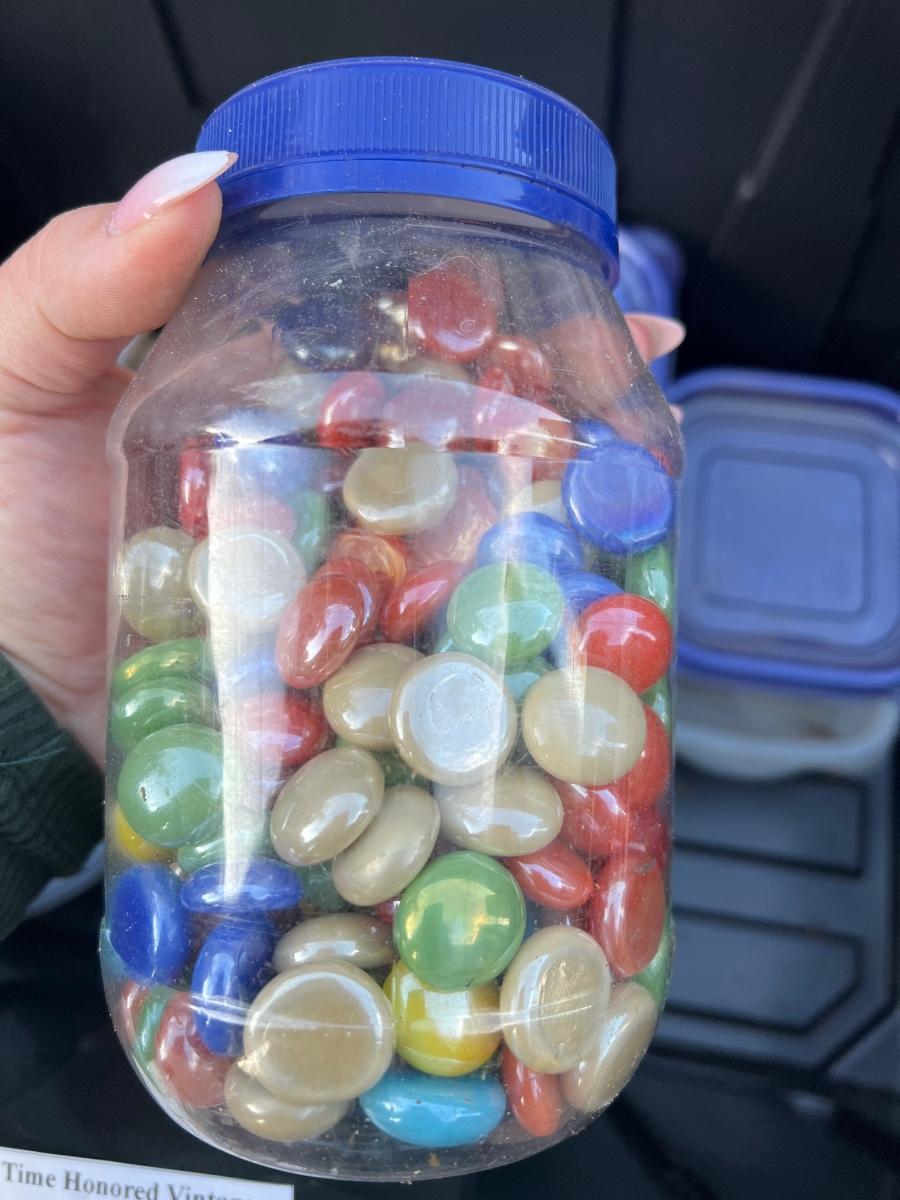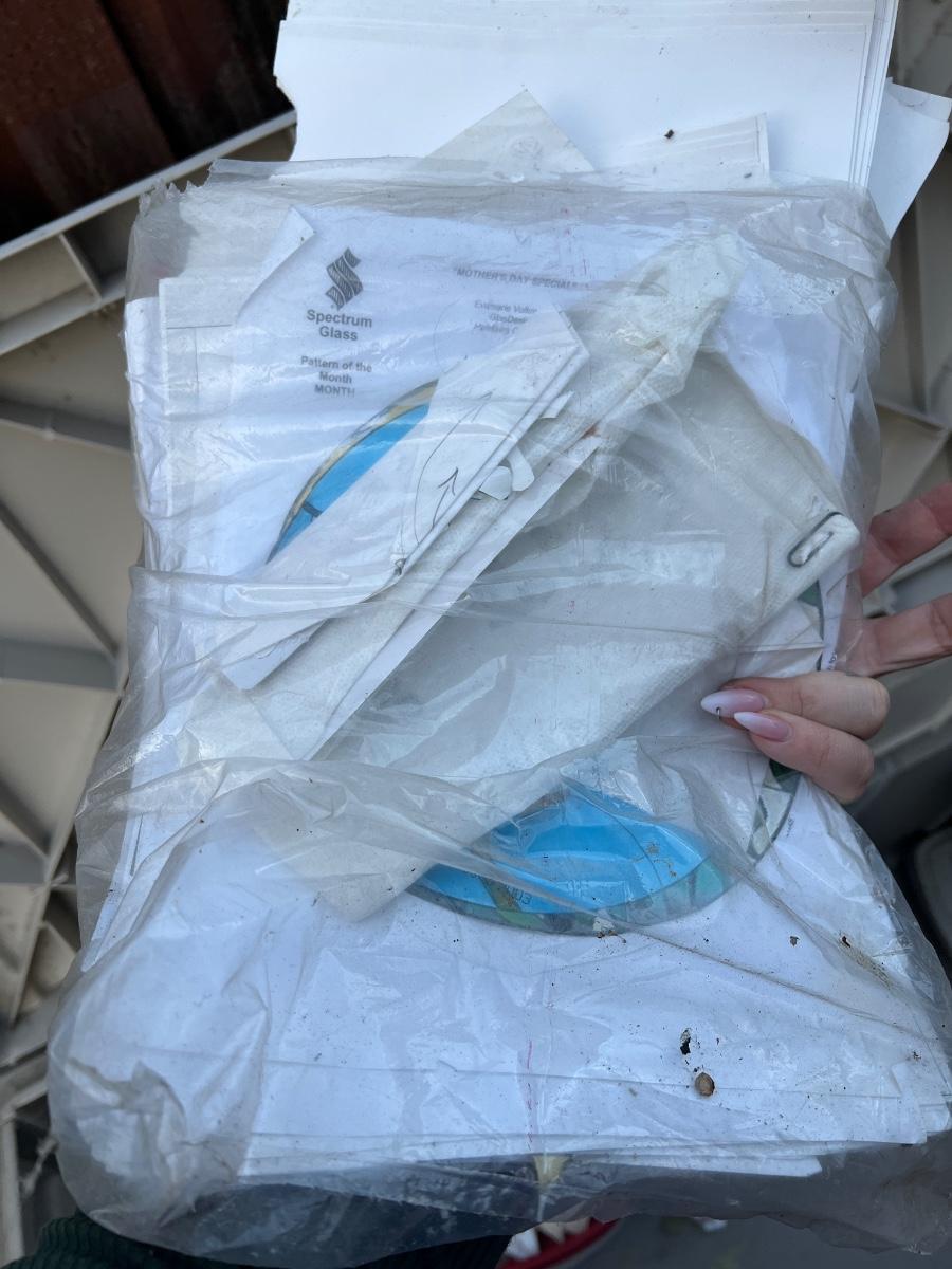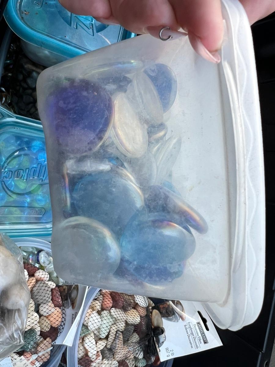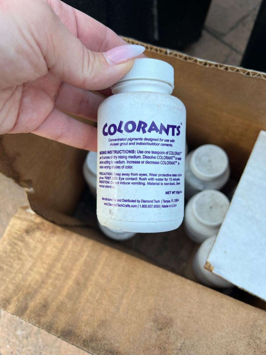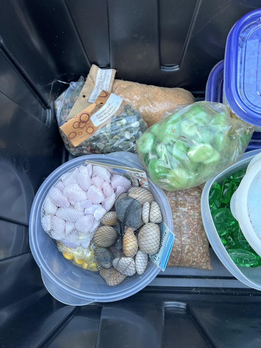 This lot includes mosaic and stained glass crafting supplies such as broken tiles pieces, rocks, stained glass sheets and broken pieces, and stained glass patterns.