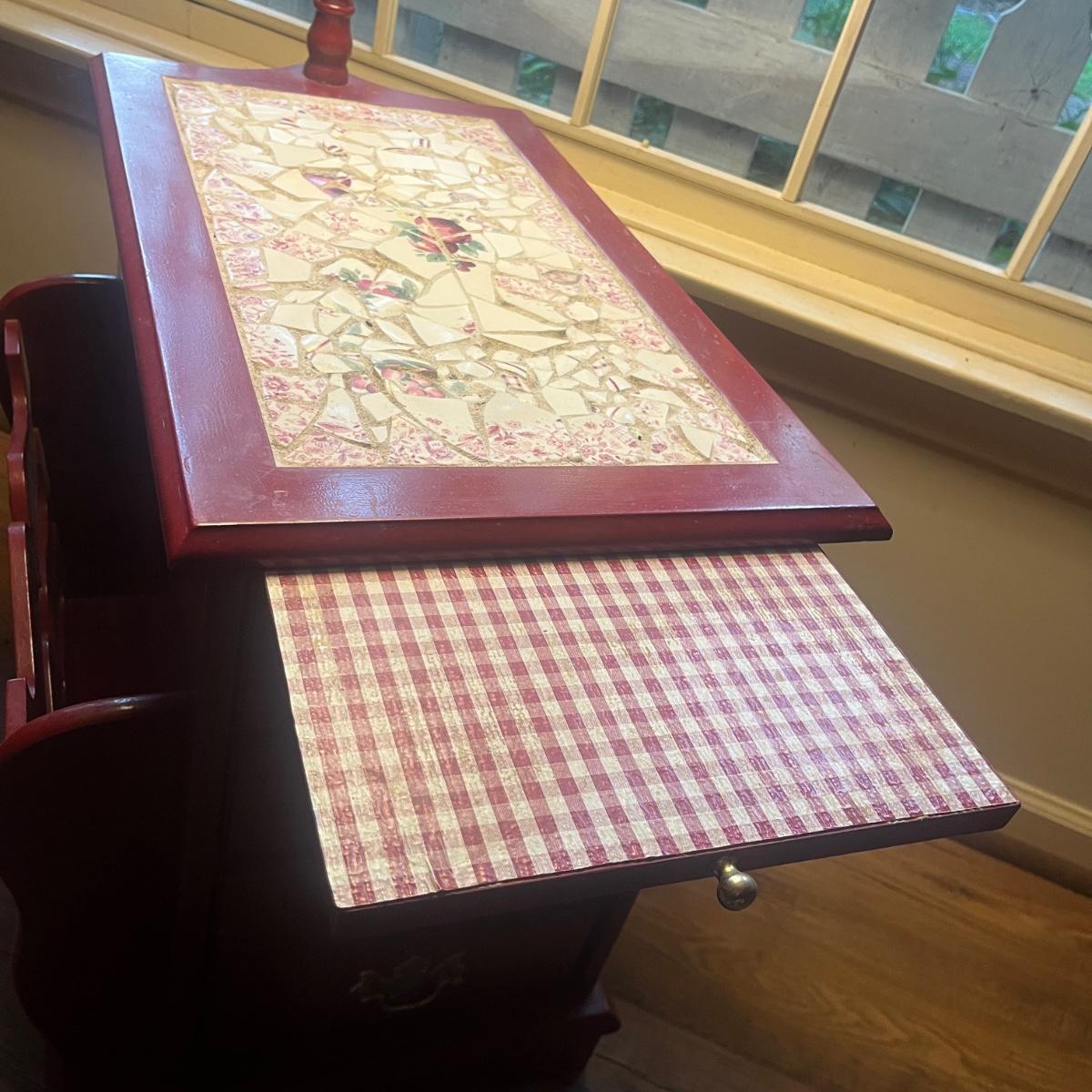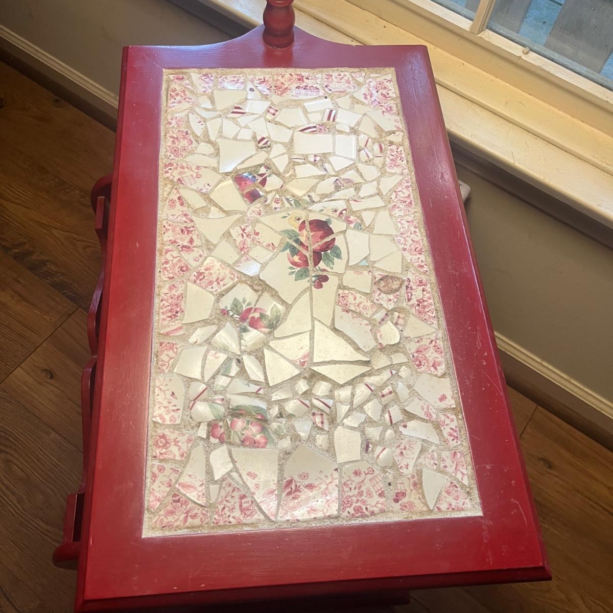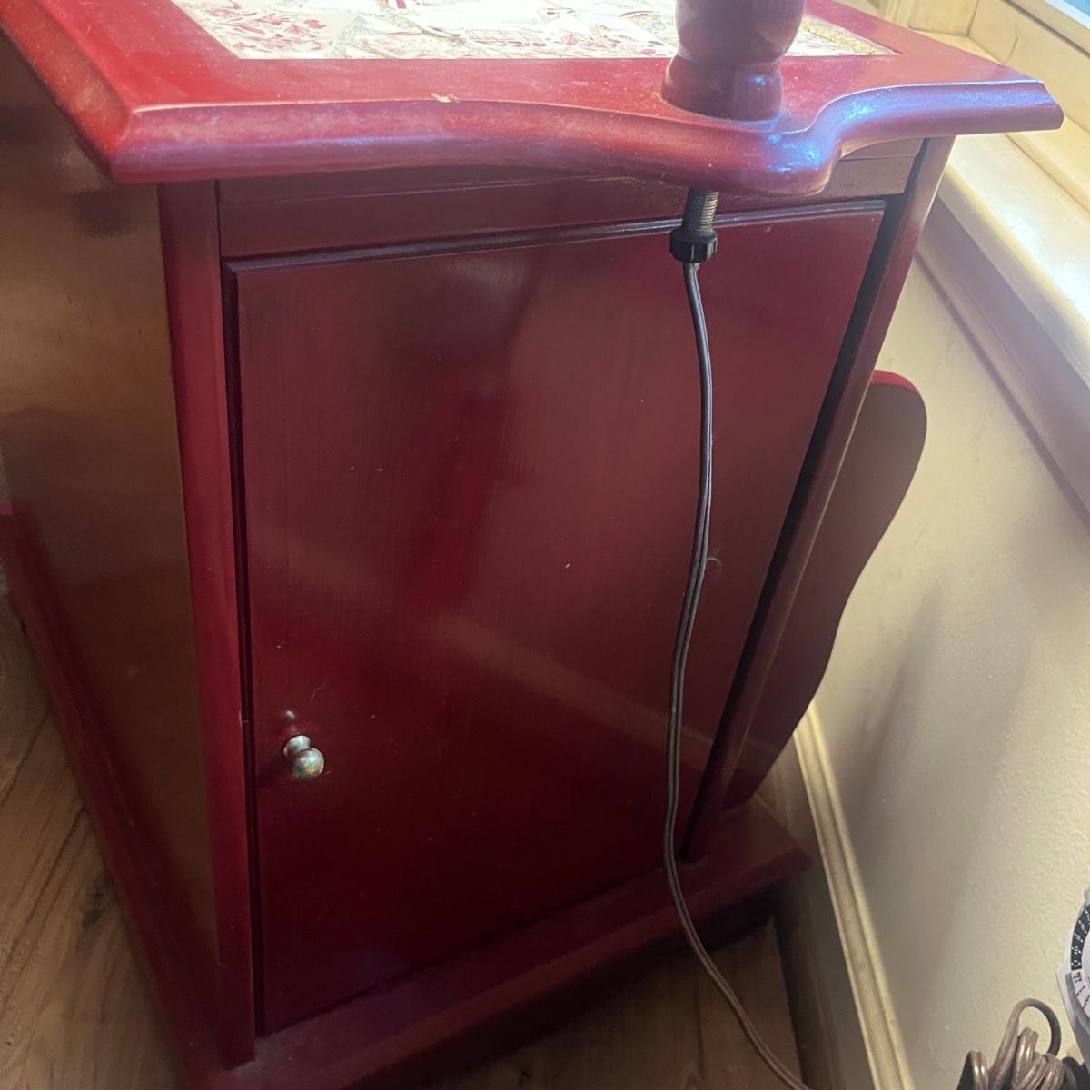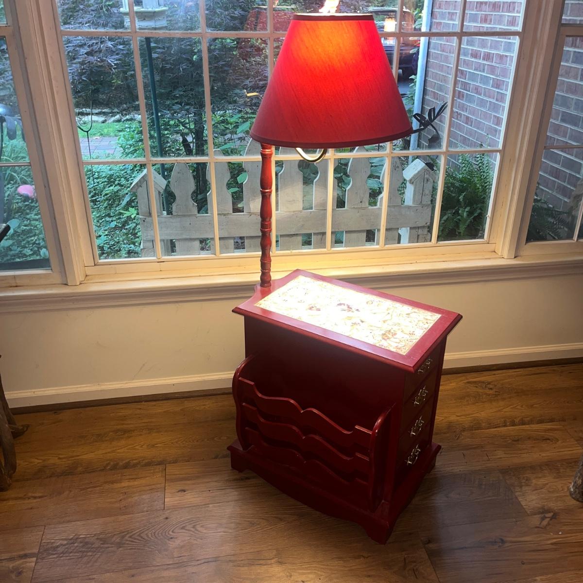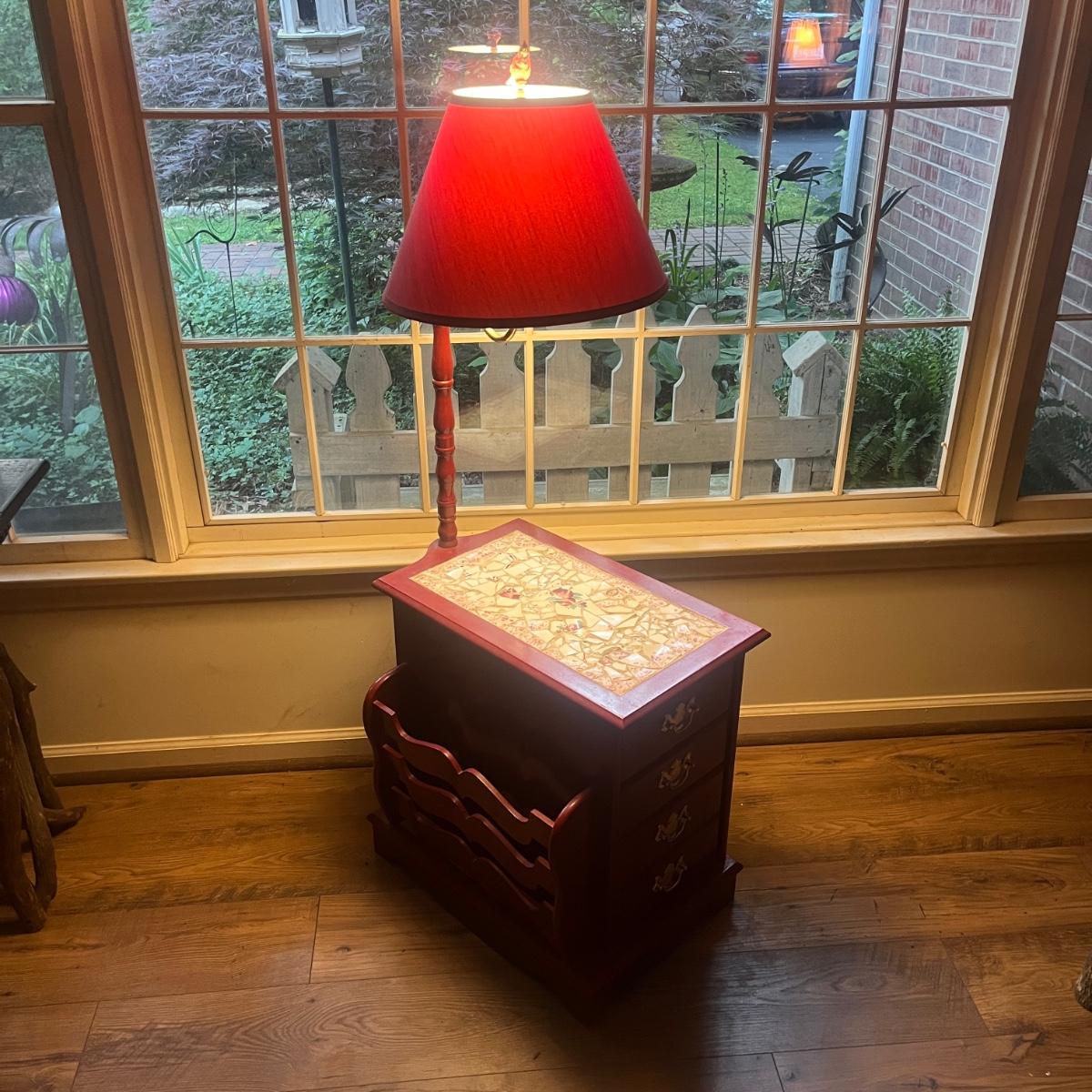 This unique side table has a mosaic top, attached lamp, storage cabinet underneath and a magazine rack on one side. Piece measures 16” x 24” x 53”H.