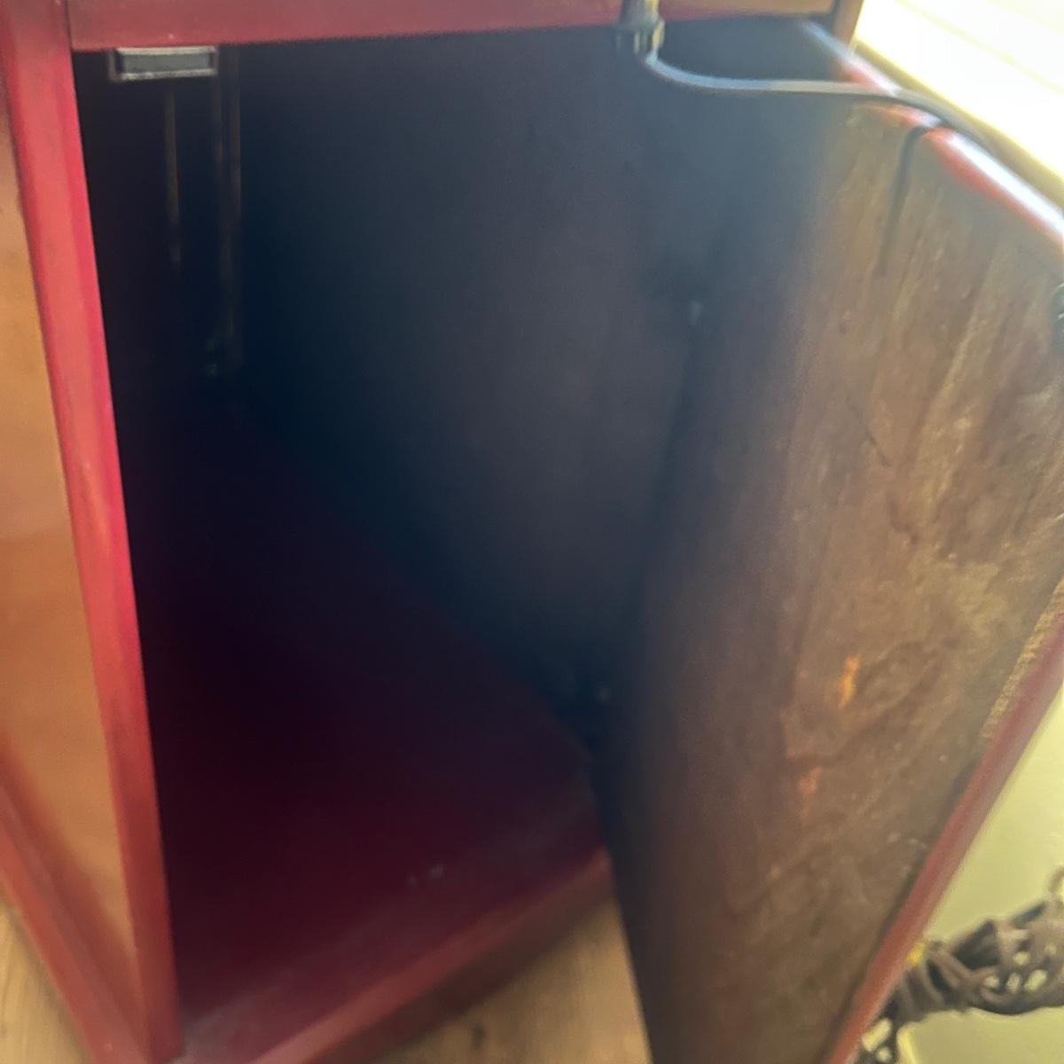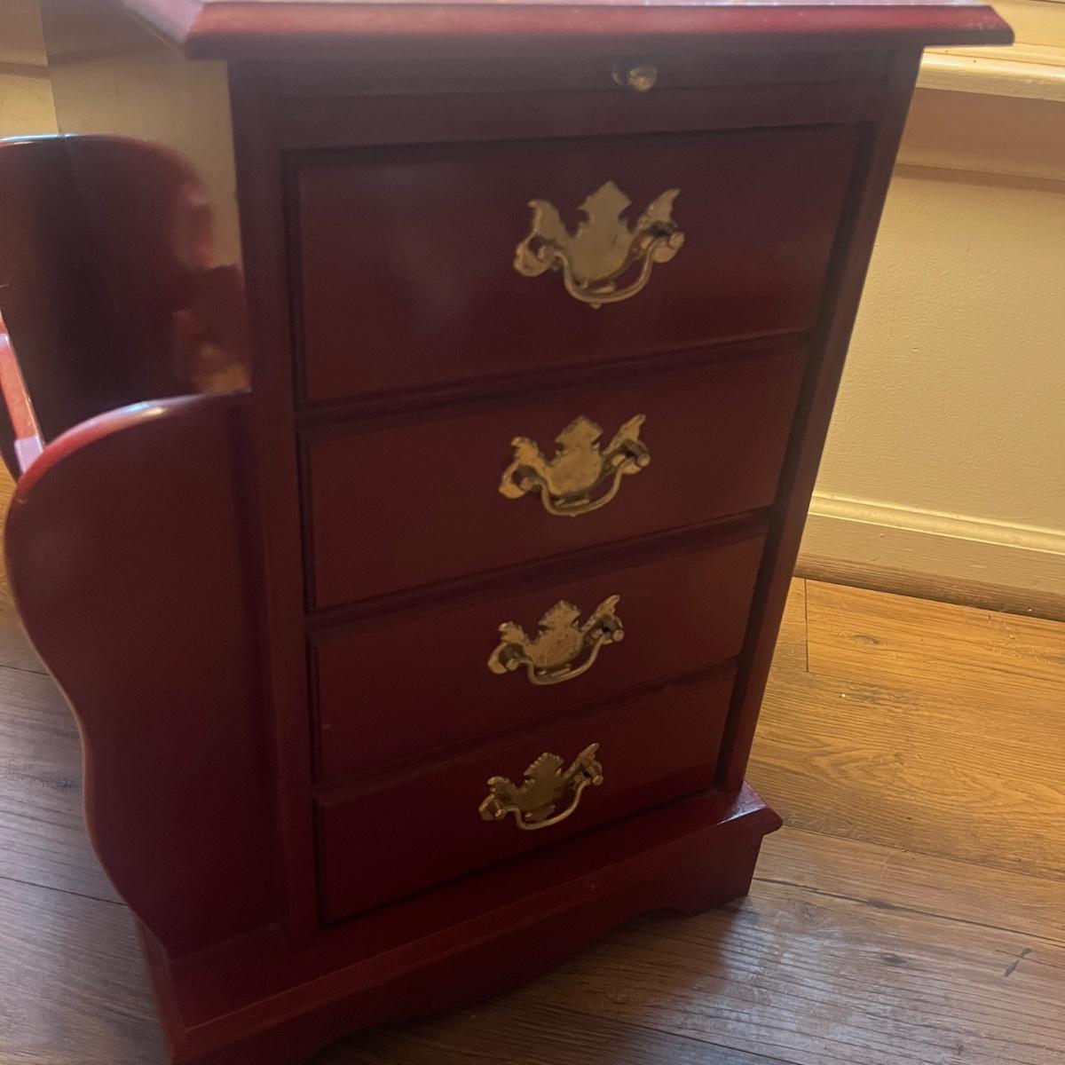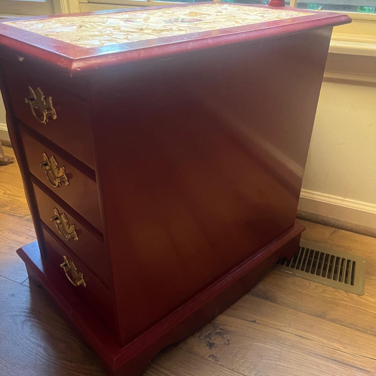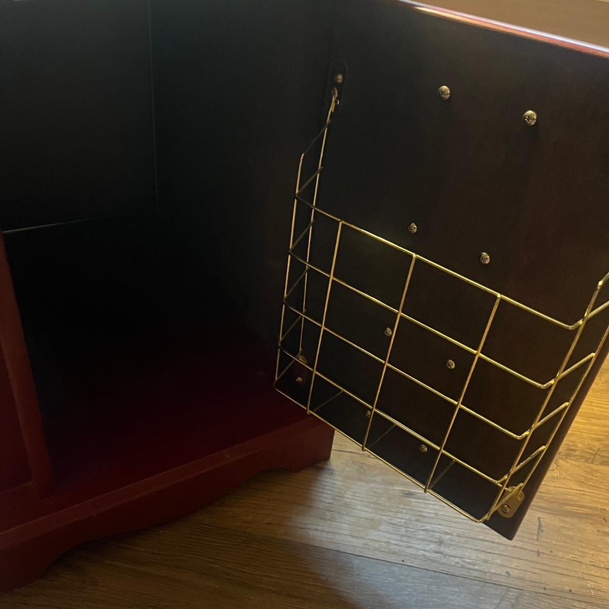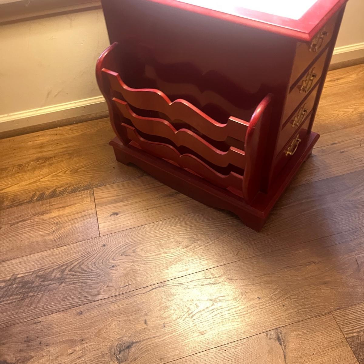 This unique side table has a mosaic top, attached lamp, storage cabinet underneath and a magazine rack on one side. Piece measures 16” x 24” x 53”H.