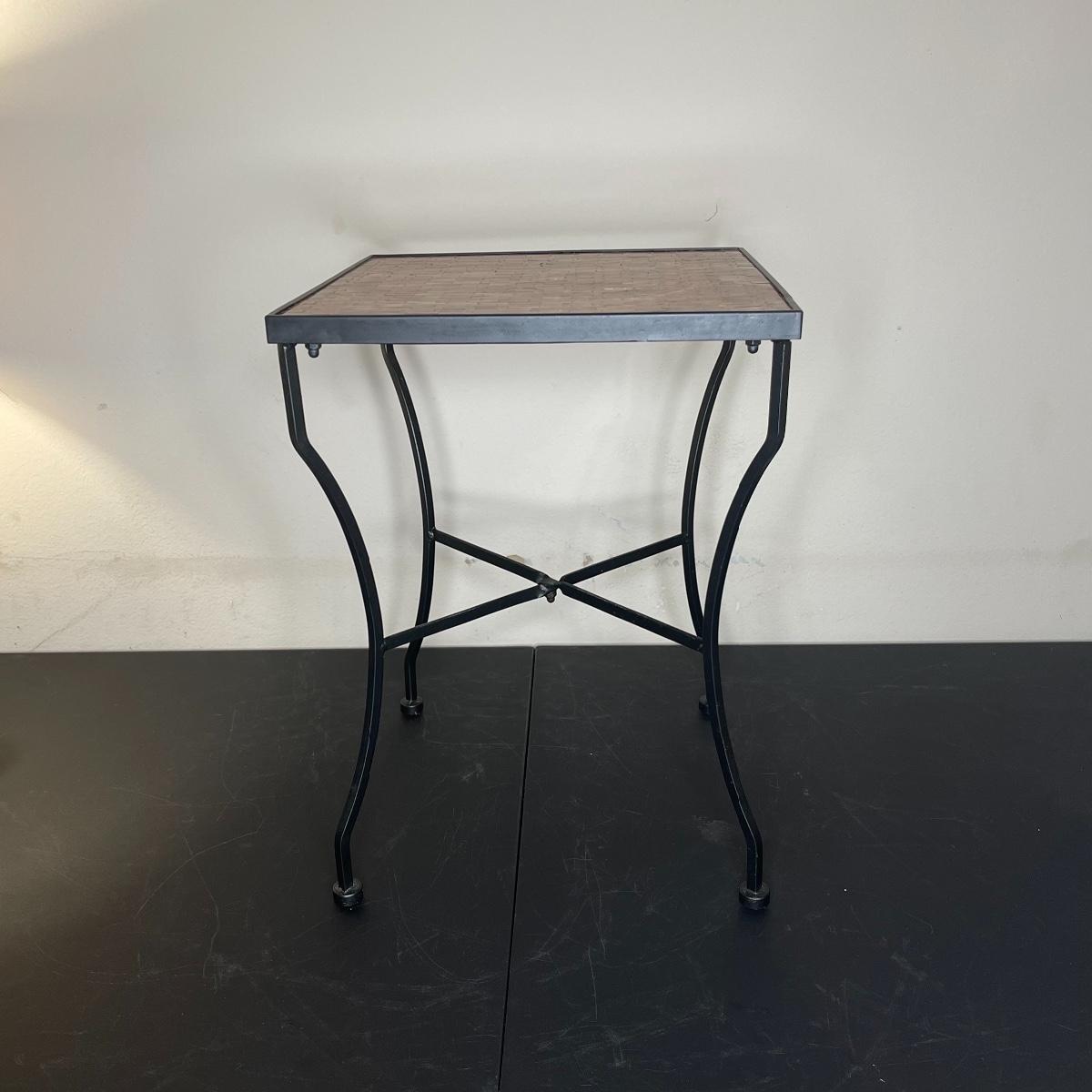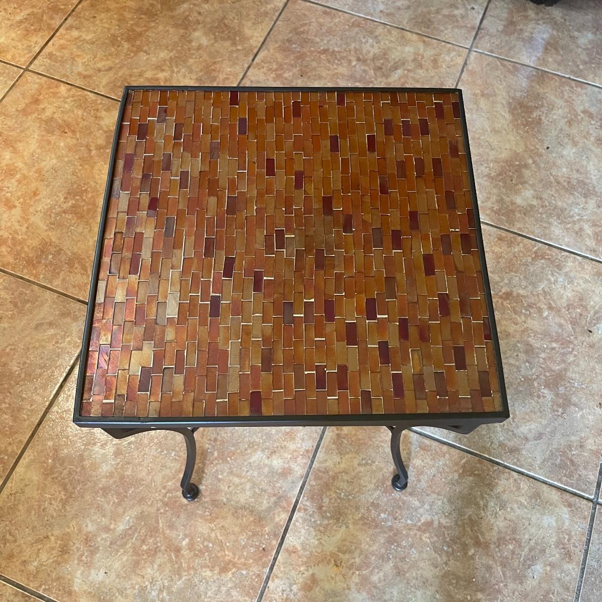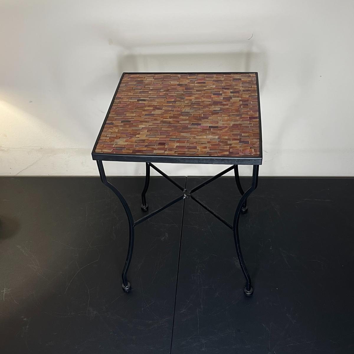 Rust colored small rectangles of glass,. Black Metal base and legs. 21”h x 15” squared.