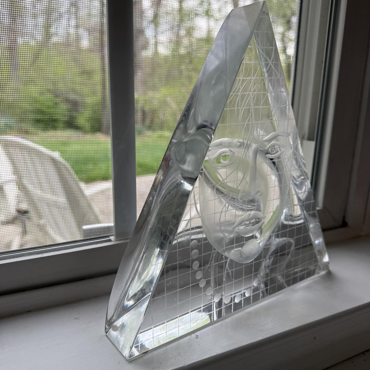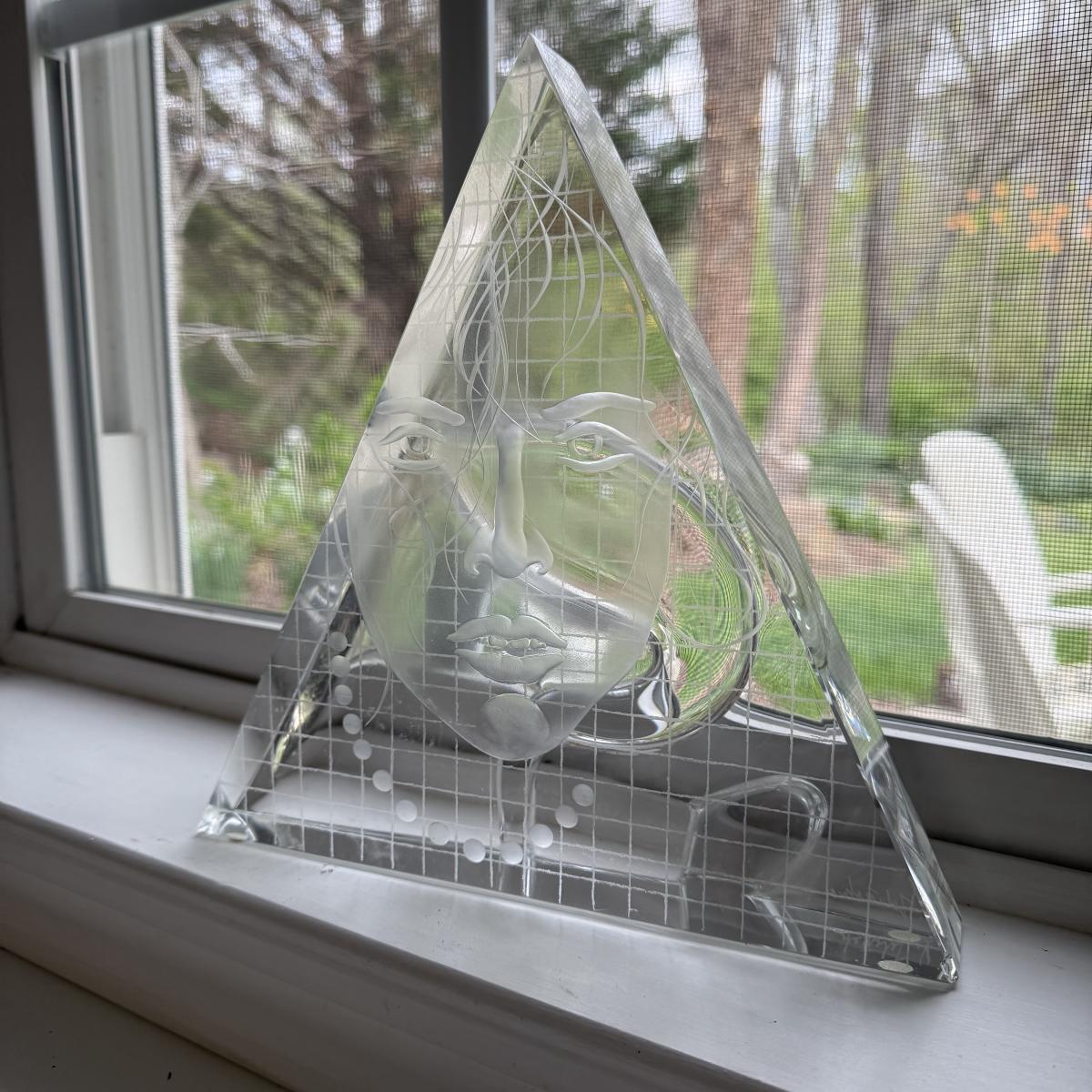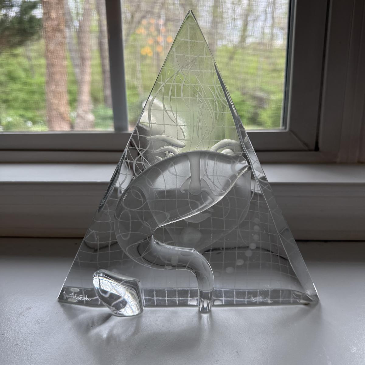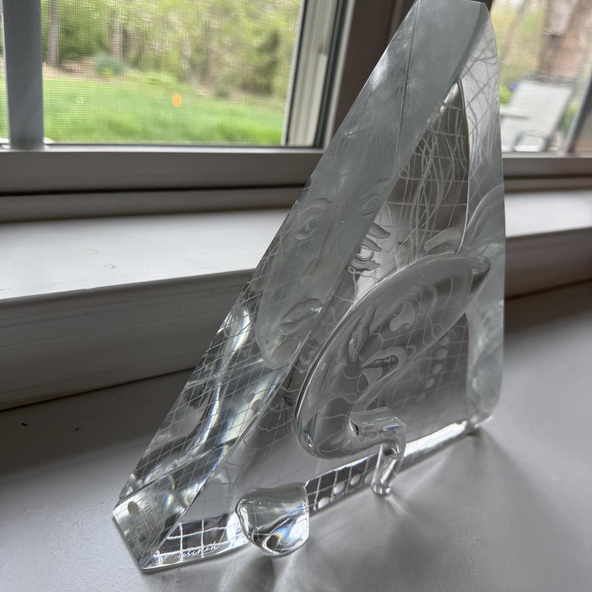 Piece appears to be a Moser engraved sculpture by signed by Vladimir Jelinek. This triangular piece features the face of a woman surrounded by grid-like pattern giving it an abstract feel. On the other side is an organic looking shape, similar to a leaf or petal. This piece measures 8.5” x 1.5” x 9”H. This item is stamped with Moser as well as “V. Jelinek” and has a small chip on one of the corners. See pictures for details. Shipping available.