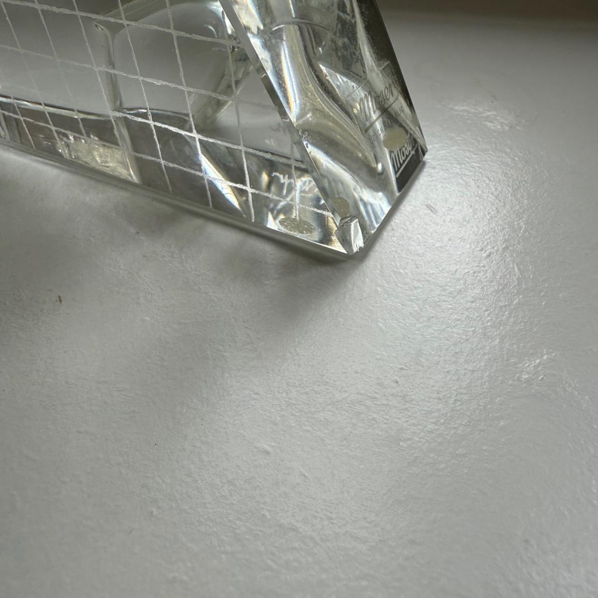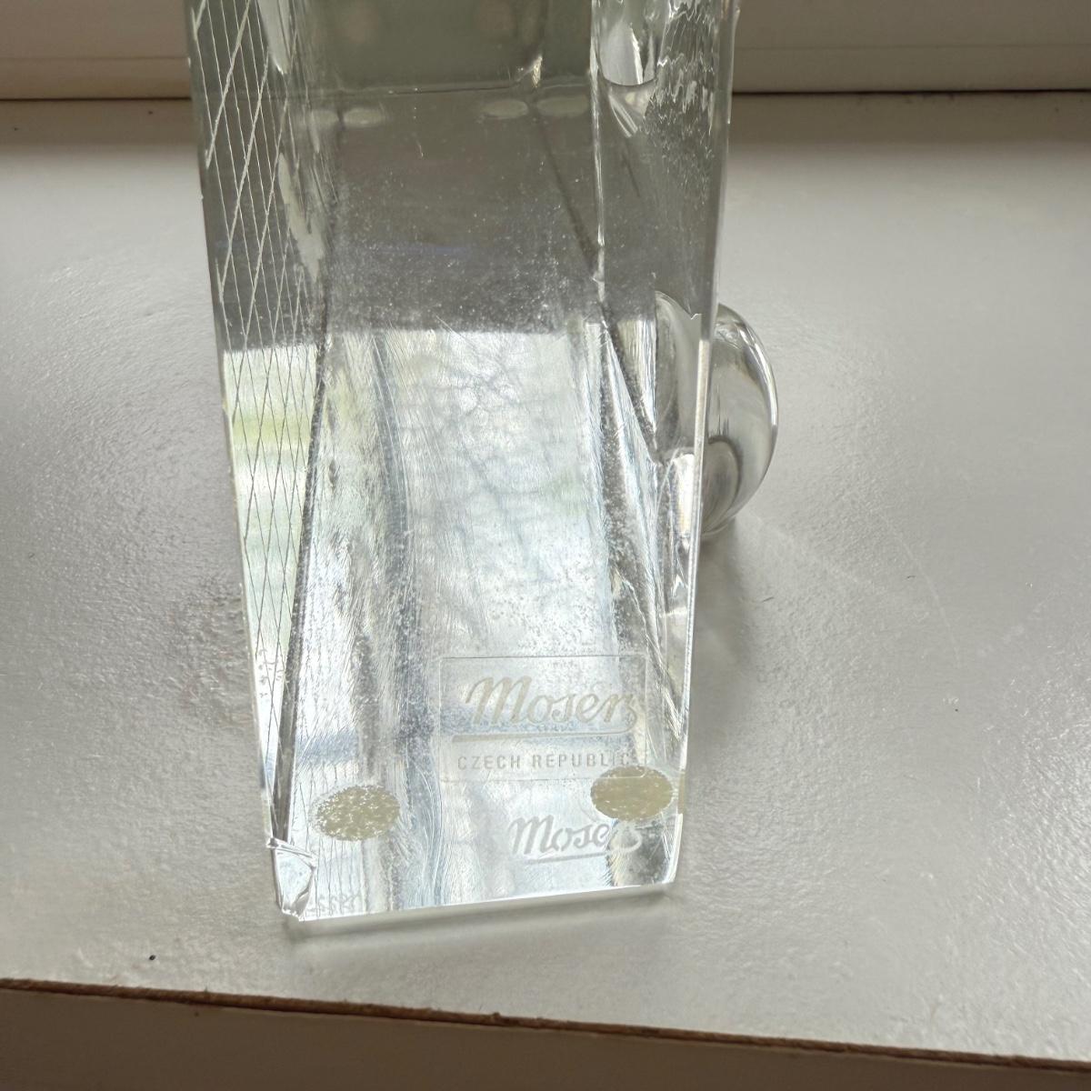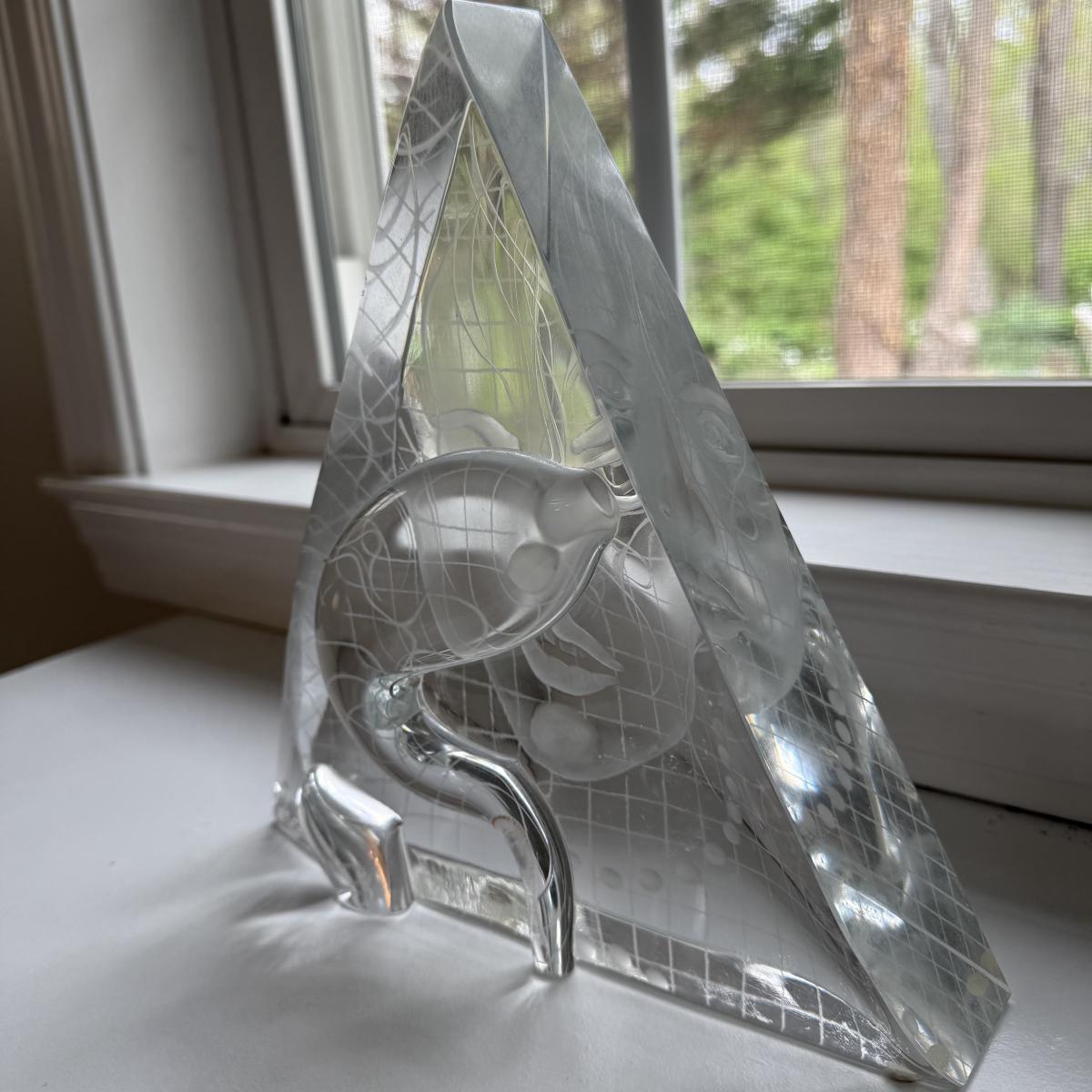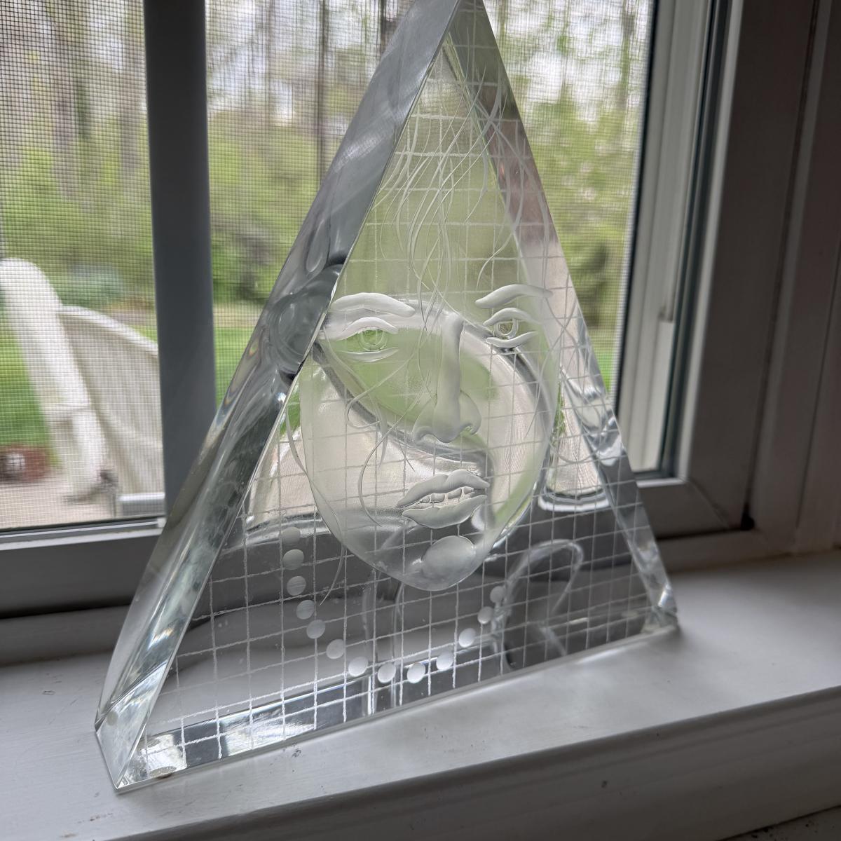 Piece appears to be a Moser engraved sculpture by signed by Vladimir Jelinek. This triangular piece features the face of a woman surrounded by grid-like pattern giving it an abstract feel. On the other side is an organic looking shape, similar to a leaf or petal. This piece measures 8.5” x 1.5” x 9”H. This item is stamped with Moser as well as “V. Jelinek” and has a small chip on one of the corners. See pictures for details. Shipping available.