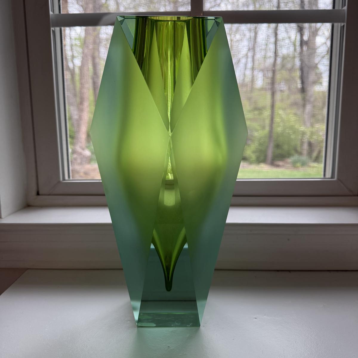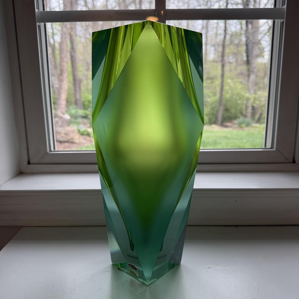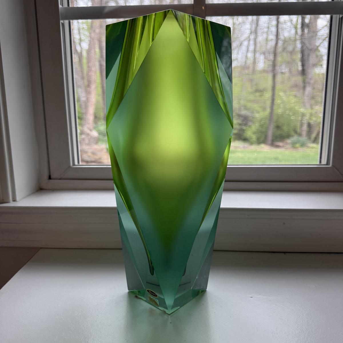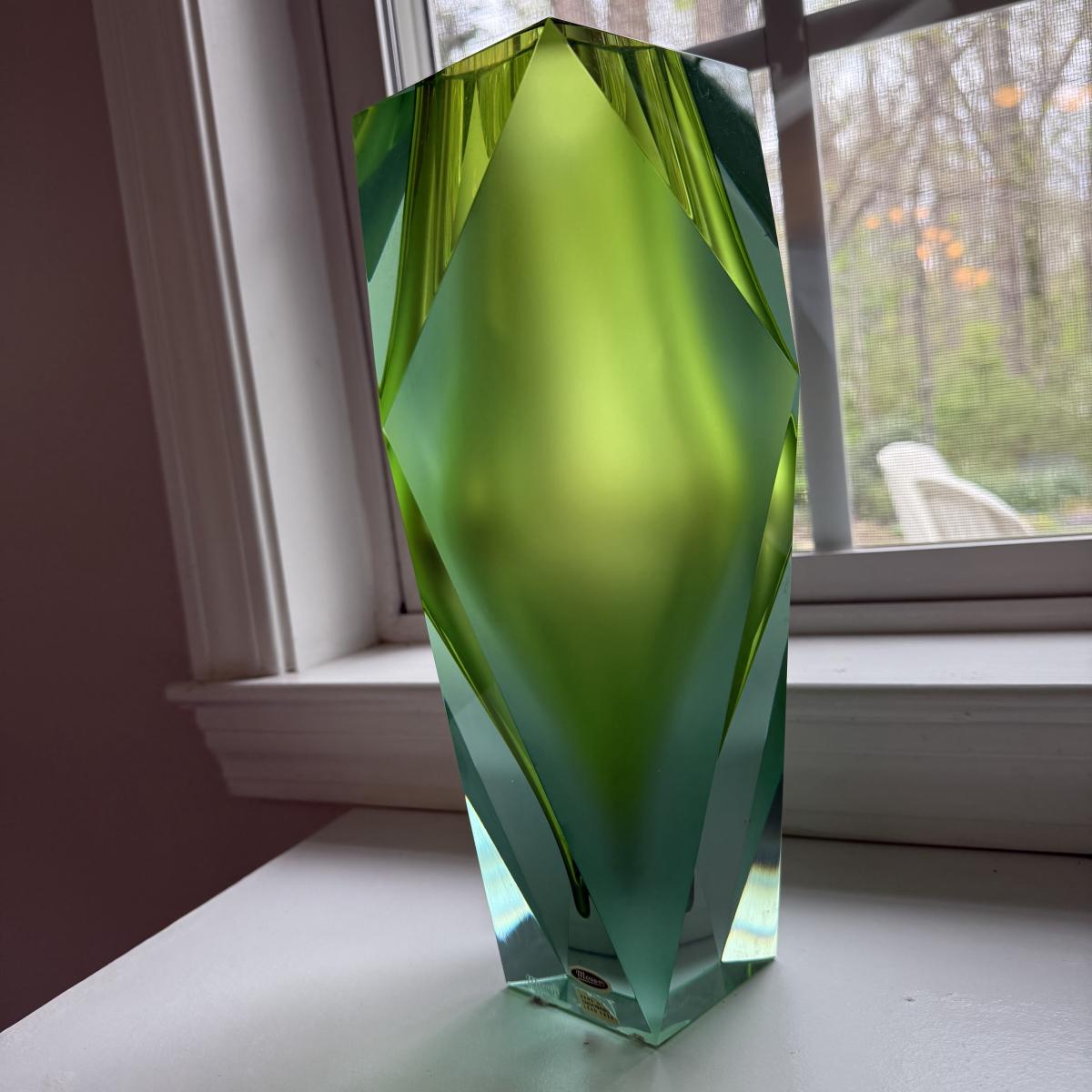 This lot contains a hypnotizing Moser Gema vase in the color ocean green. This stunning vase gives a bit of an optical illusion with its partial frosted glass and fine cut. This vase measures approximately 6” x 6” at its widest by 12”H. This beauty is heavy! Shipping available. Shipping can be costly. We suggest contacting our preferred local shipping provider, Postage Express, with dimensions and getting an estimate before bidding: (828) 255-9250 or shipping@postageexpressnc.com.