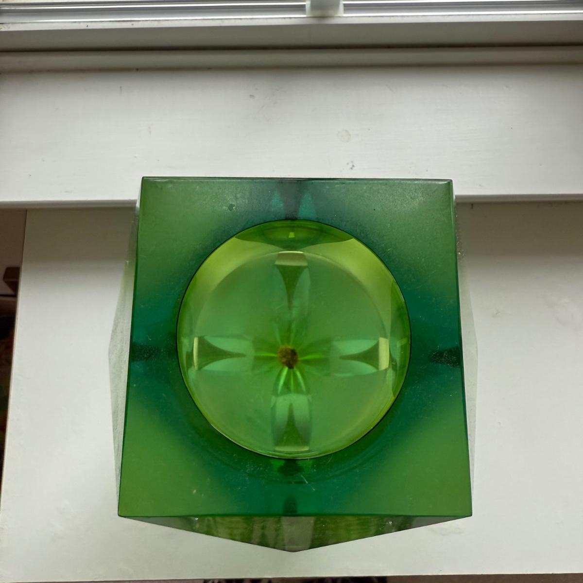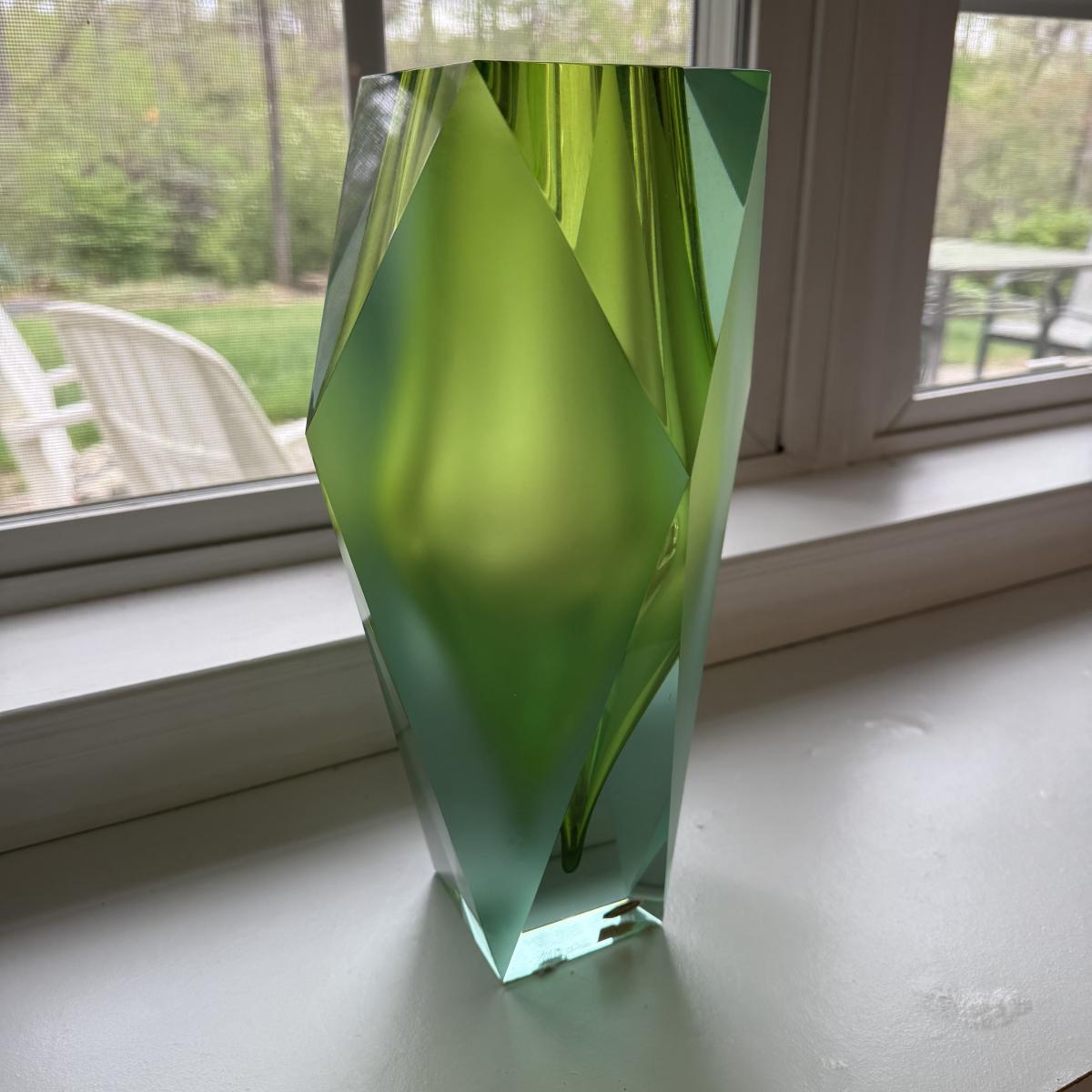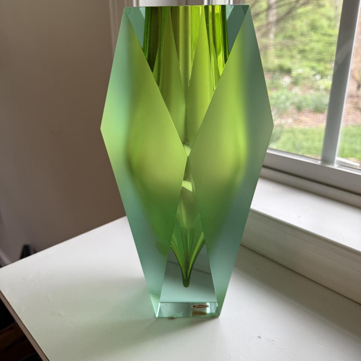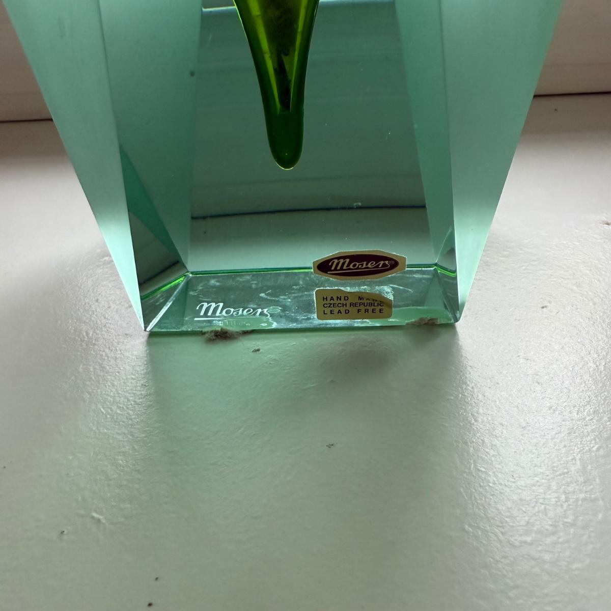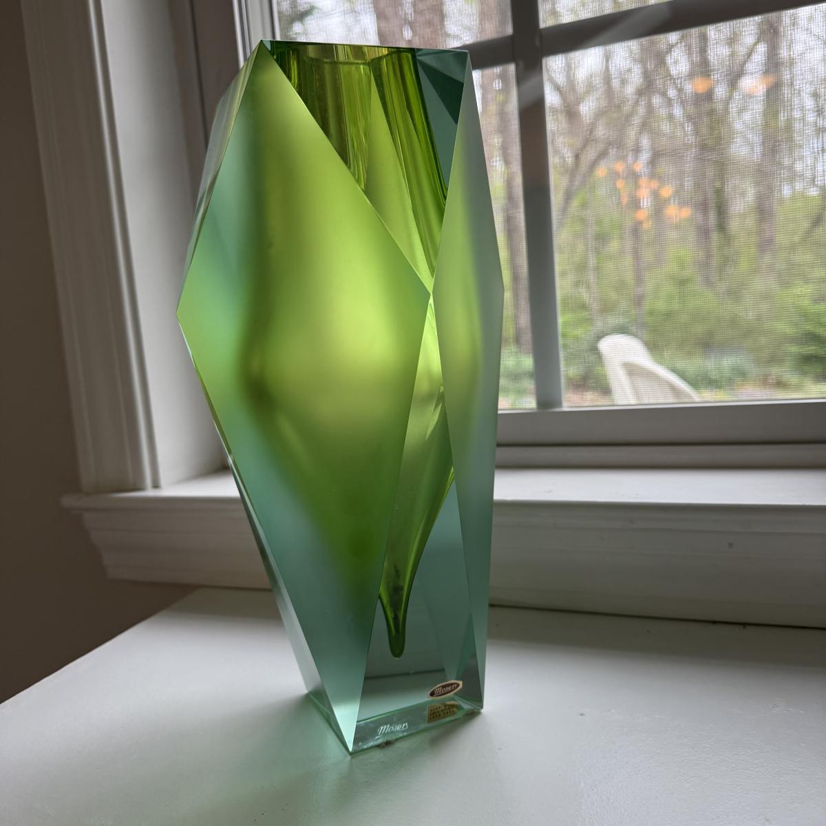 This lot contains a hypnotizing Moser Gema vase in the color ocean green. This stunning vase gives a bit of an optical illusion with its partial frosted glass and fine cut. This vase measures approximately 6” x 6” at its widest by 12”H. This beauty is heavy! Shipping available. Shipping can be costly. We suggest contacting our preferred local shipping provider, Postage Express, with dimensions and getting an estimate before bidding: (828) 255-9250 or shipping@postageexpressnc.com.