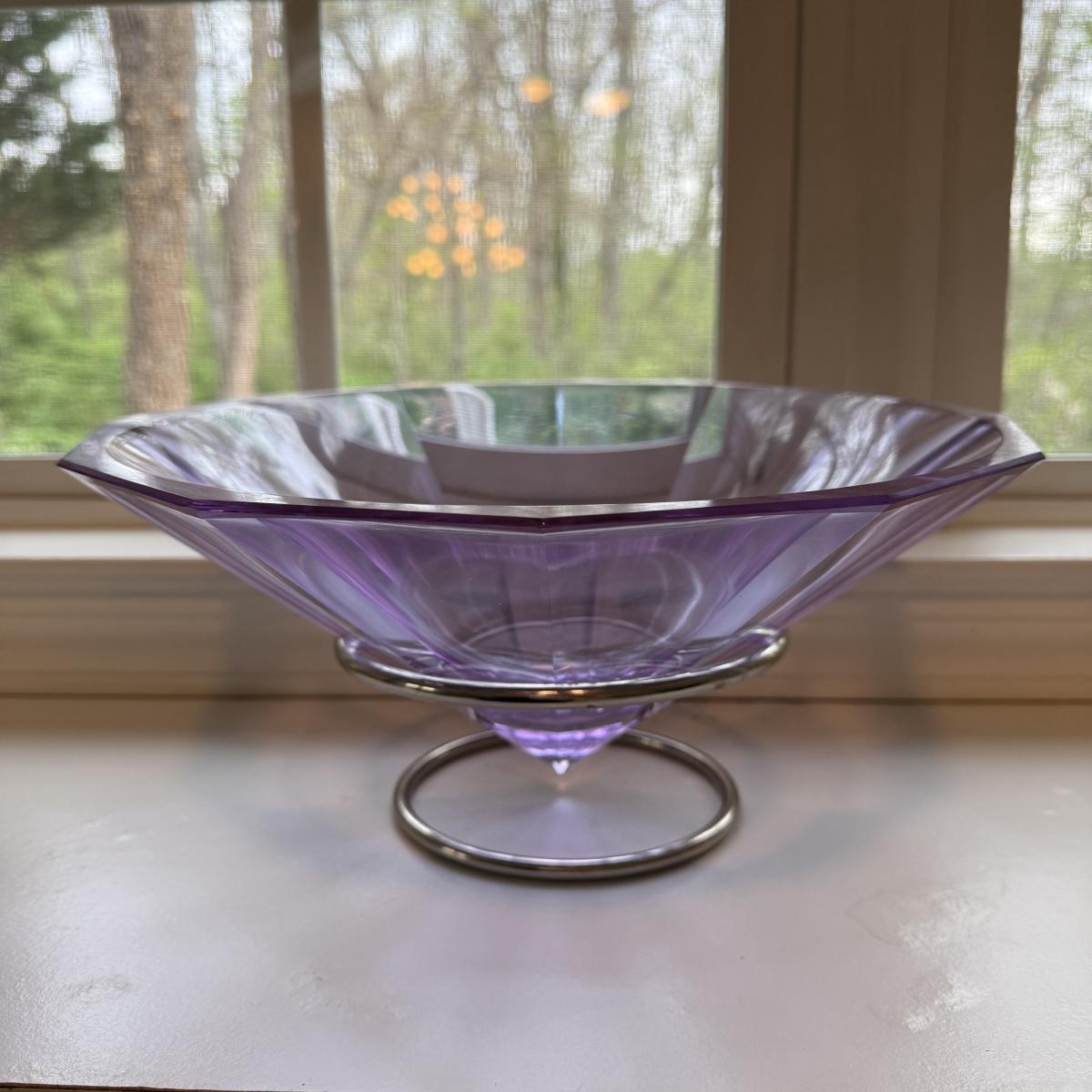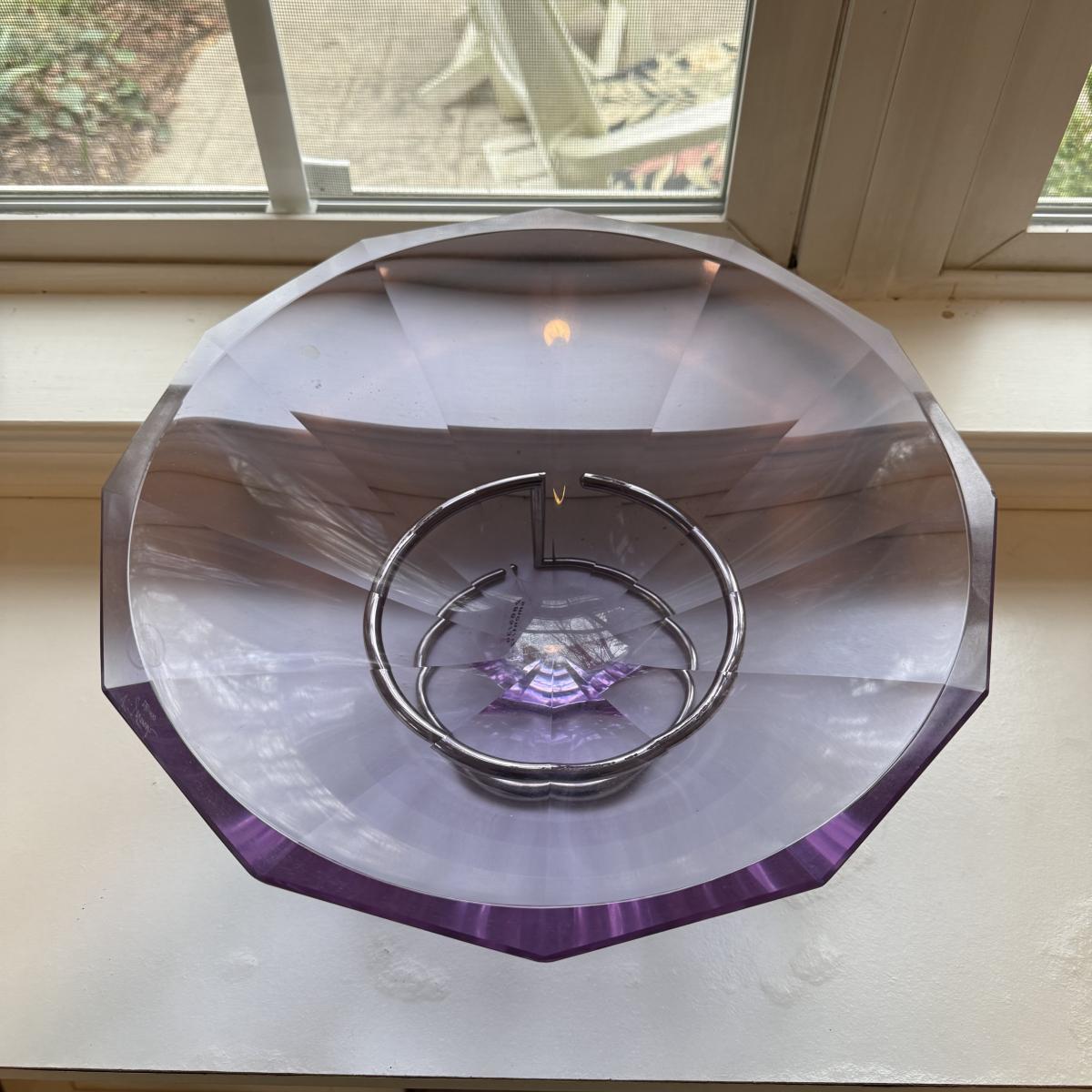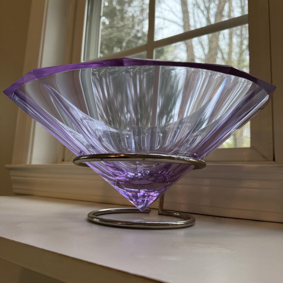 This lot contains a spectacular bowl that appears to be a limited edition Moser piece in the color alexandrite. This bowl has a diamond shape on its profile and has a 12.5”D. The stand is metal and measures 6.5”D x 3.5”H. Shipping available. Shipping can be costly. We suggest contacting our preferred local shipping provider, Postage Express, with dimensions and getting an estimate before bidding: (828) 255-9250 or shipping@postageexpressnc.com.