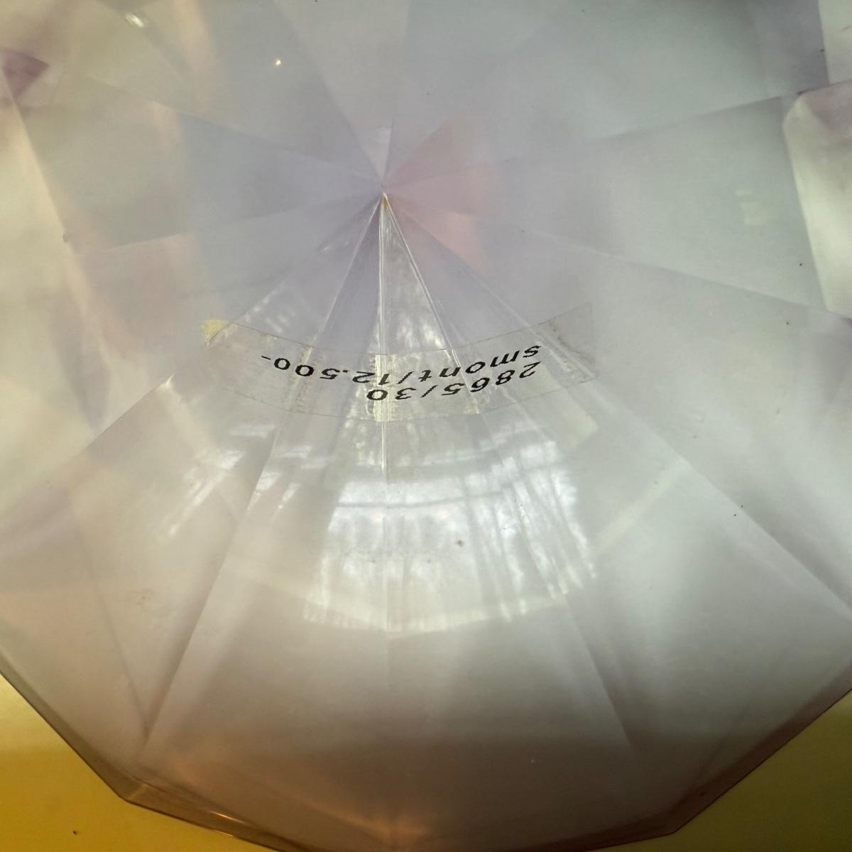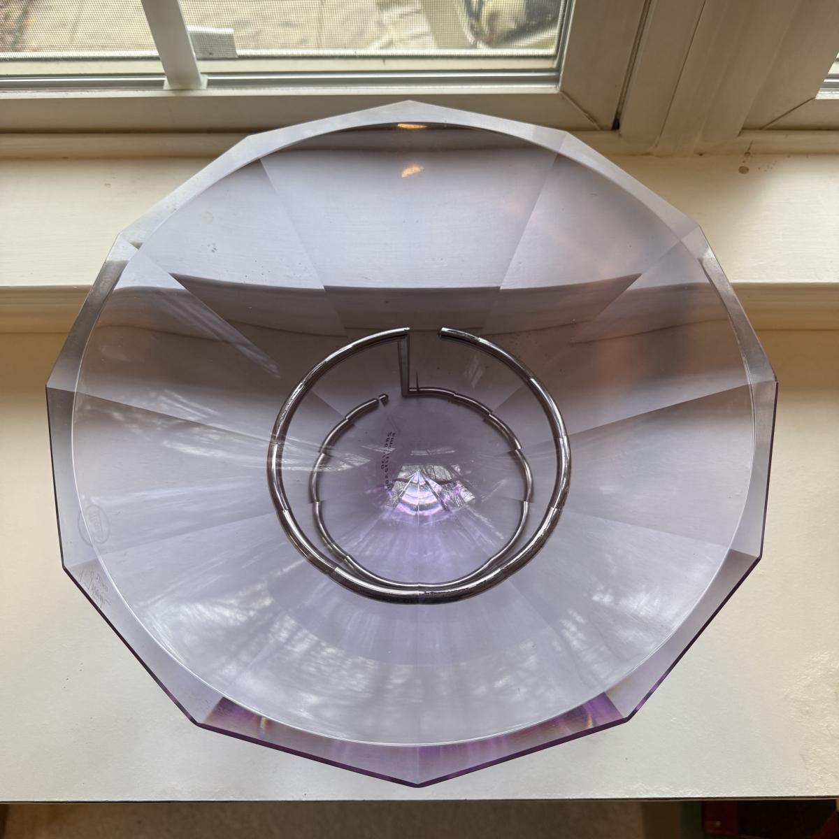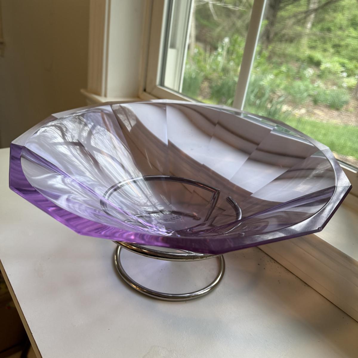 This lot contains a spectacular bowl that appears to be a limited edition Moser piece in the color alexandrite. This bowl has a diamond shape on its profile and has a 12.5”D. The stand is metal and measures 6.5”D x 3.5”H. Shipping available. Shipping can be costly. We suggest contacting our preferred local shipping provider, Postage Express, with dimensions and getting an estimate before bidding: (828) 255-9250 or shipping@postageexpressnc.com.
