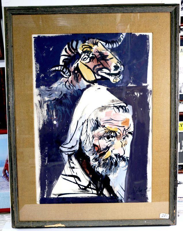 Moshe Gat Original Gouache/Watercolor Painting - Shepherd 2x Signed  c.1972