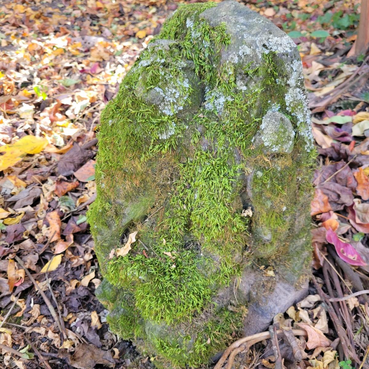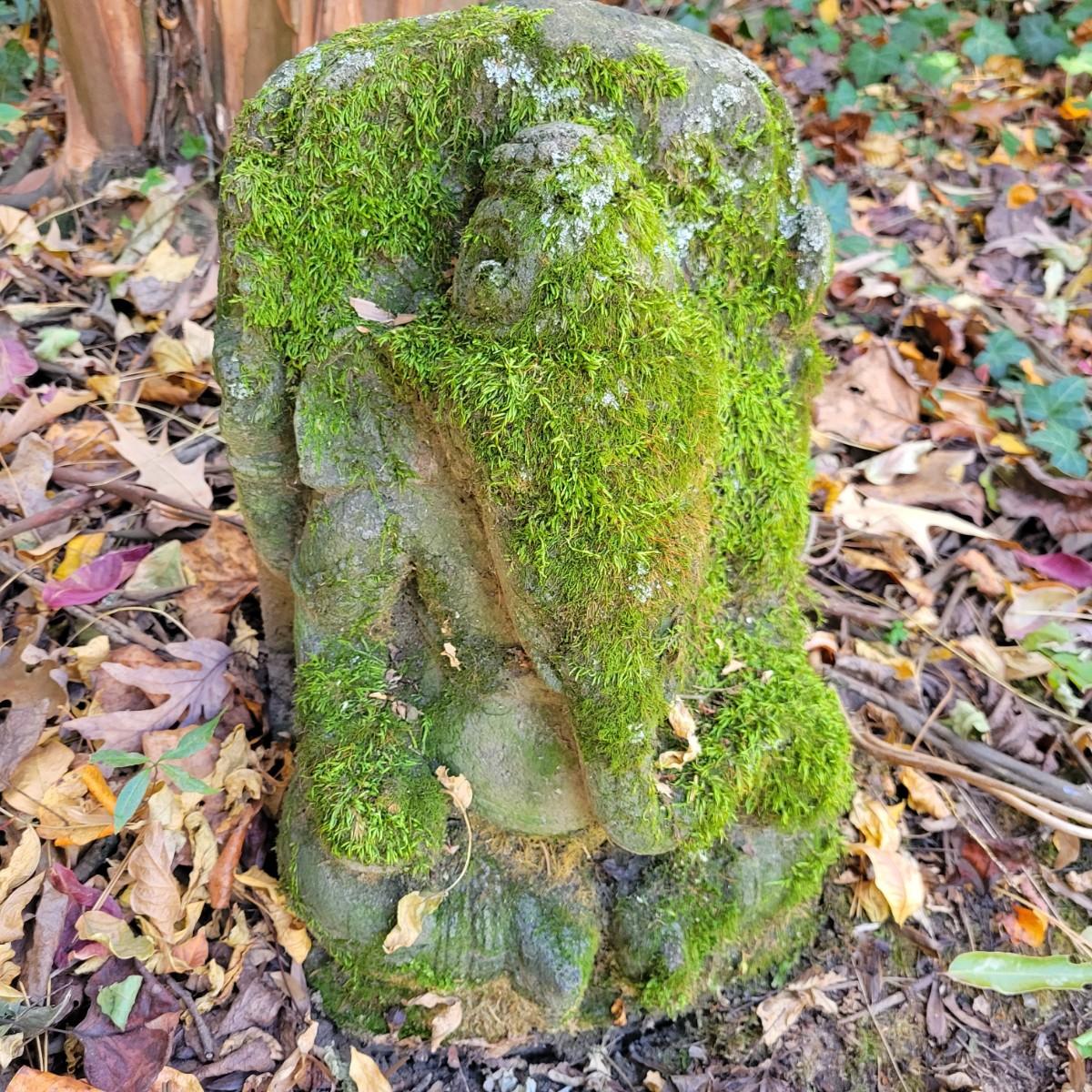 A moss and lichen covered cement yard statue of Ganesha. It measures approximately 10" x 10" x 18"H. Local pickup only