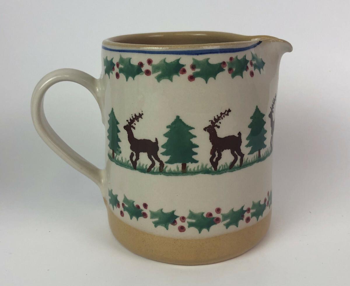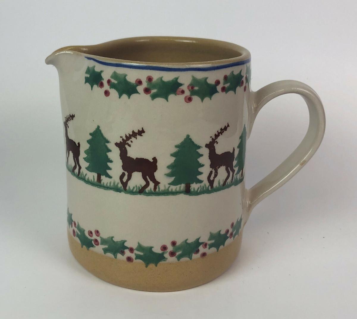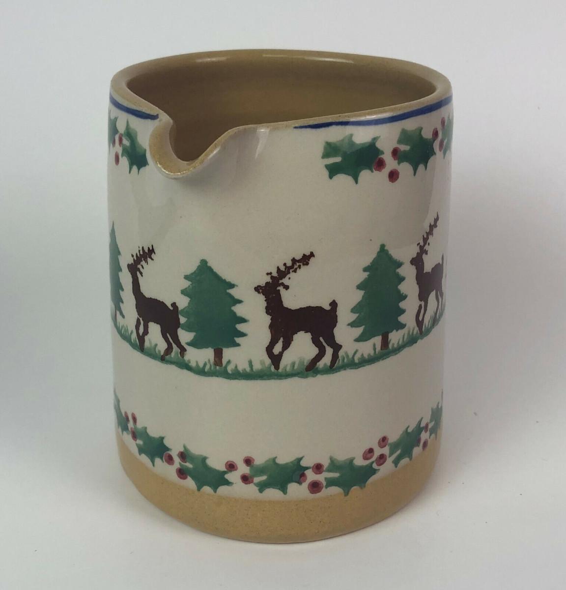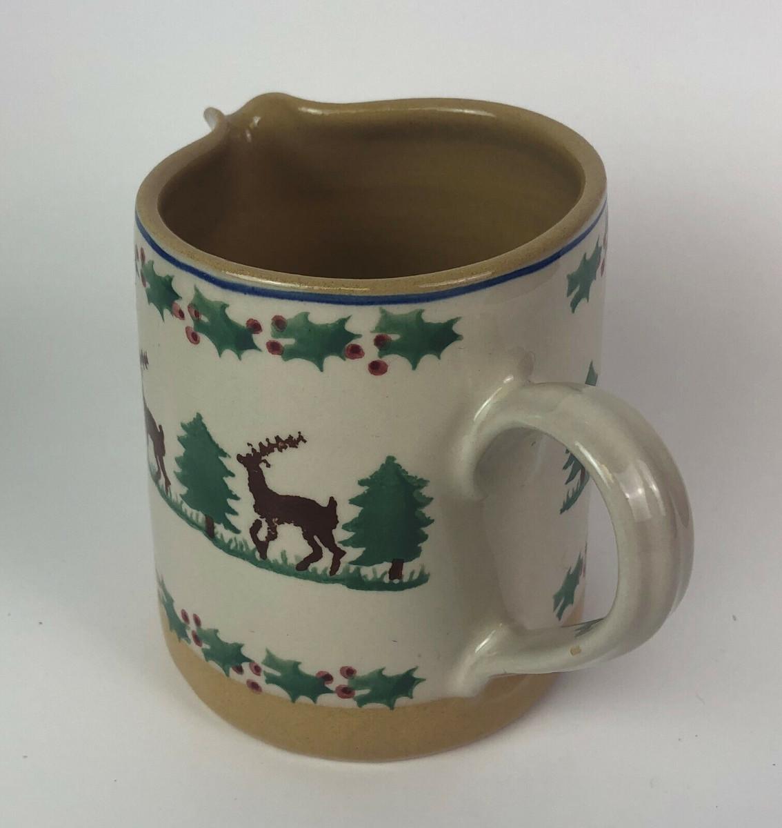 For the holiday season with strong green and brown motifs which echo mountains, lodges and winter walks here is a handmade piece of Nicholas Mosse Pottery...Made in Ireland...A Reindeer pattern small cylinder jug...4.5" high and holds most of a pint...Condition is excellent short of a small flake out of the handle(pictured).