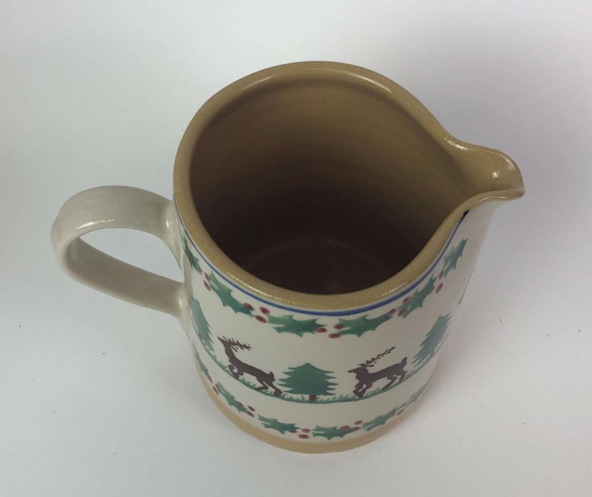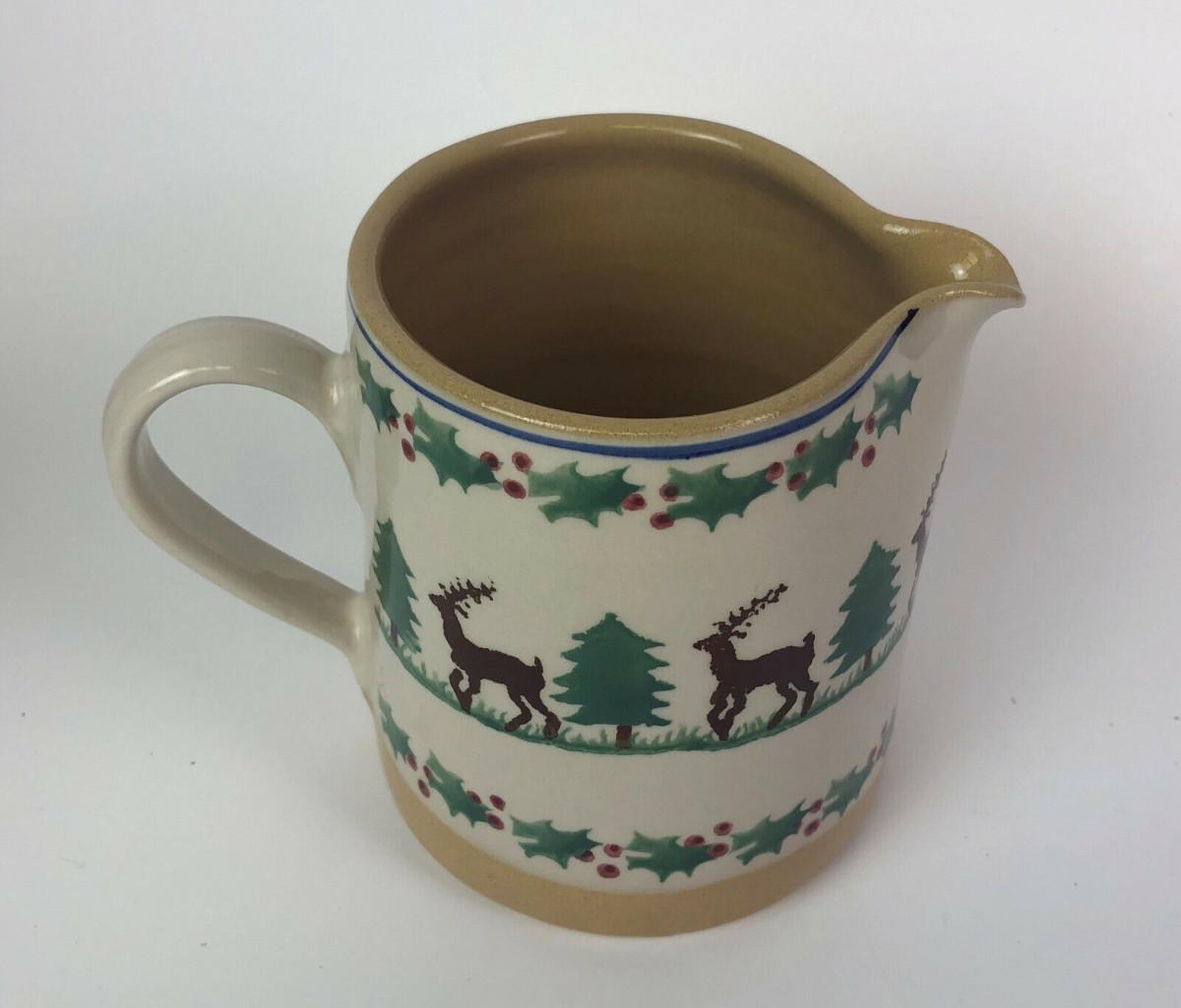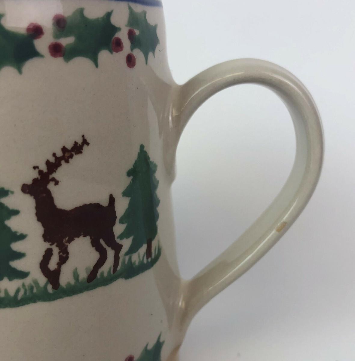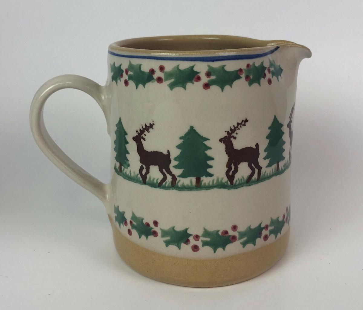For the holiday season with strong green and brown motifs which echo mountains, lodges and winter walks here is a handmade piece of Nicholas Mosse Pottery...Made in Ireland...A Reindeer pattern small cylinder jug...4.5" high and holds most of a pint...Condition is excellent short of a small flake out of the handle(pictured).