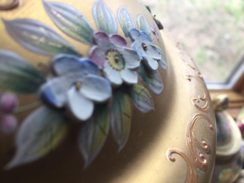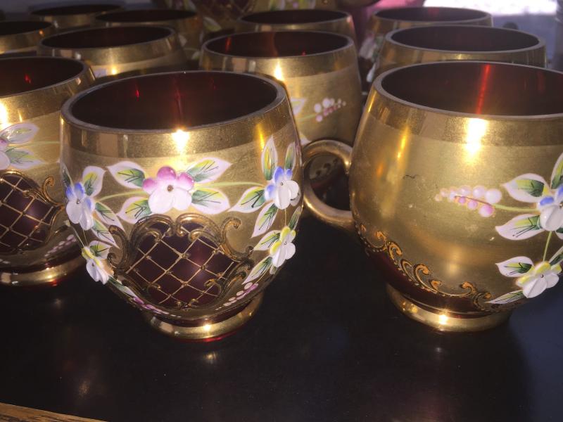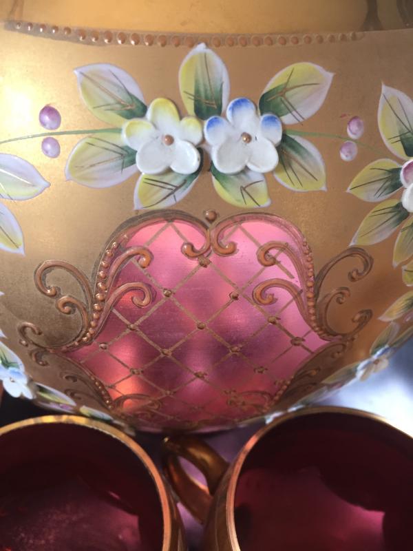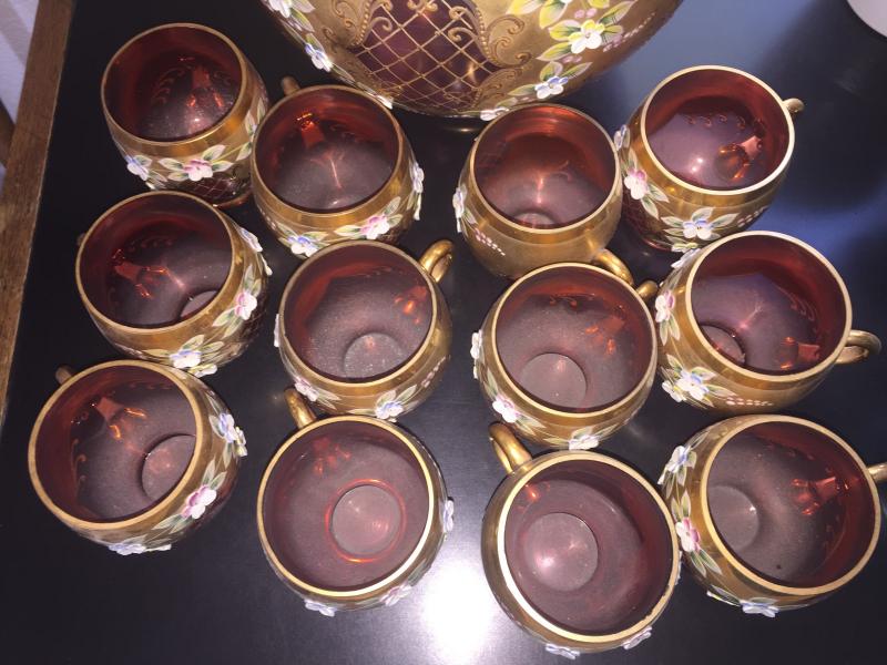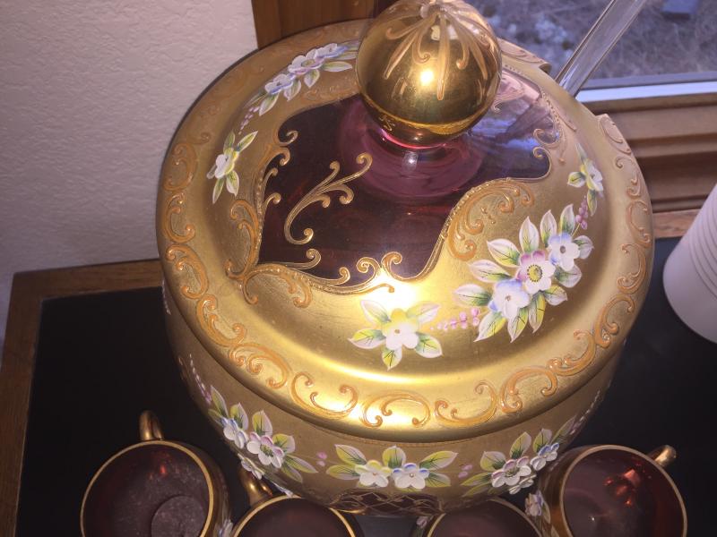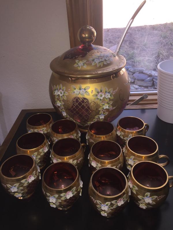 Excellent condition. This one is absolutely stunning and a perfect find for the collector . Includes Bowl with lid, original ladle and 12 cups. Gold trim with raised floral design.