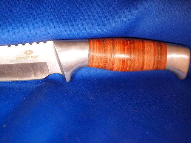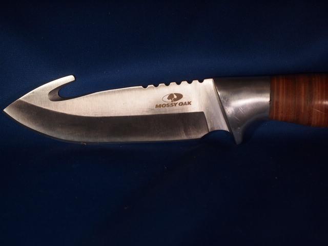 Very ice Mossy Oak knife with 440 Stainless Blade and a wood handle and a Gut hook at the point. Great knife for about any use. Overall length is 9 to 11 inches