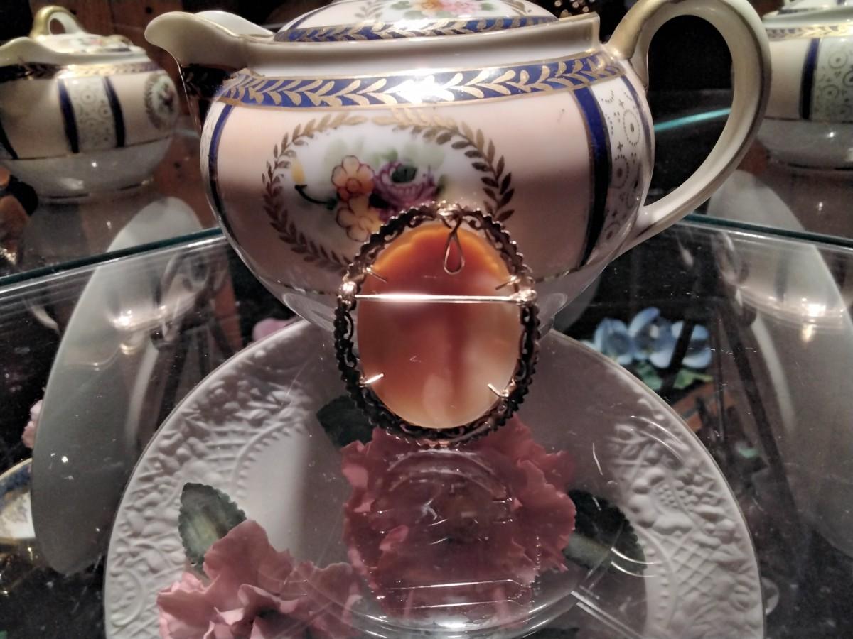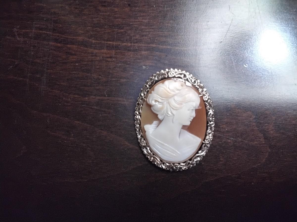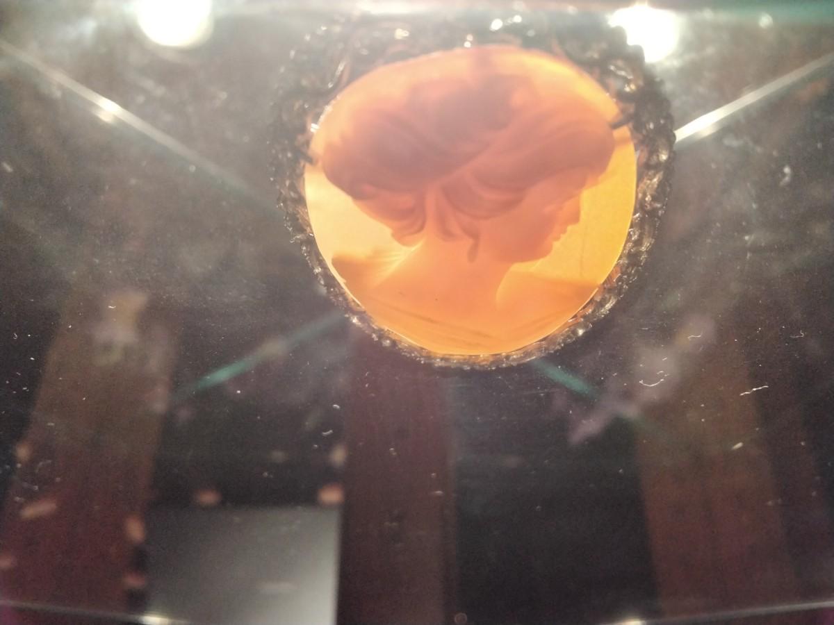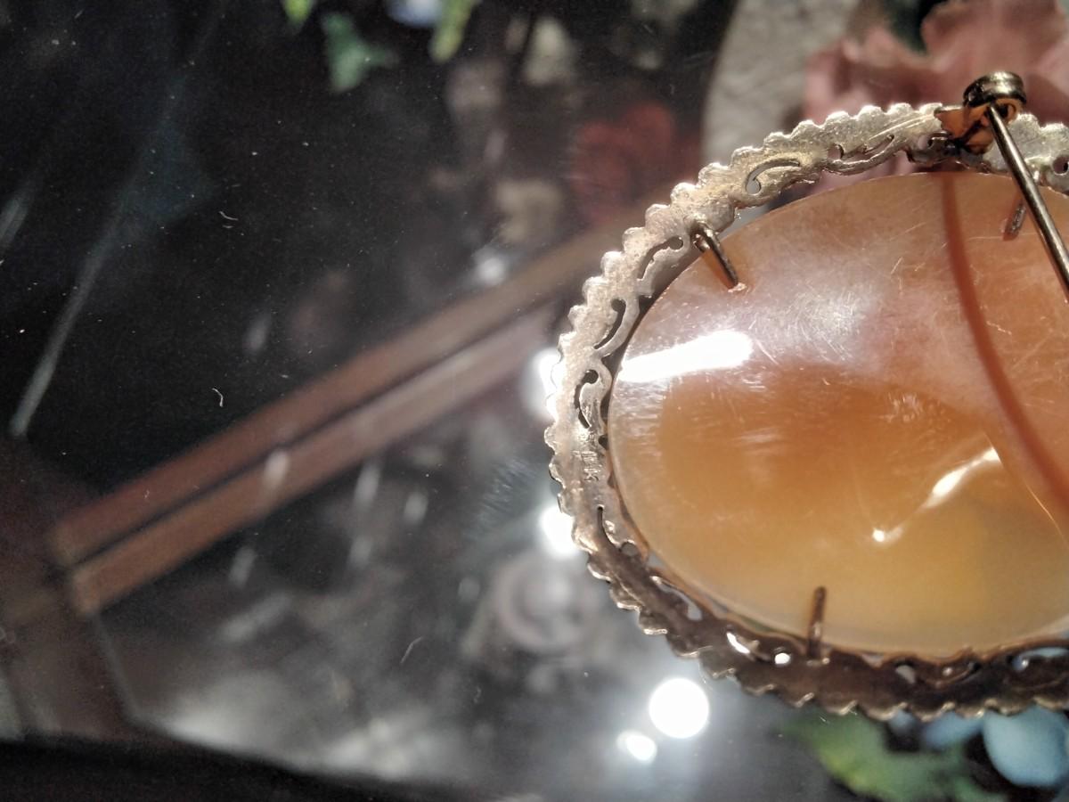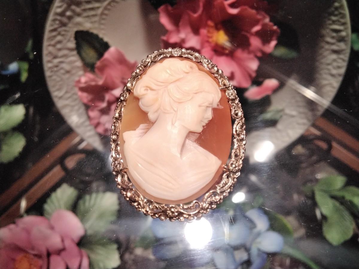 14k gold with laced edges Carnelian Shell Maiden Cameo Brooch/Pendant that was passed down and kept in the same family. She is pristine and one of the thinnest and has the most top quality workmanship I have ever seen. She looks like she was created yesterday. The family kept her protected and preserved. I fell in .over with this beautiful lady and I'm quite sure you will too.