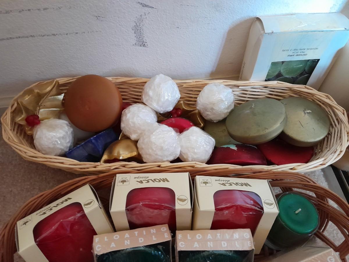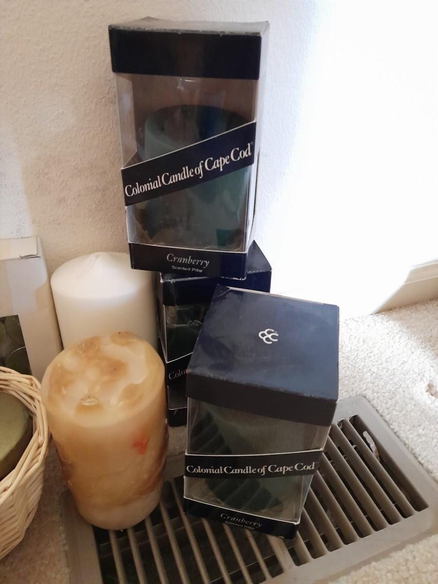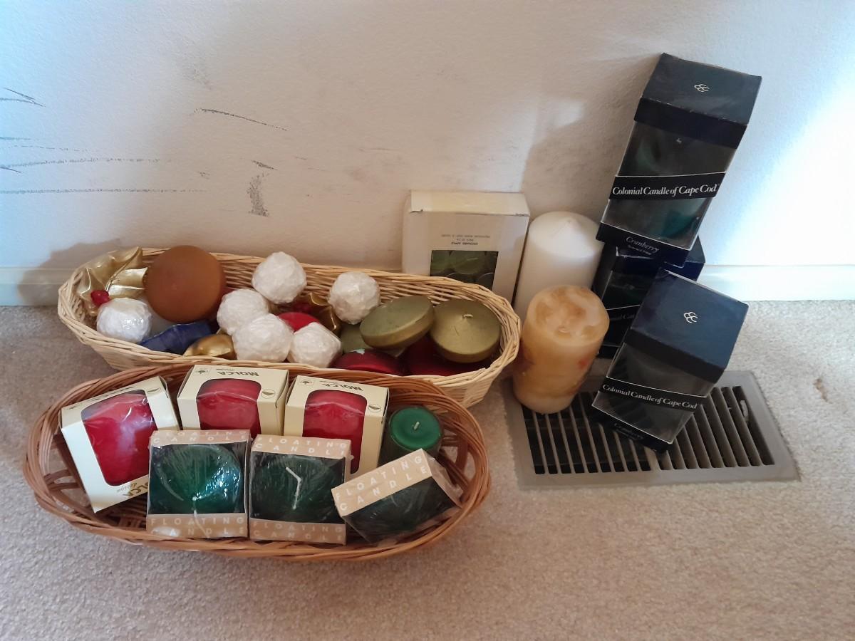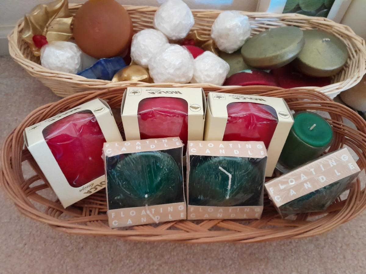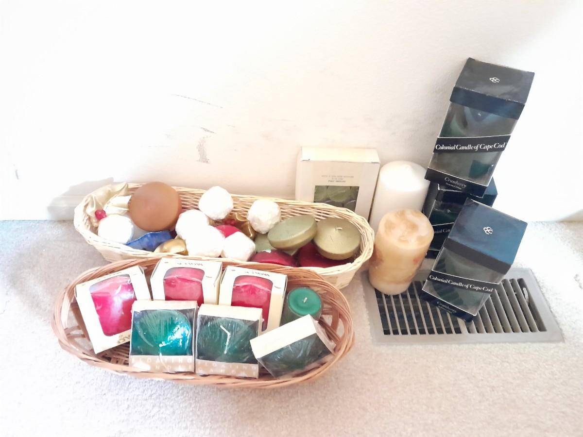 MOSTLY NEW CANDLES, FLOATING CANDLES AND CAPE COD COLONIAL CANDLES AND MANY OTHERS.