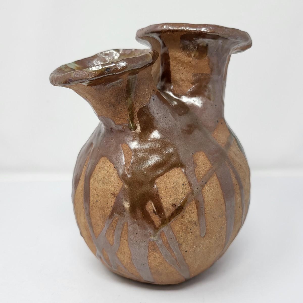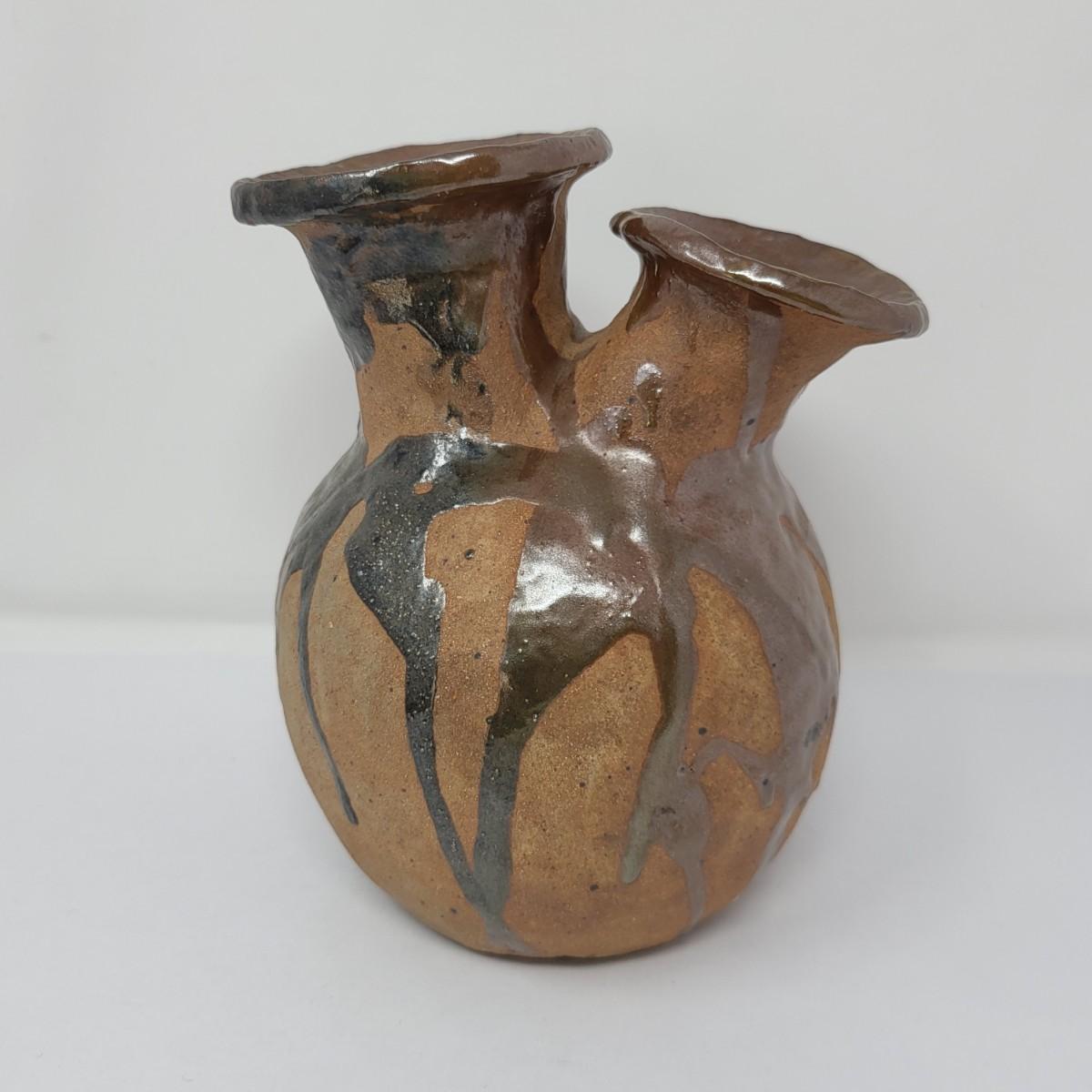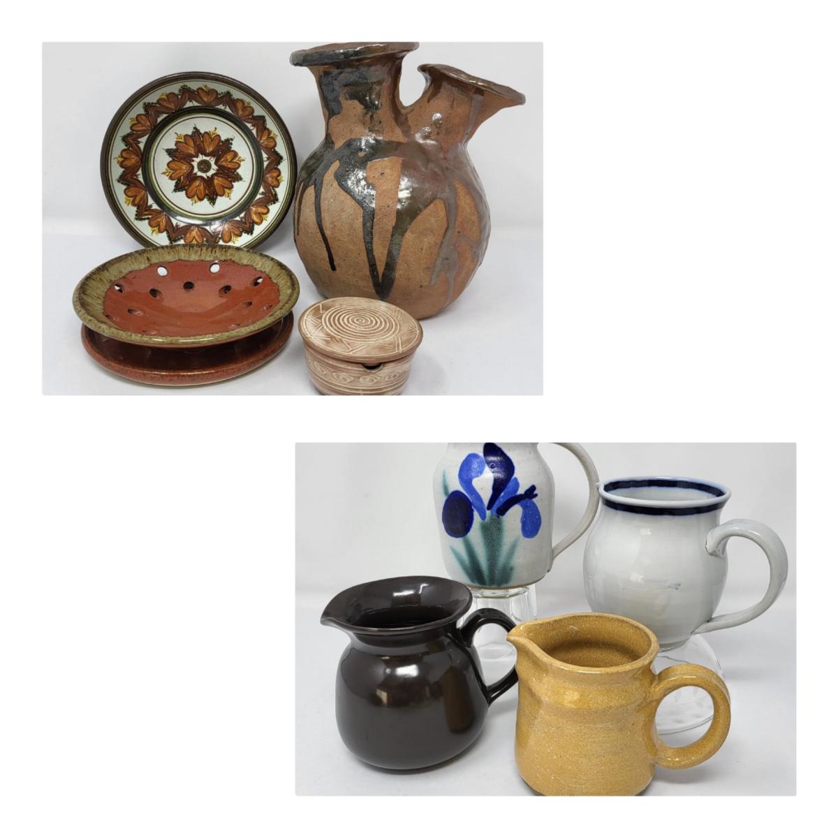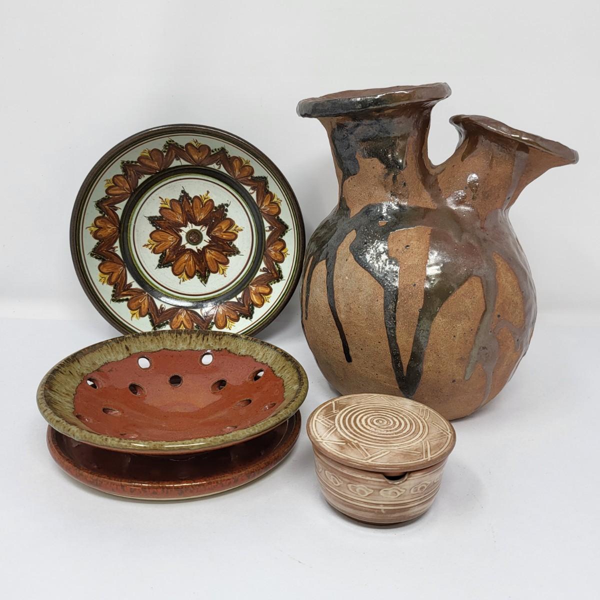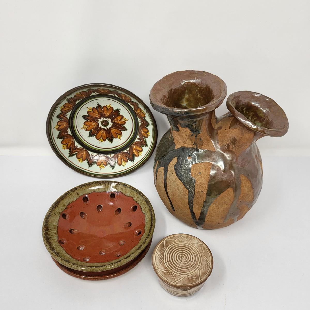 Double vase/jug drip glaze 7" x 6.5". Small round lidded box 2.5" x 1.5". Perforated dish 5.5" diameter. A 6" glazed bowl with heart shape pattern. Four pottery creamer/pitchers ranging in size from 3" tall to 4.75" tall.
